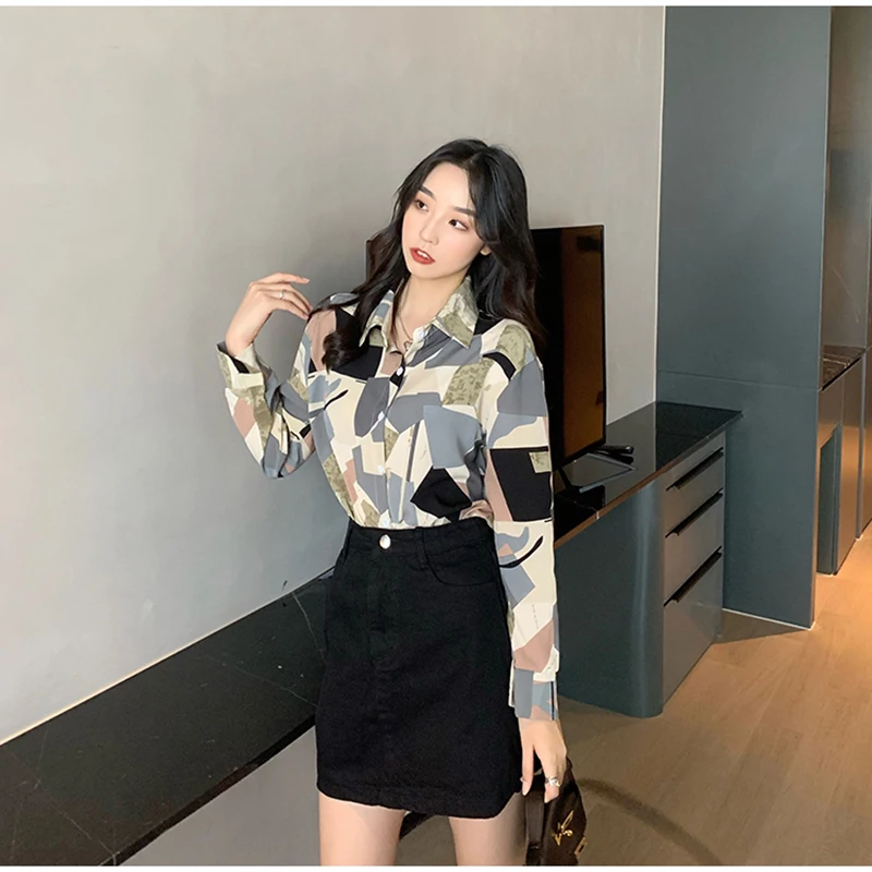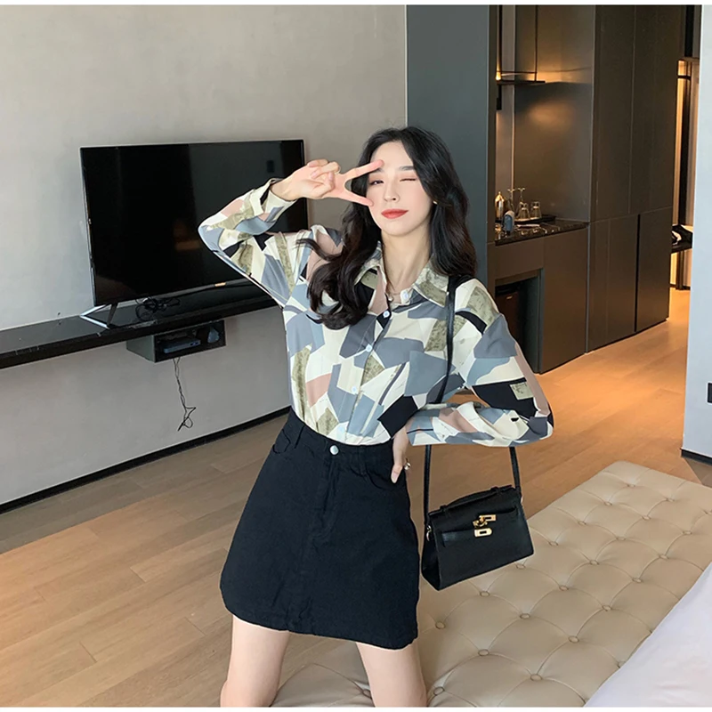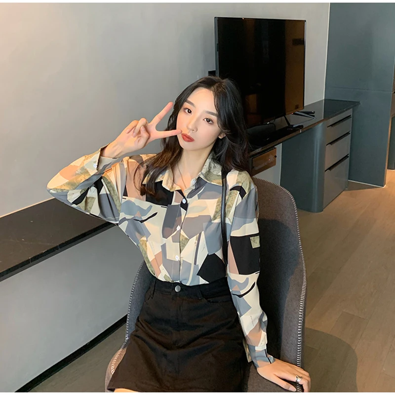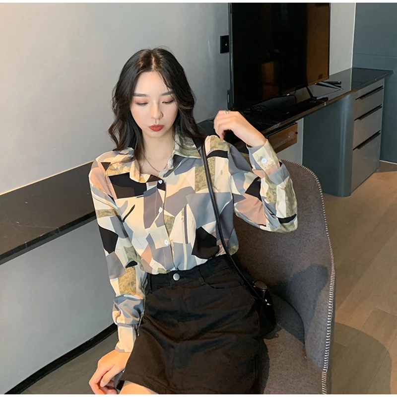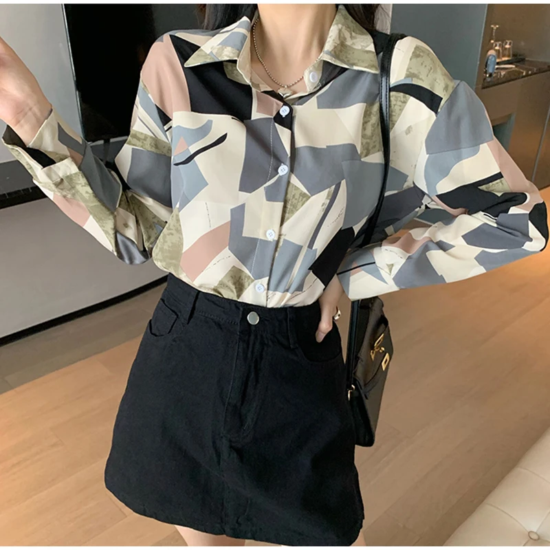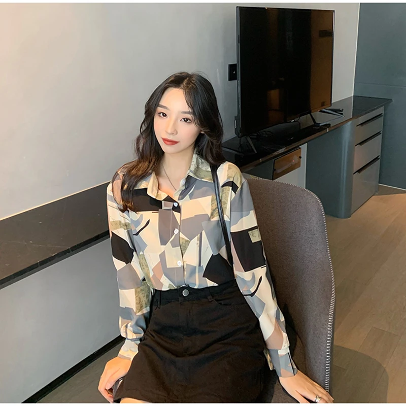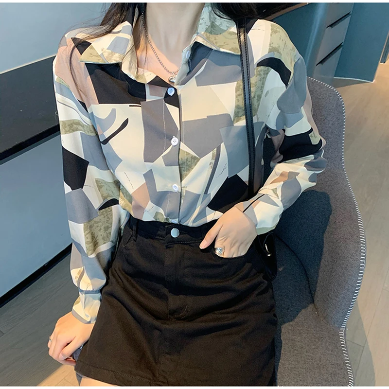 QOERLIN الكورية المرأة طويلة الأكمام الأزهار قميص الرجعية هندسية قميص بلوزة الإناث بدوره إلى أسفل طوق زر حتى