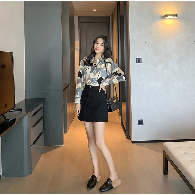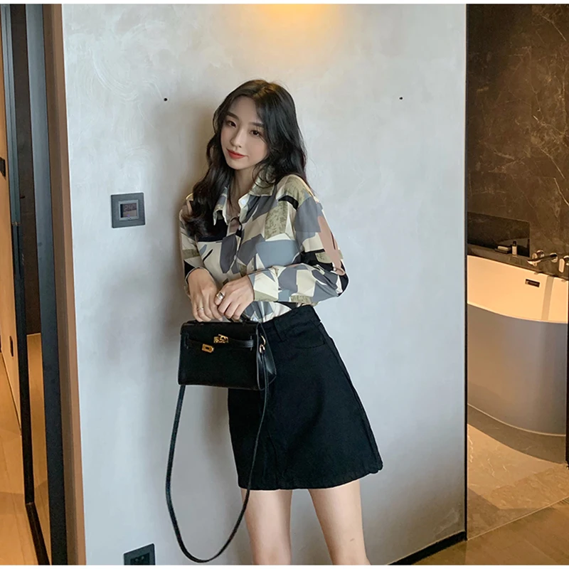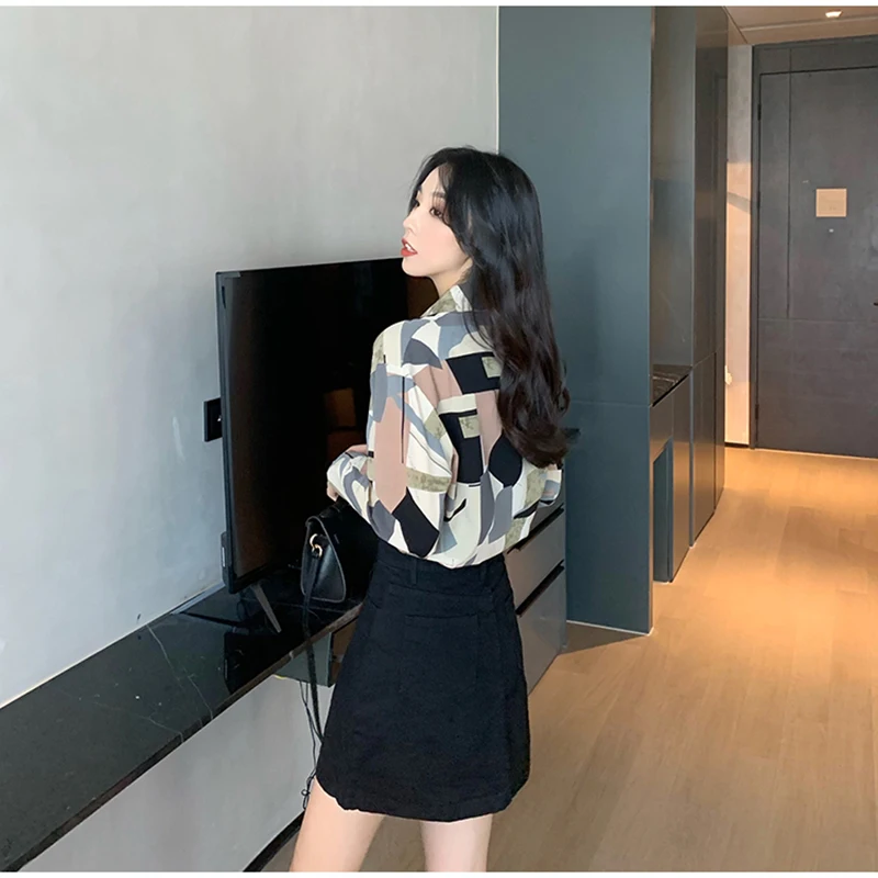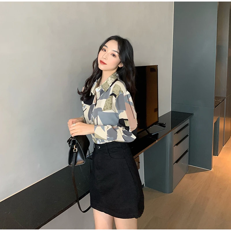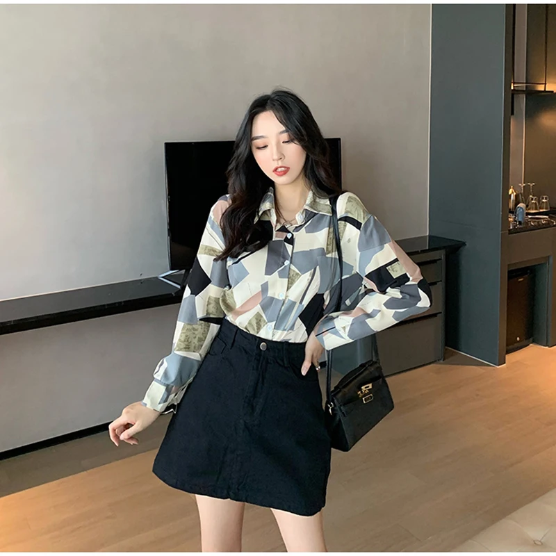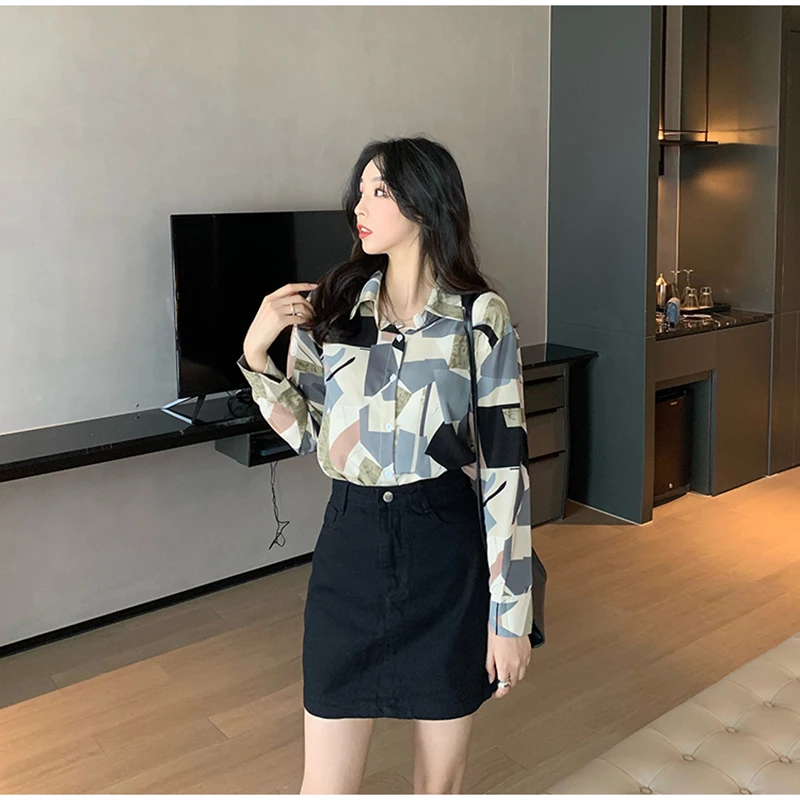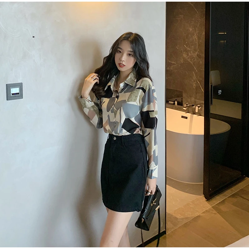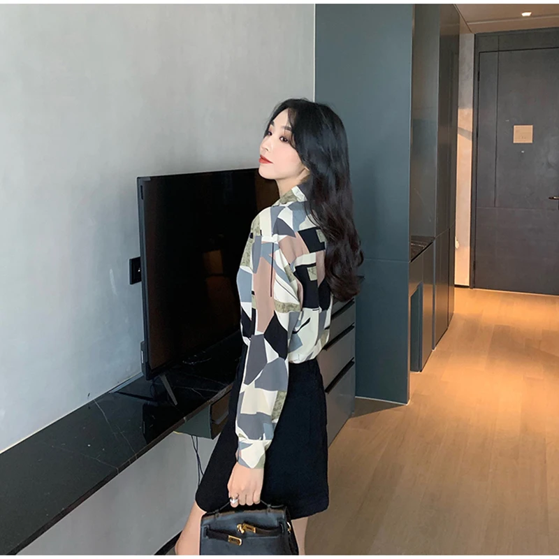 QOERLIN الكورية المرأة طويلة الأكمام الأزهار قميص الرجعية هندسية قميص بلوزة الإناث بدوره إلى أسفل طوق زر حتى