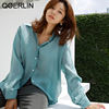 QOERLIN بلوزات بيضاء قميص واحد الصدر امرأة بدوره إلى أسفل طوق طويلة الأكمام أزرار القمم أنيقة أنيقة أنيقة النساء الملابس