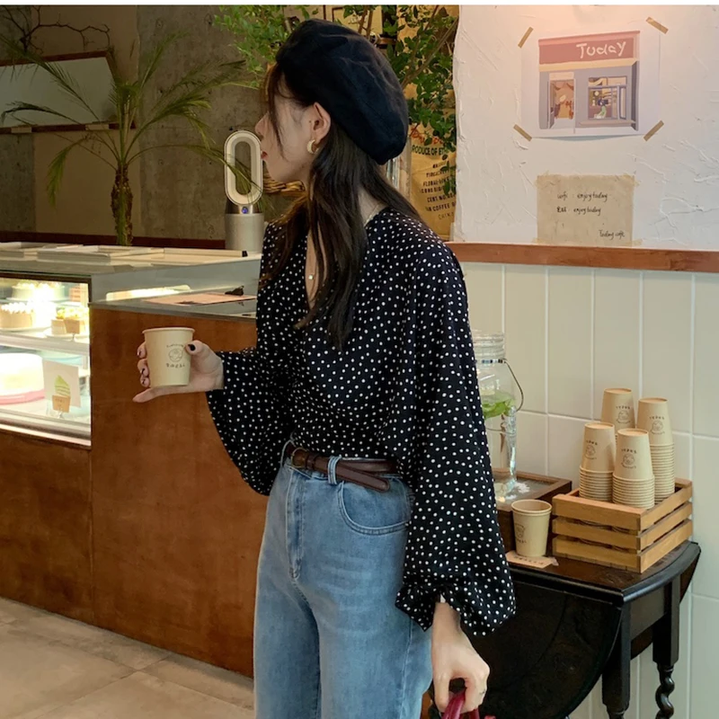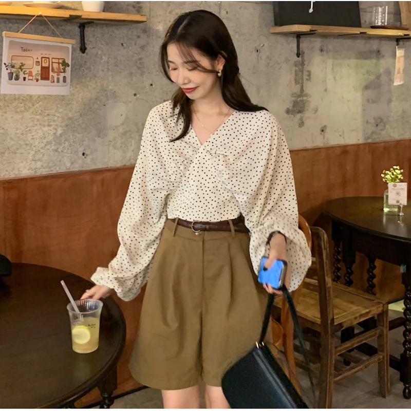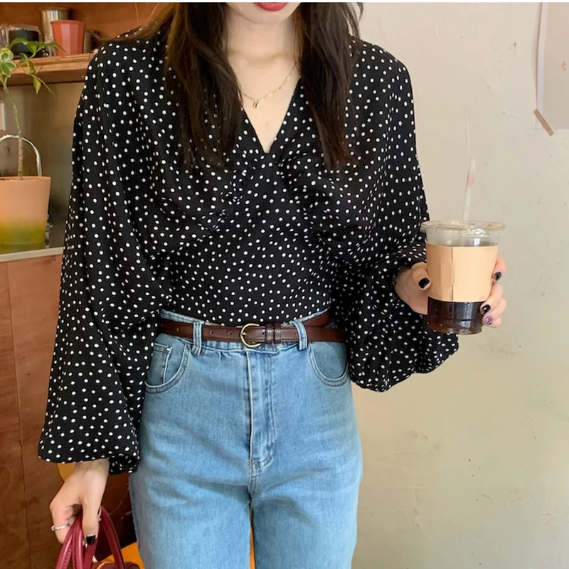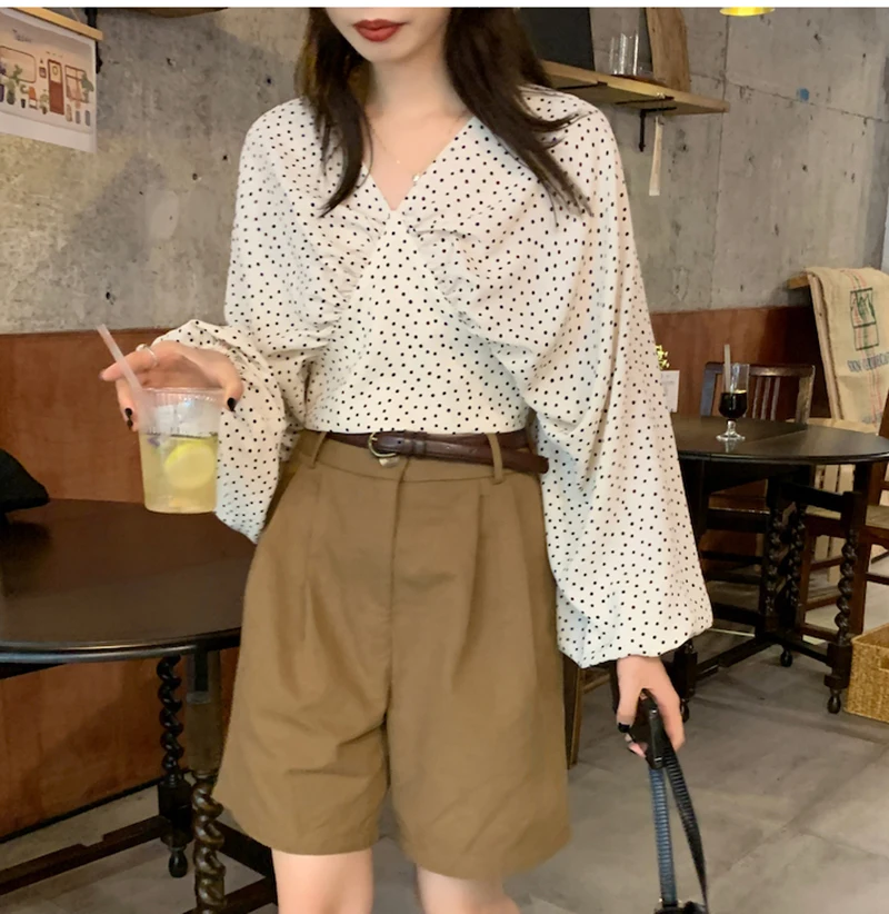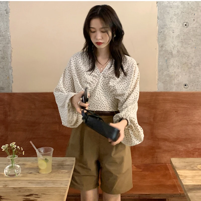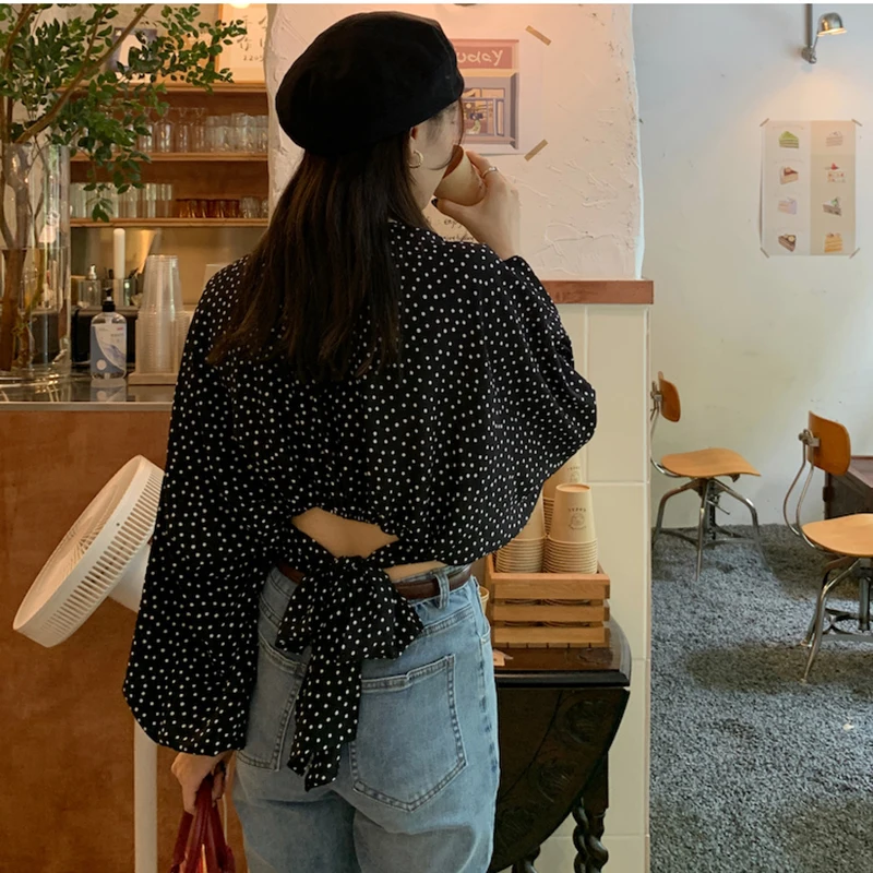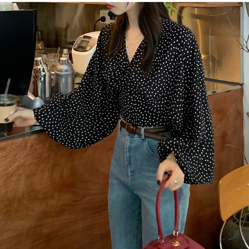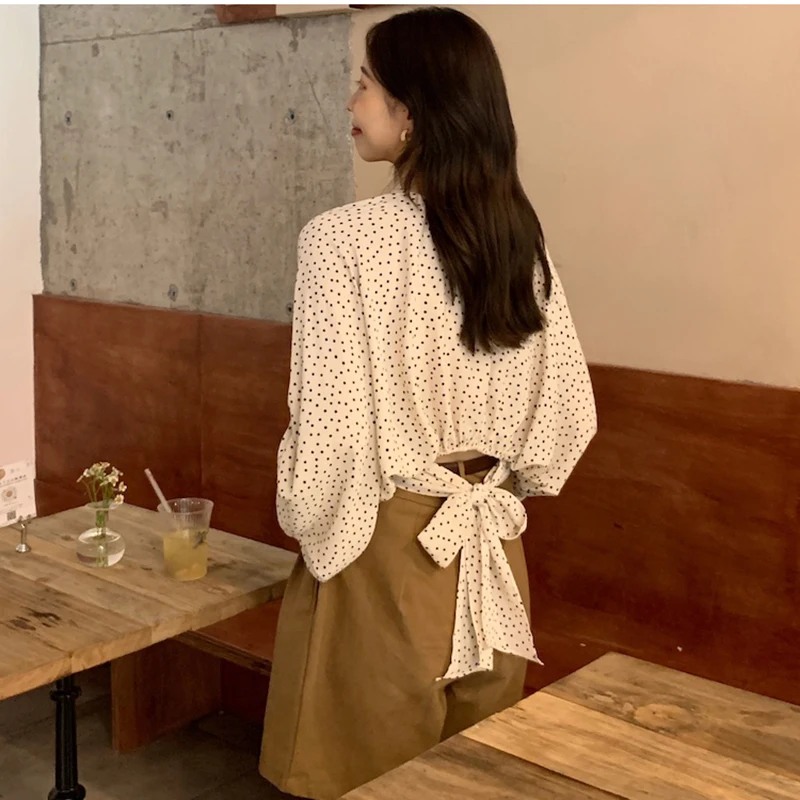 QOERLIN بلوزة سوداء برقبة على شكل V للسيدات قمصان برباط وأكمام طويلة موضة كورية كم فانوس فضفاض أبيض غير رسمي قمصان علوية قصيرة
