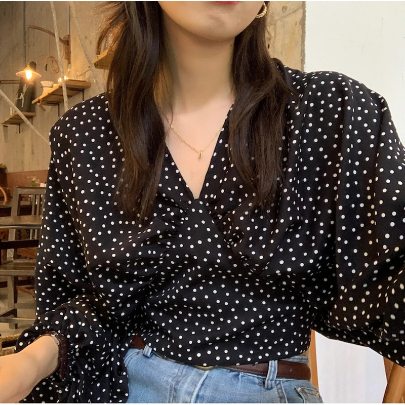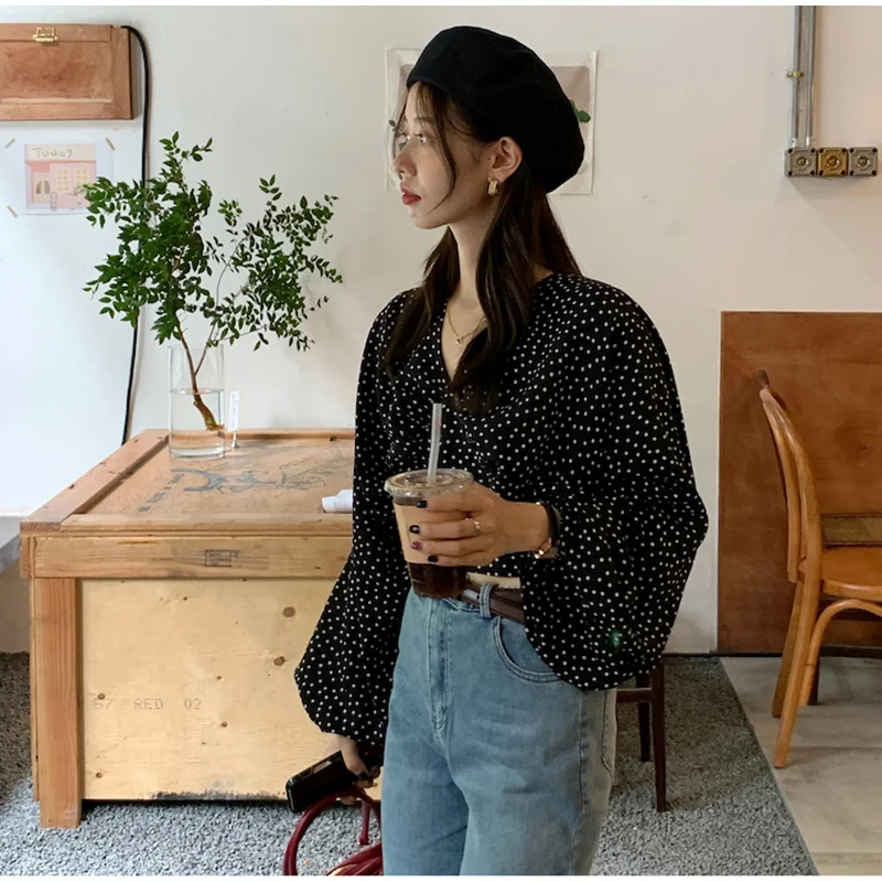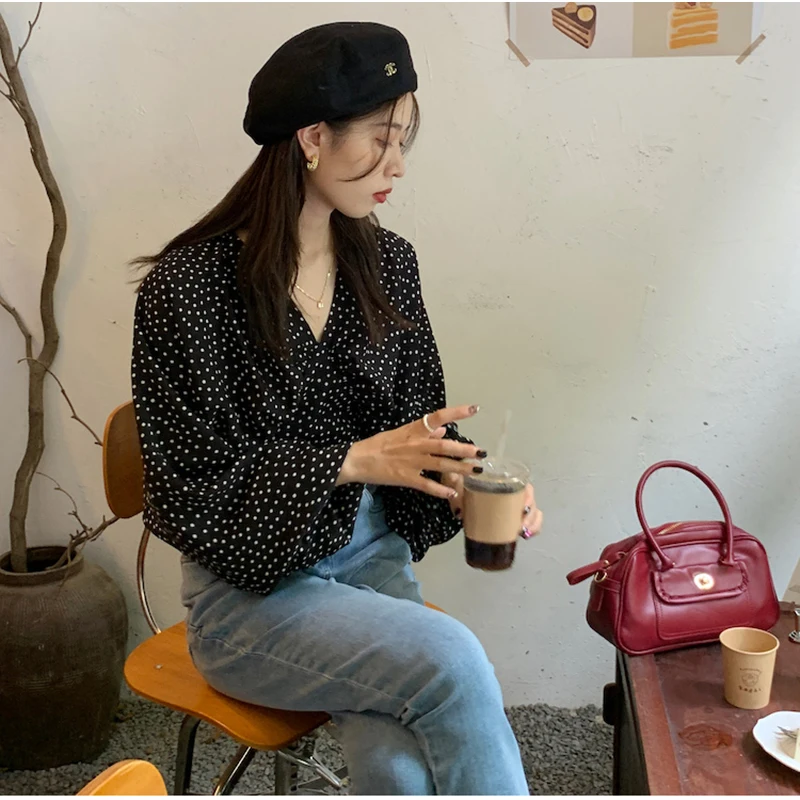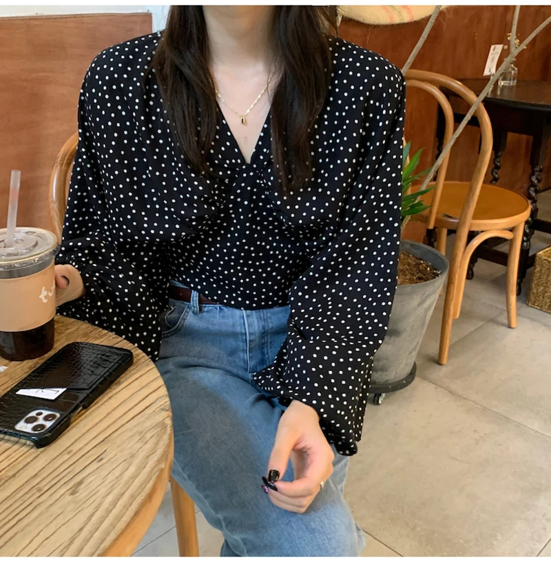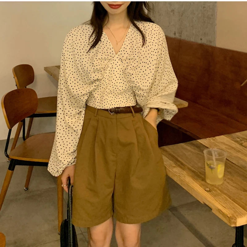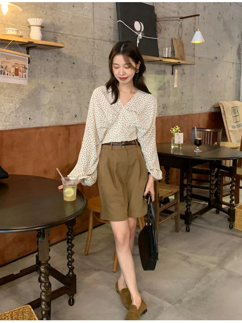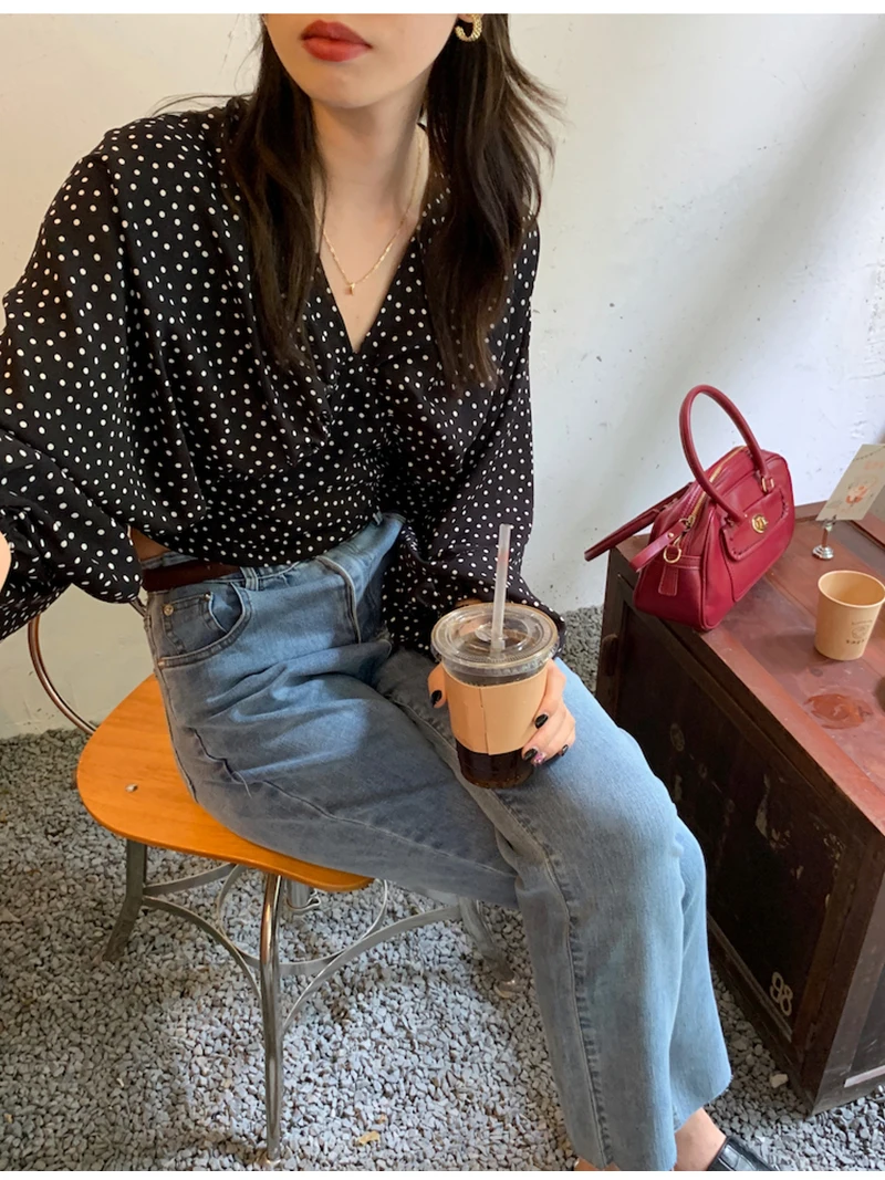 QOERLIN بلوزة سوداء برقبة على شكل V للسيدات قمصان برباط وأكمام طويلة موضة كورية كم فانوس فضفاض أبيض غير رسمي قمصان علوية قصيرة