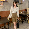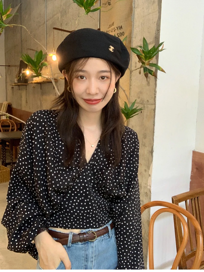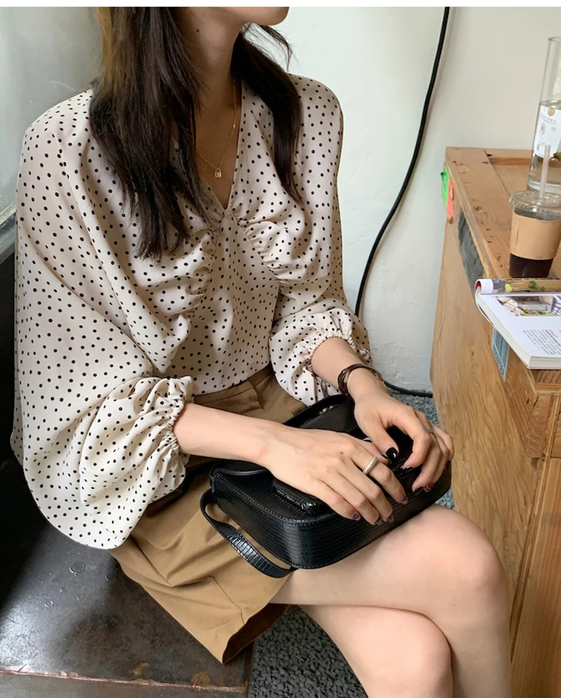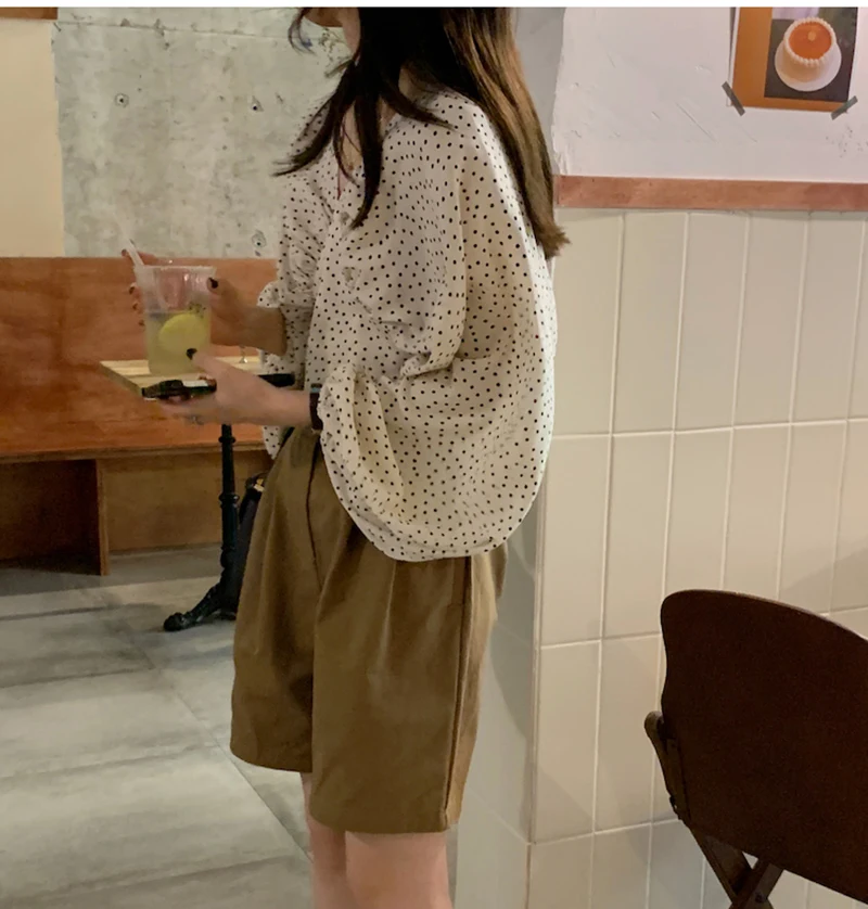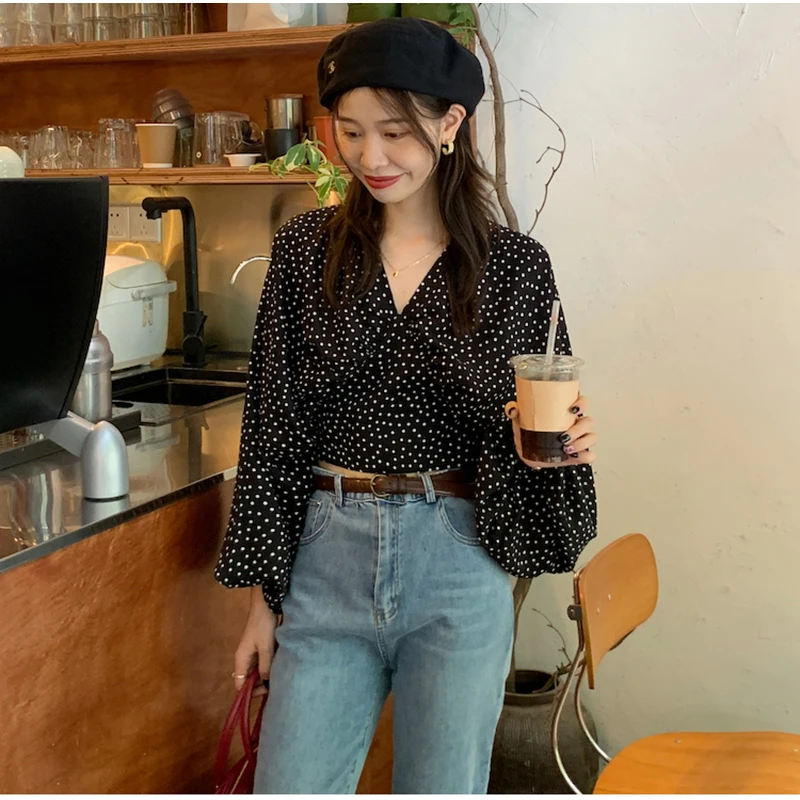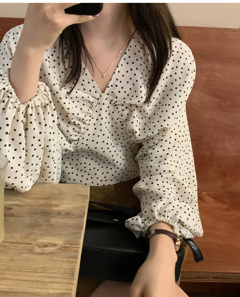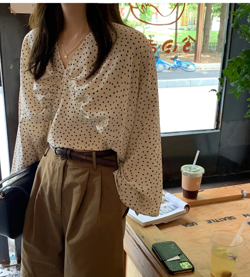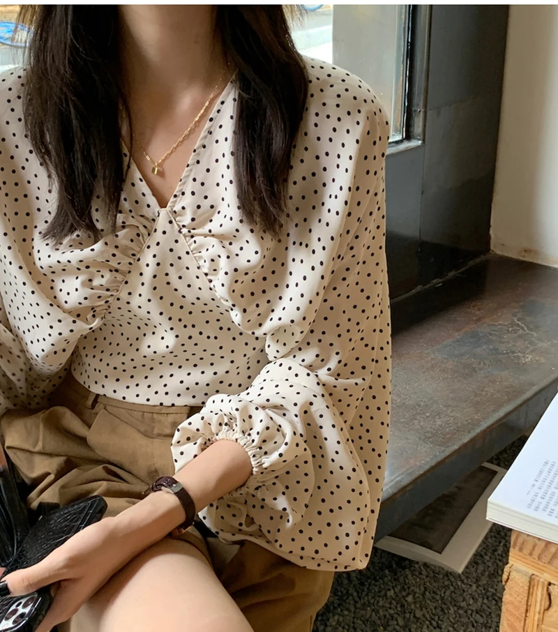 QOERLIN بلوزة سوداء برقبة على شكل V للسيدات قمصان برباط وأكمام طويلة موضة كورية كم فانوس فضفاض أبيض غير رسمي قمصان علوية قصيرة