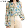 QOERLIN بلوزة و قميص قصير 2 قطعة بلايز س الرقبة الدانتيل يصل بلوزات أنيقة قمصان طويلة الأكمام نفخة كم الربيع الخريف قميص الموضة