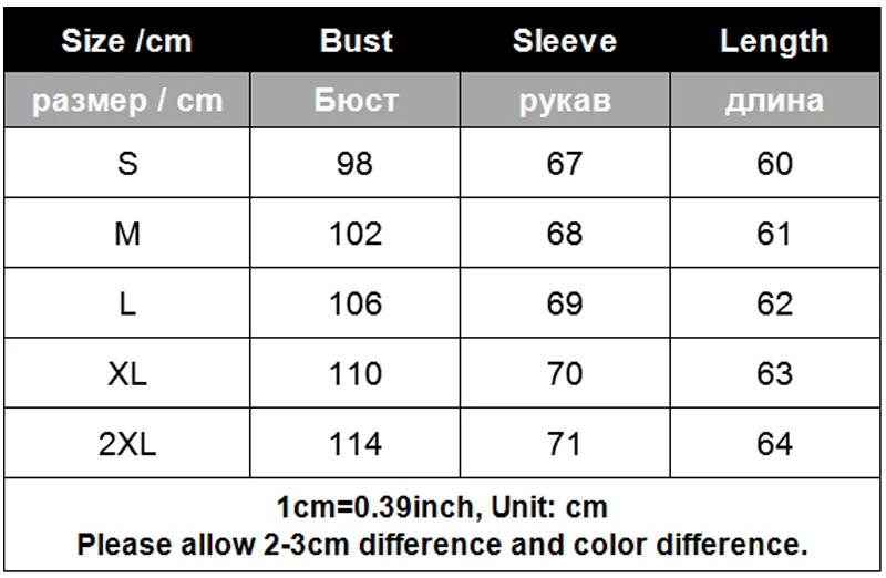 الحجمعرض الصدر (سم)طول الأكمام الكتف (سم)الجسم طول