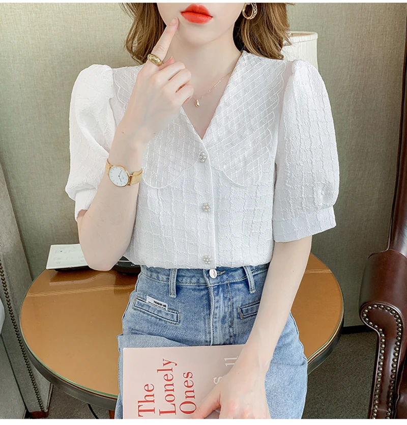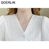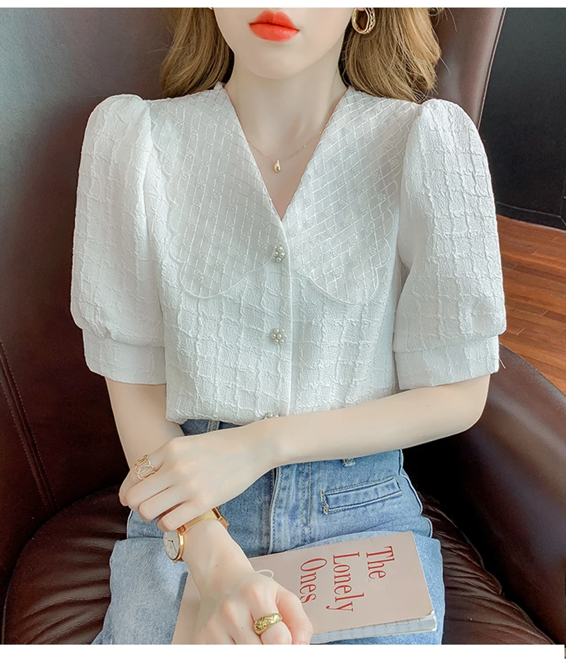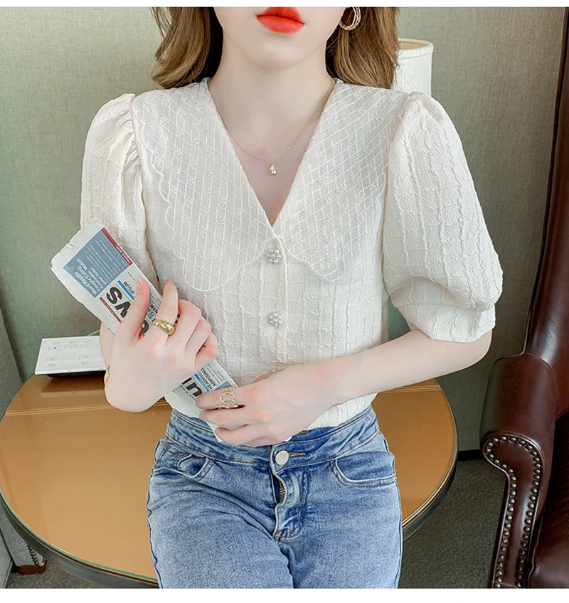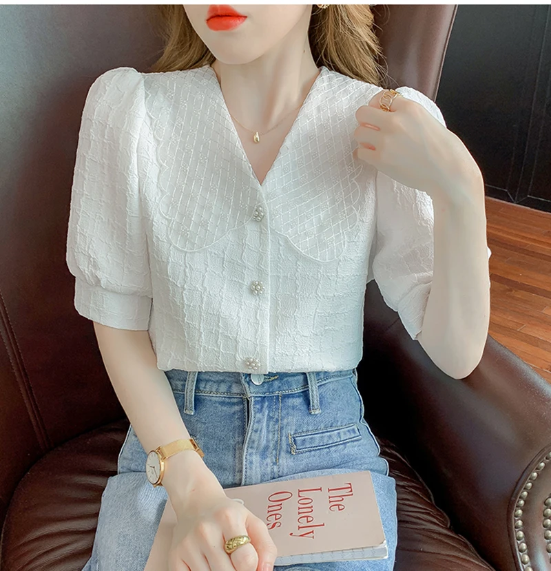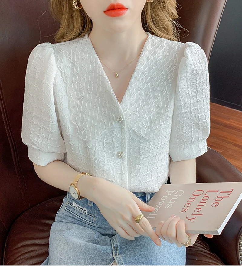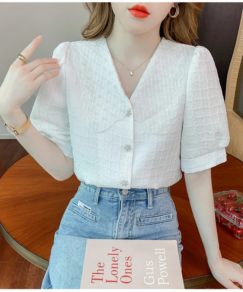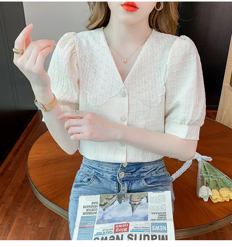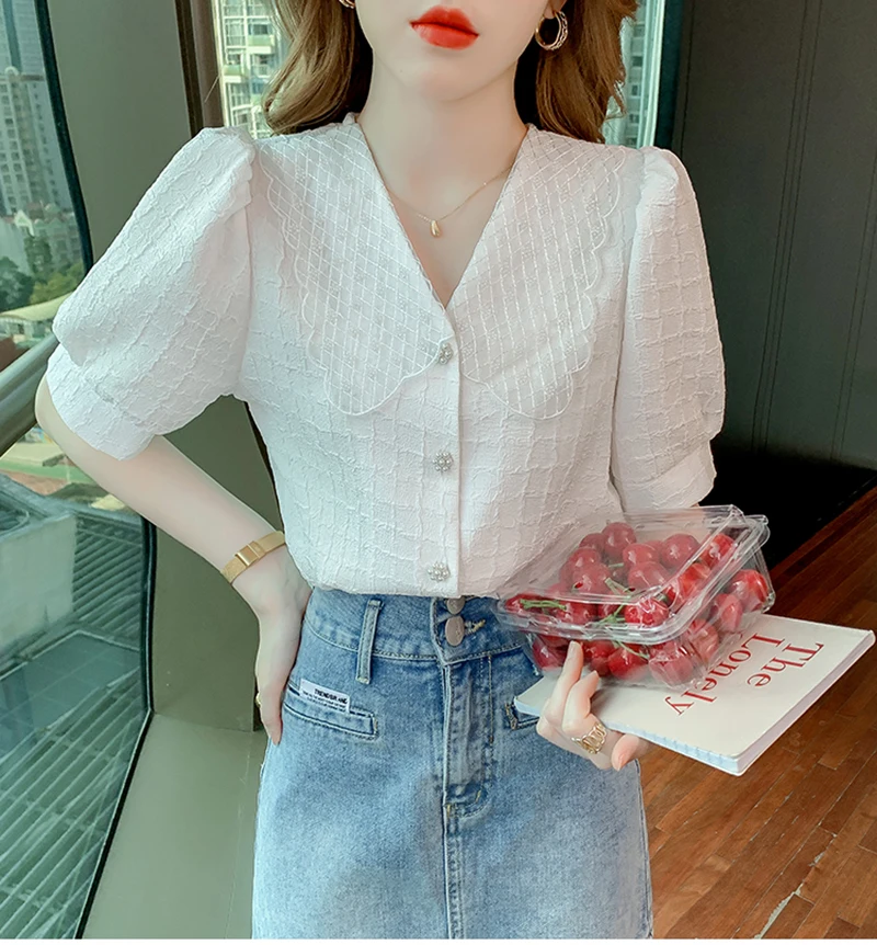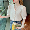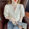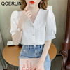 QOERLIN تصميم الرقبة الخامس بلوزة بيضاء الصيف نفخة قصيرة الأكمام واحدة الصدر سليم صالح القمم قمصان خمر أنيقة الكورية الموضة