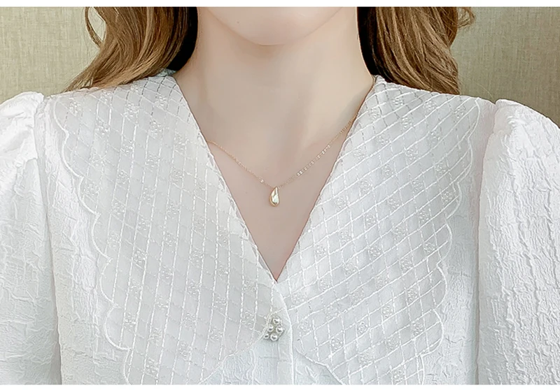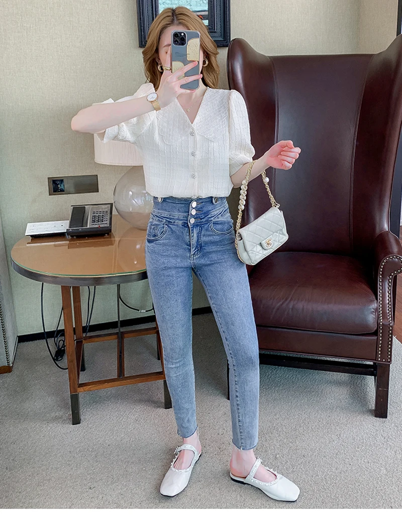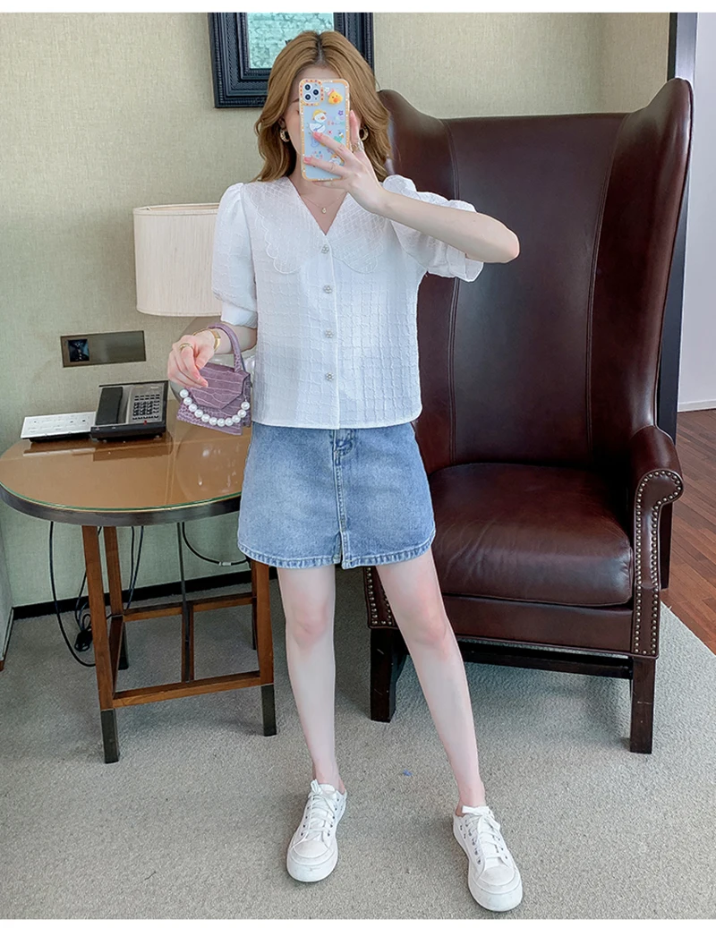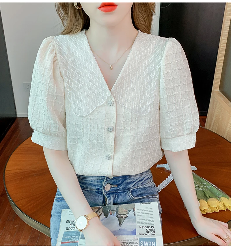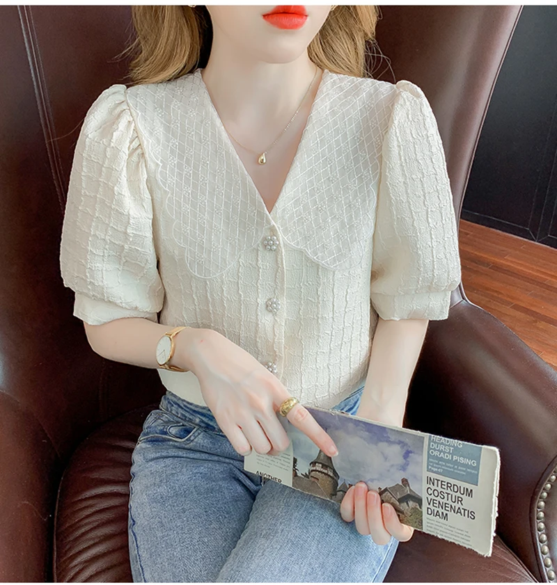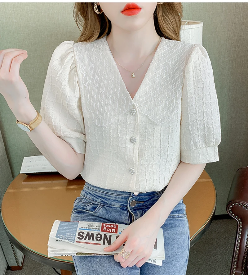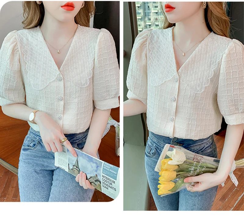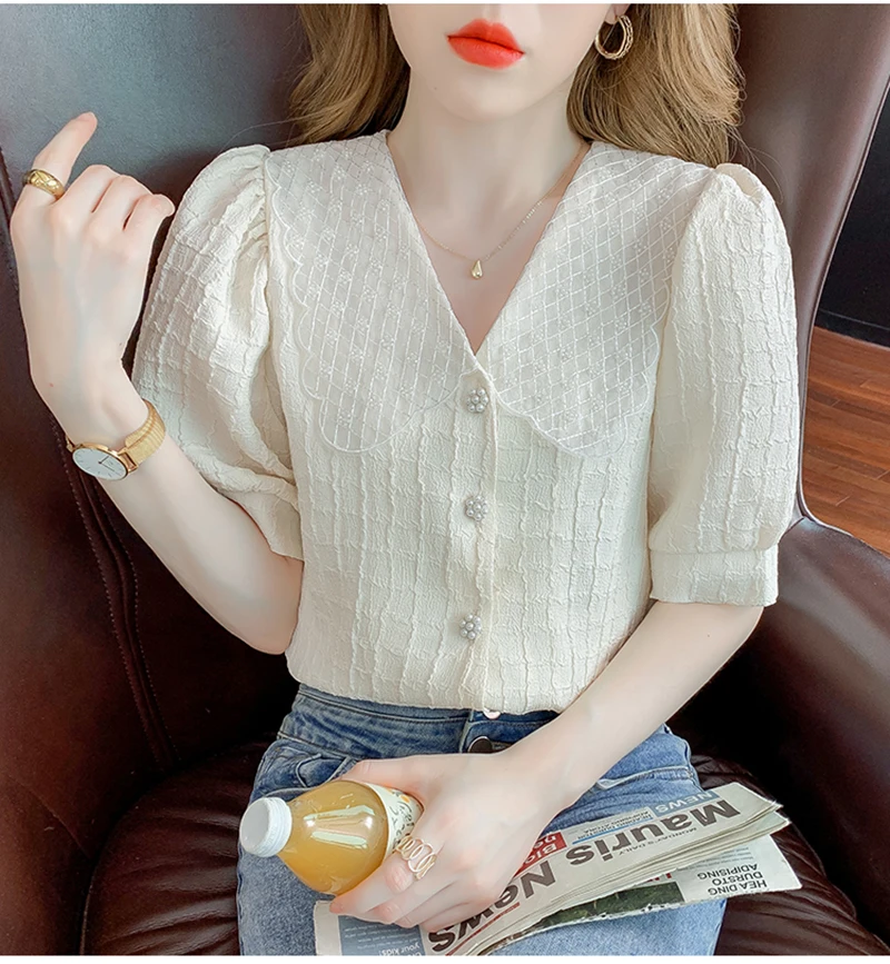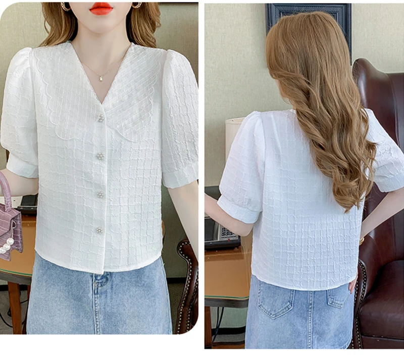QOERLIN تصميم الرقبة الخامس بلوزة بيضاء الصيف نفخة قصيرة الأكمام واحدة الصدر سليم صالح القمم قمصان خمر أنيقة الكورية الموضة