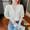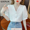 QOERLIN تصميم الرقبة الخامس بلوزة بيضاء الصيف نفخة قصيرة الأكمام واحدة الصدر سليم صالح القمم قمصان خمر أنيقة الكورية الموضة