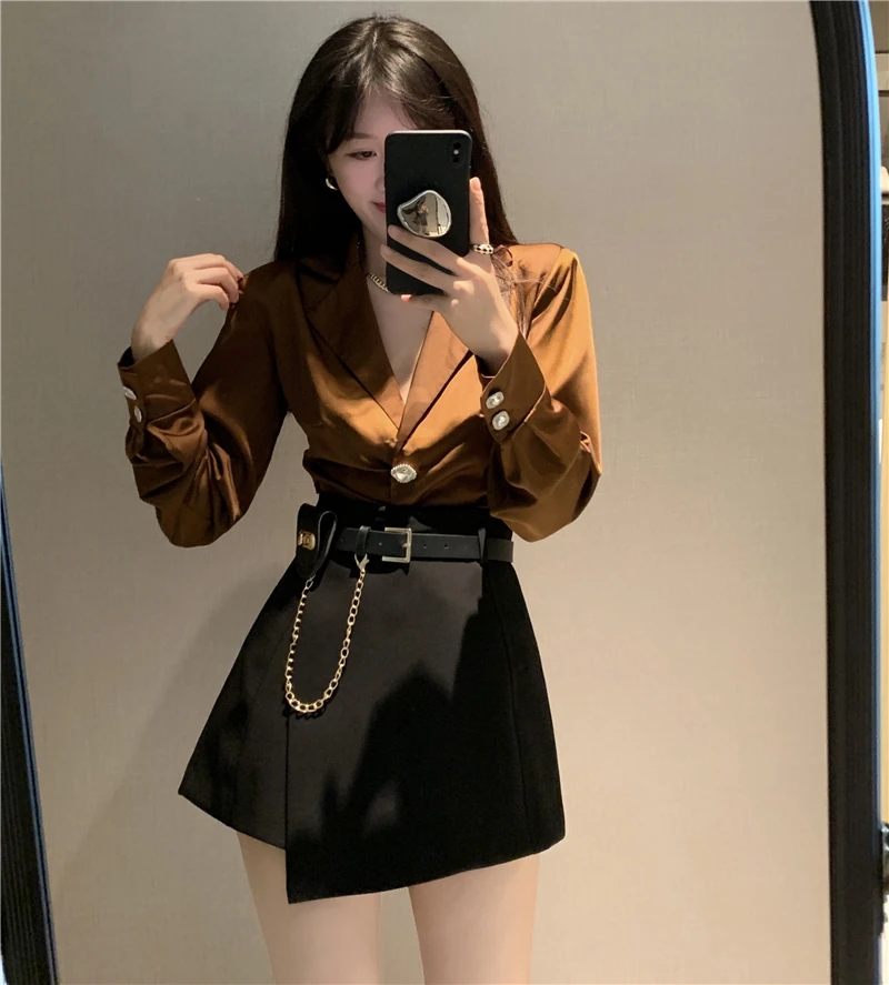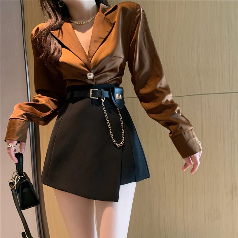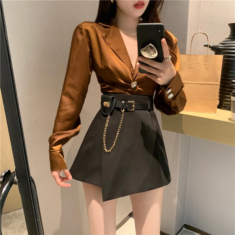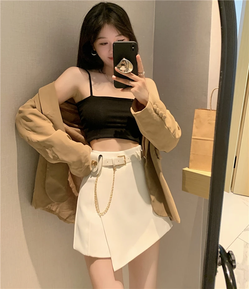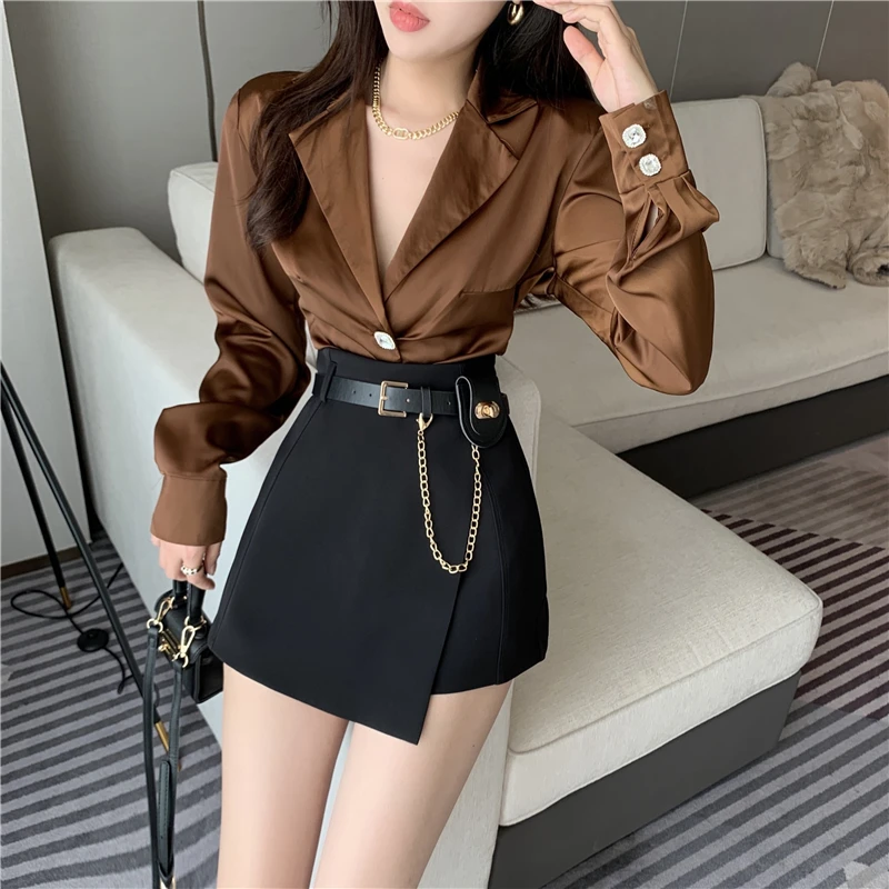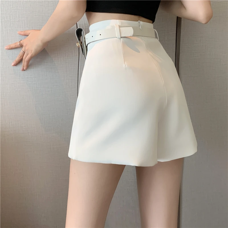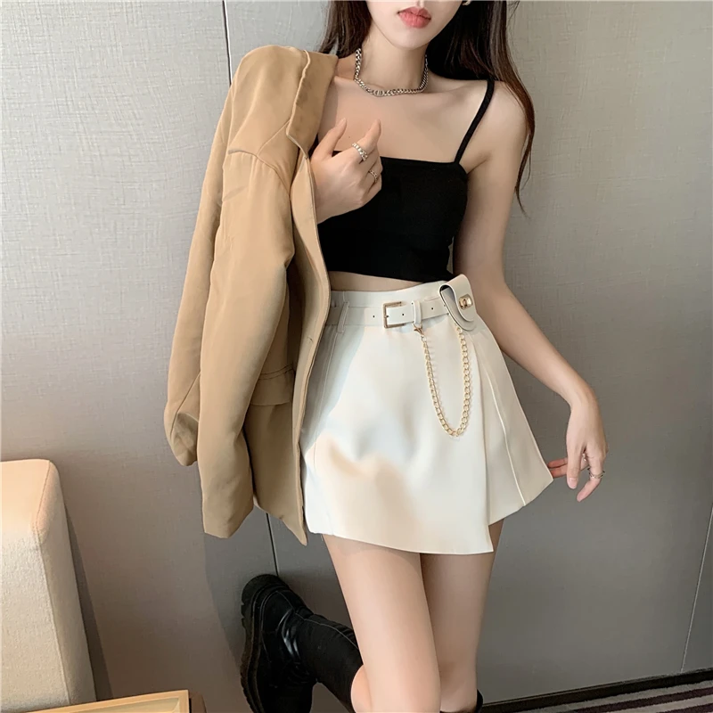 QOERLIN سراويل مربوط النساء عالية الخصر التنانير غير النظامية السراويل الإناث الدعاوى السوداء التنانير مكتب أنيق سروال نسائي قصير