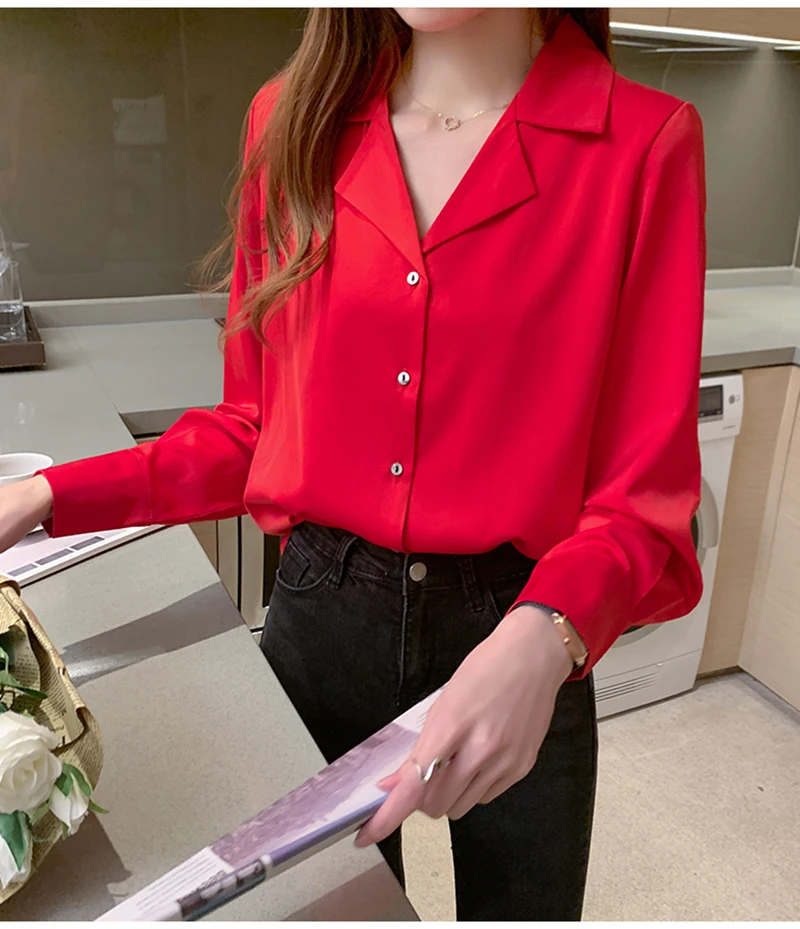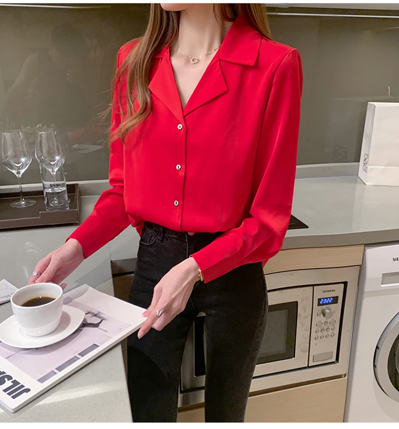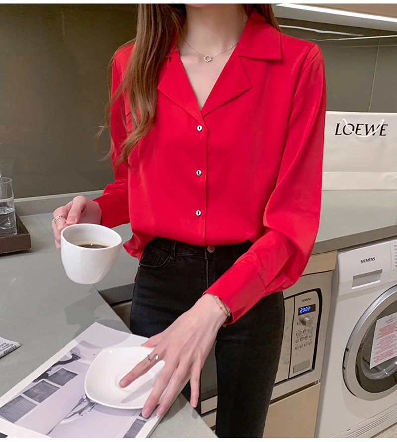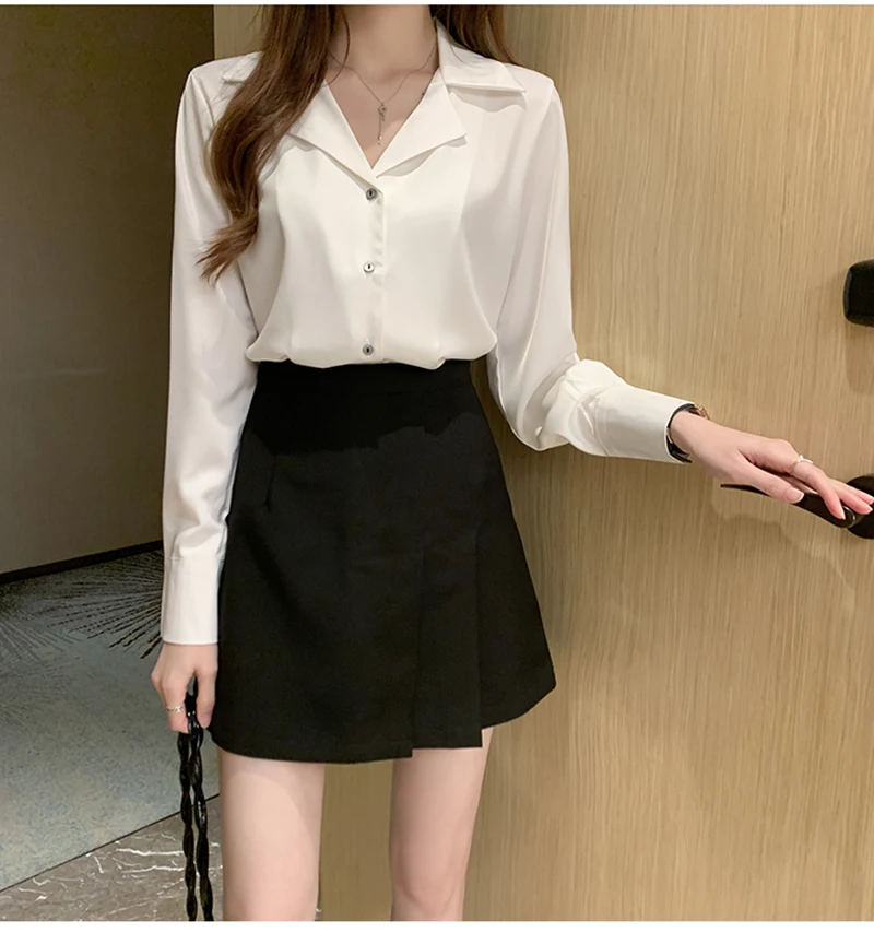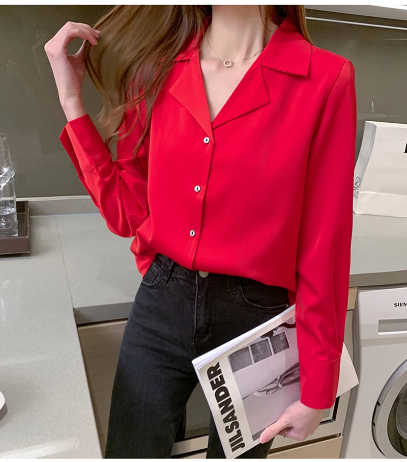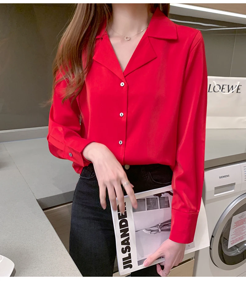 QOERLIN موضة قمصان بيضاء الحرير النساء البلوزات مكتب سيدة الساتان بلوزة طويلة الأكمام بلوزة OL دعوى طوق بلوزات السيدات عادية