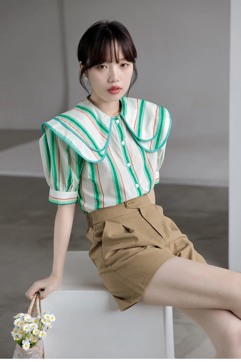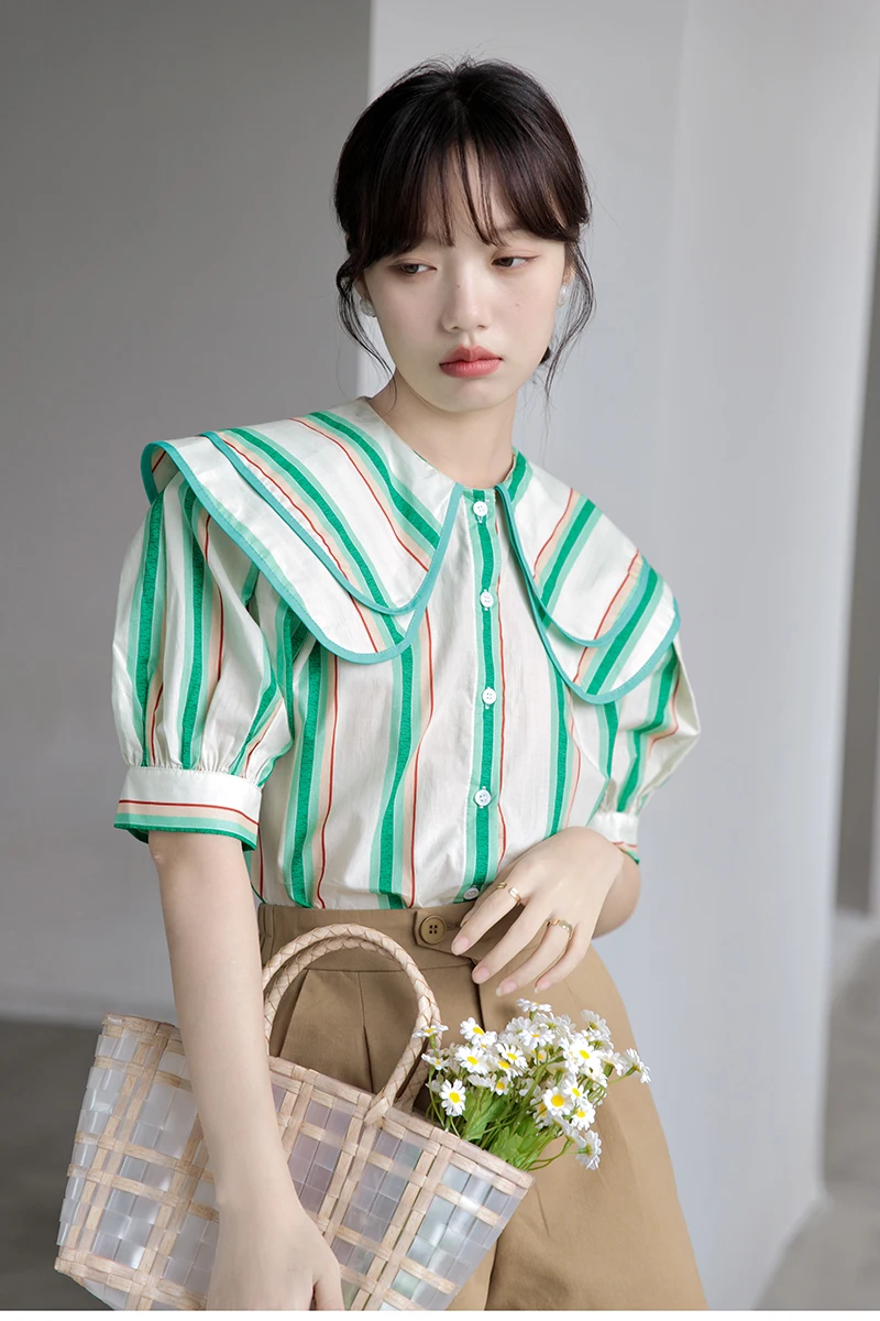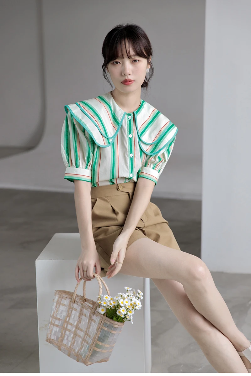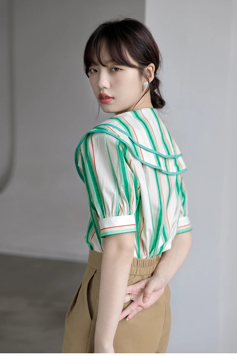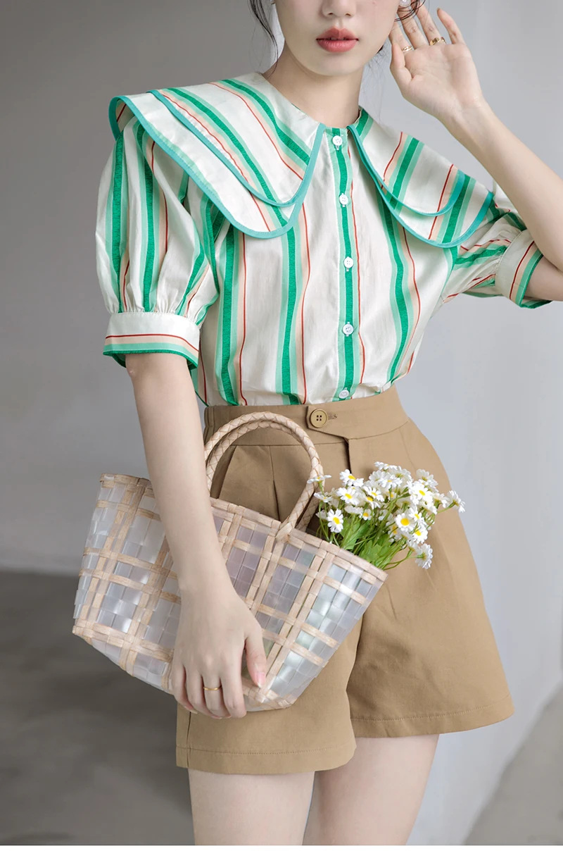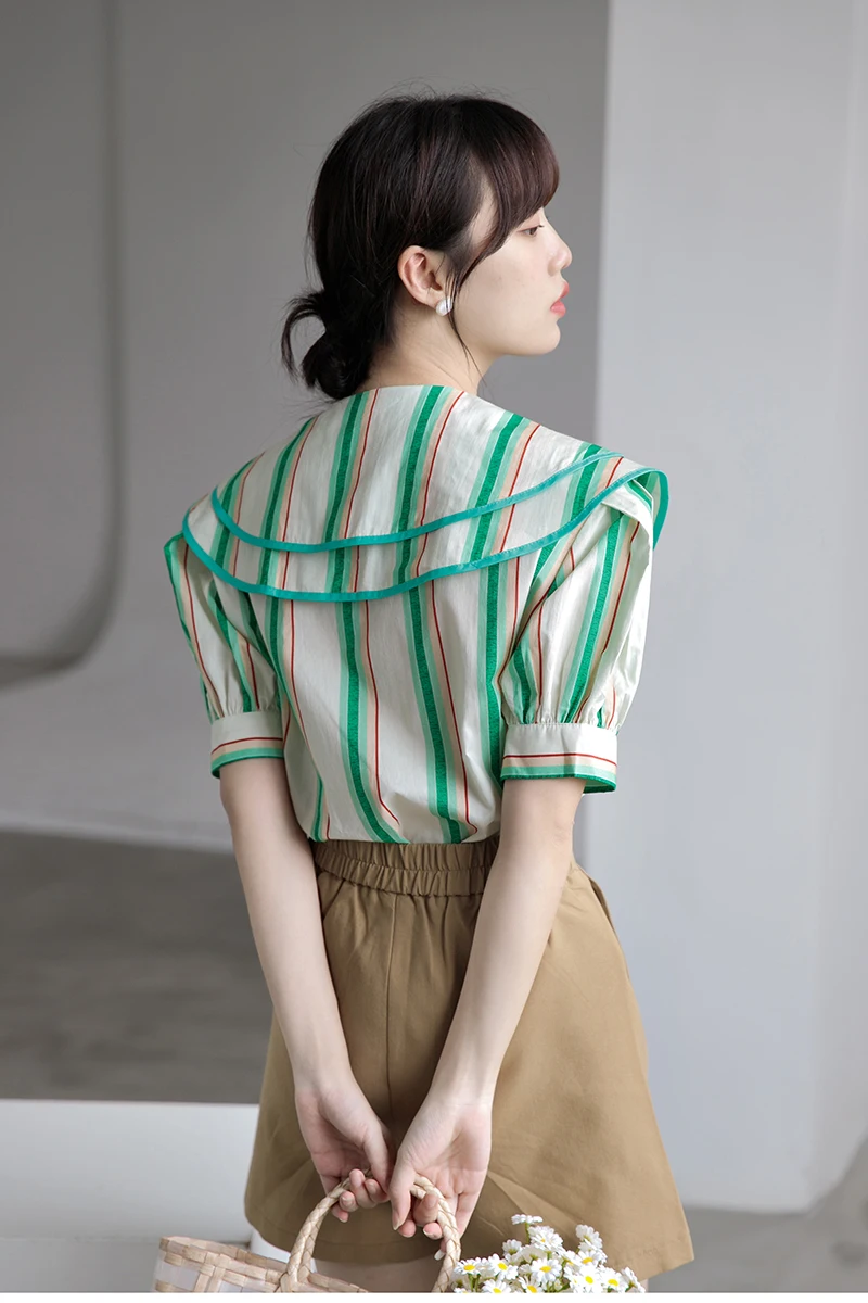 QOERLIN 2022 الصيف بلوزة شيفون قصيرة الأكمام النساء قمصان كبيرة بدوره إلى أسفل طوق فضفاض واحدة الصدر الأخضر مخطط القمم قميص