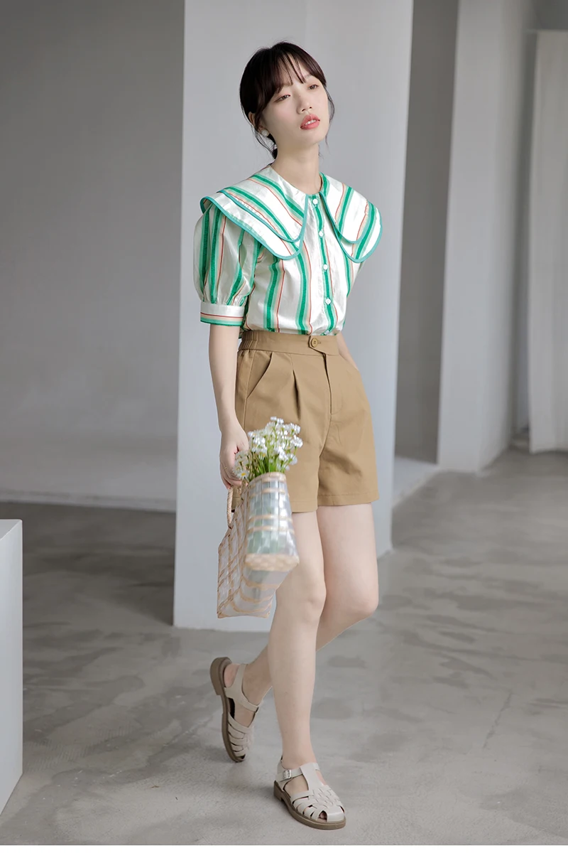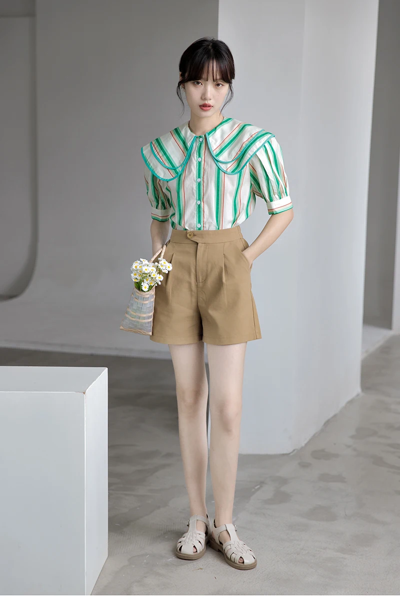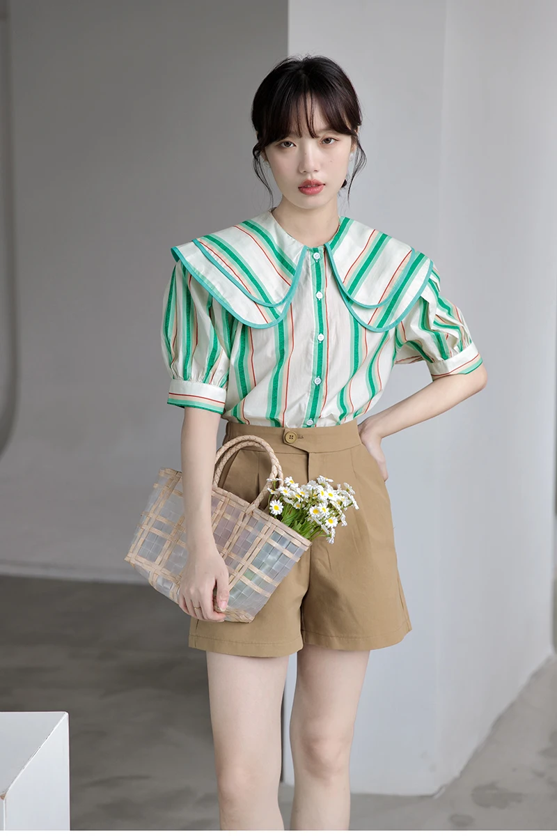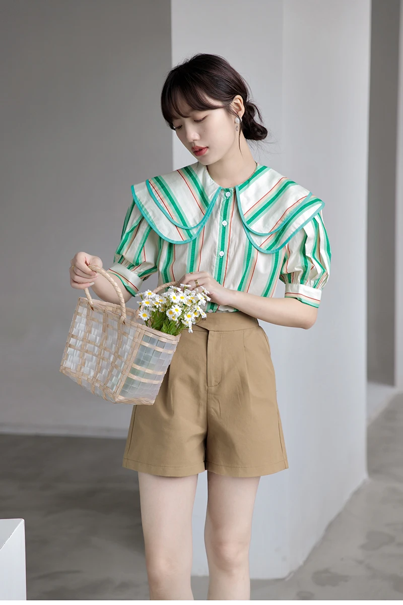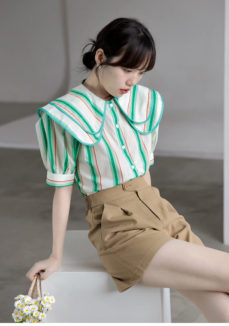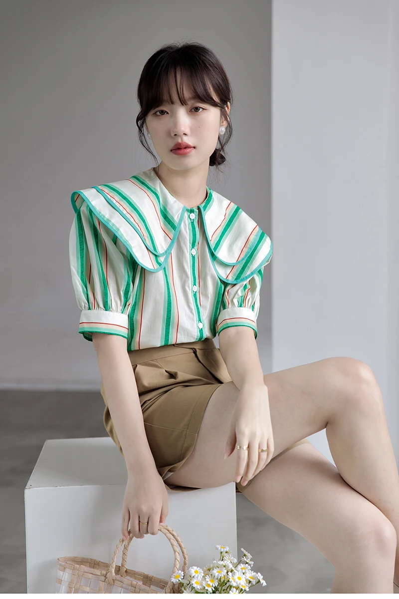 QOERLIN 2022 الصيف بلوزة شيفون قصيرة الأكمام النساء قمصان كبيرة بدوره إلى أسفل طوق فضفاض واحدة الصدر الأخضر مخطط القمم قميص