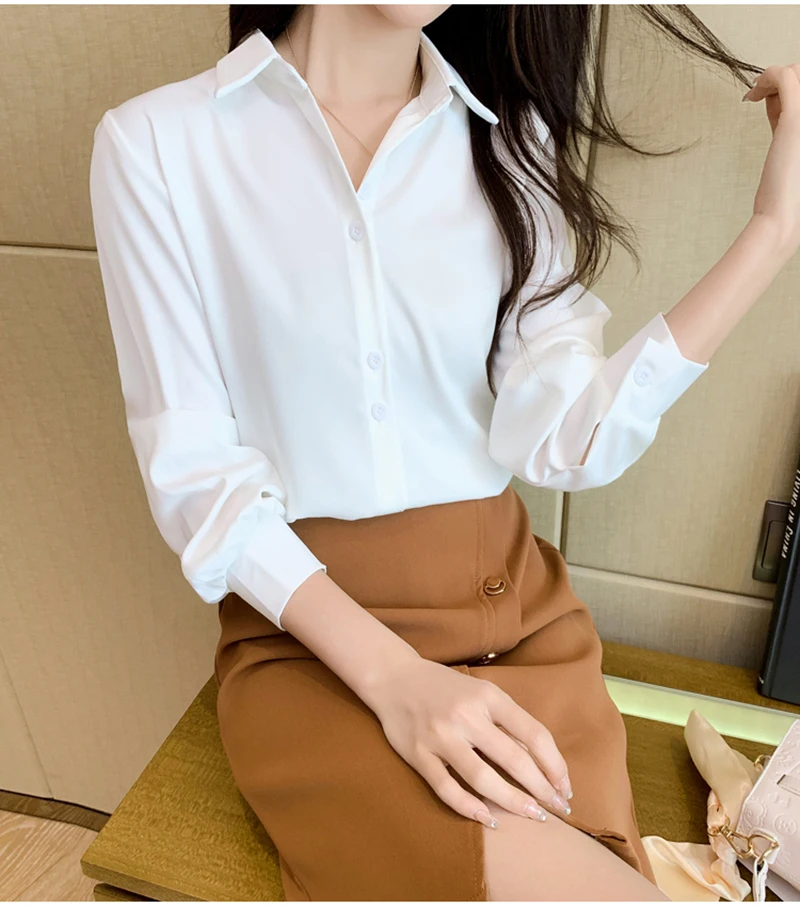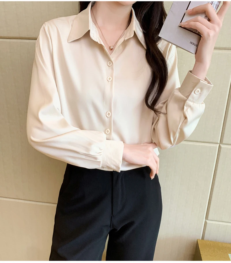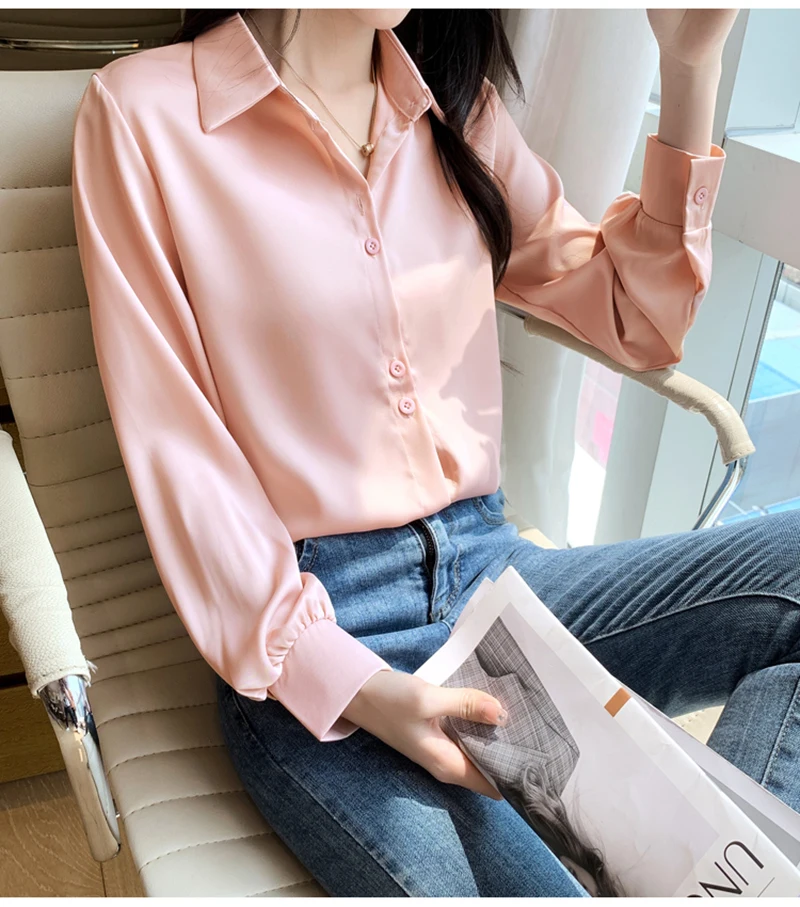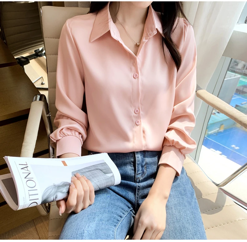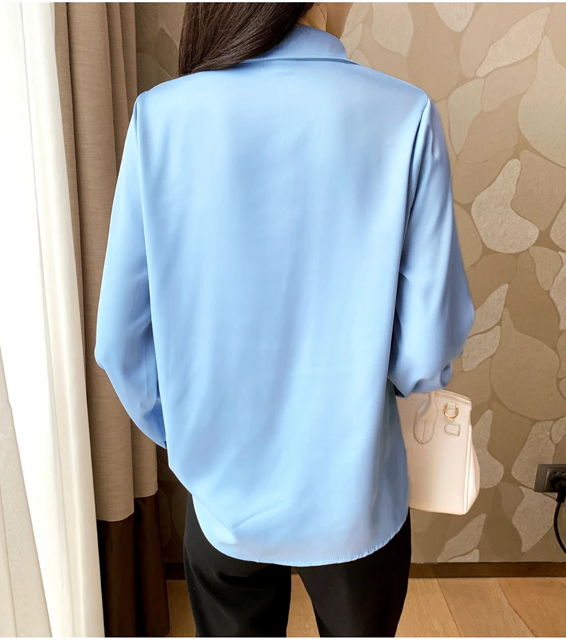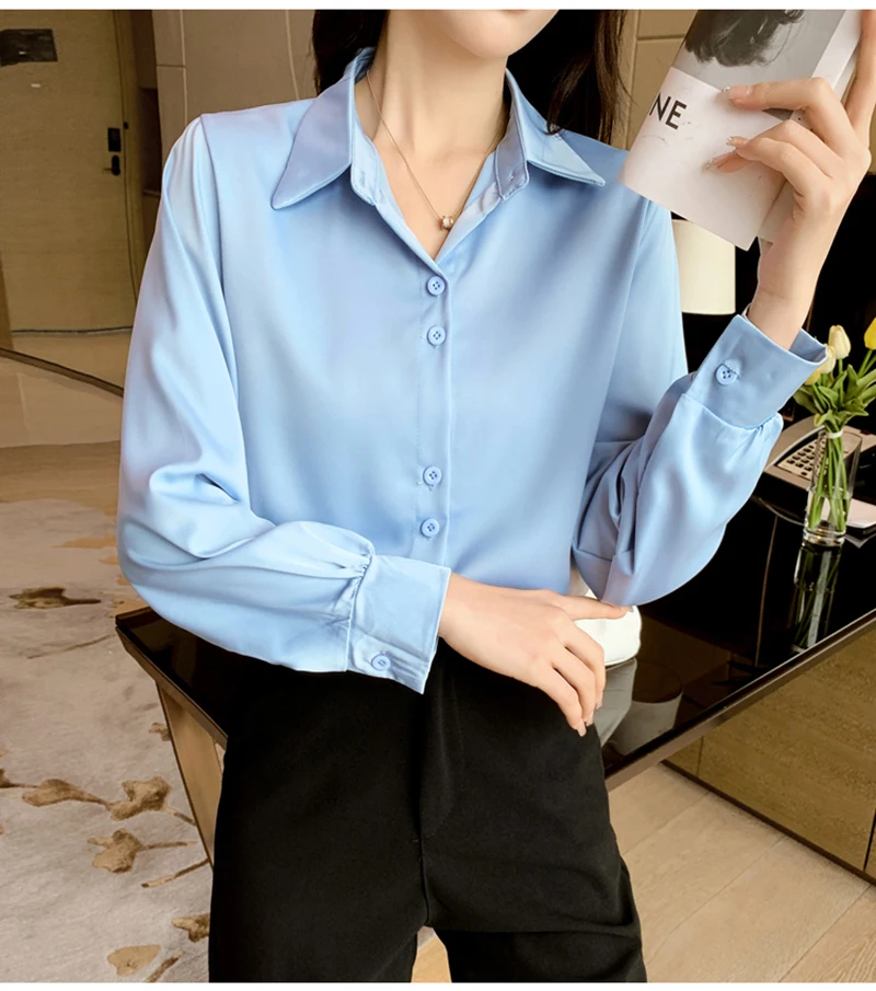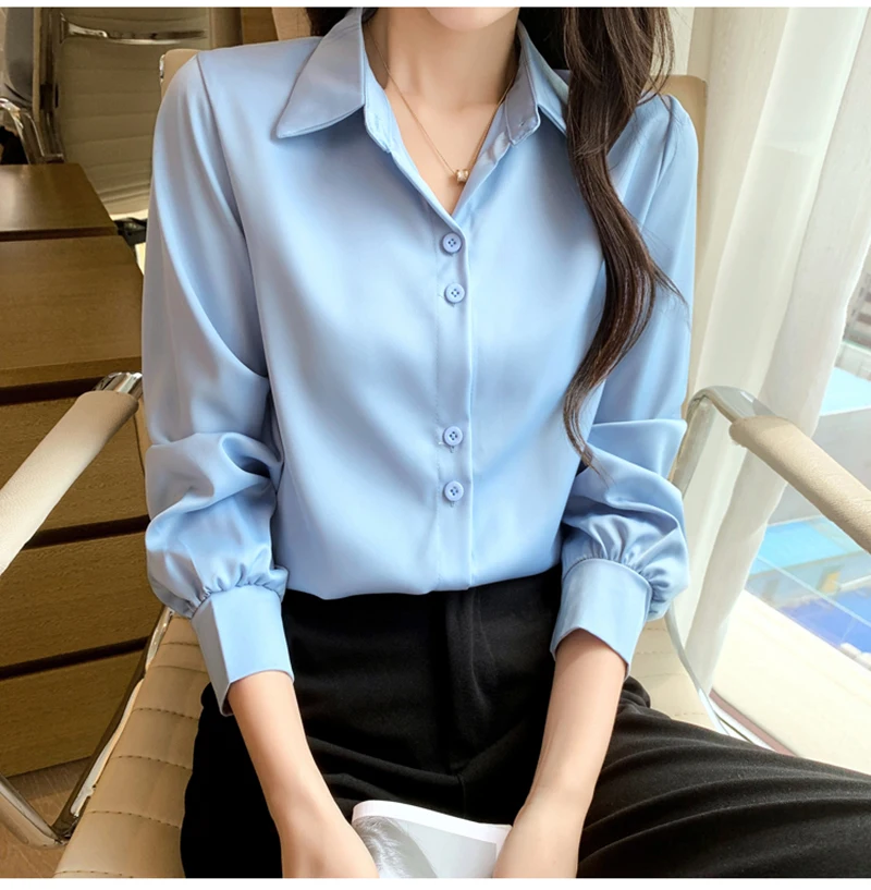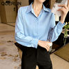 QOERLIN S-4XL المرأة زر أبيض حتى قمصان طويلة الأكمام بدوره إلى أسفل مكتب بلايز قمصان بلوزة الأزرق ملابس العمل الساتان Blusas