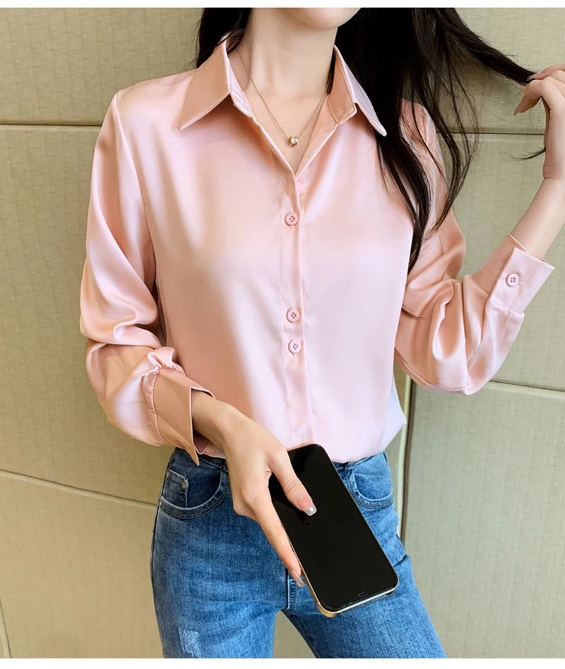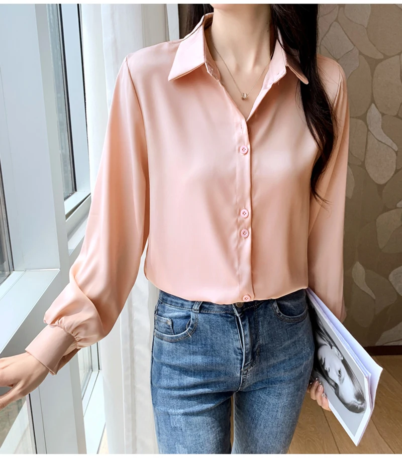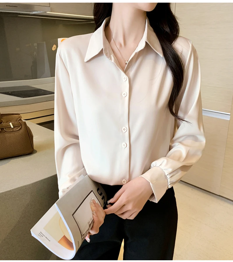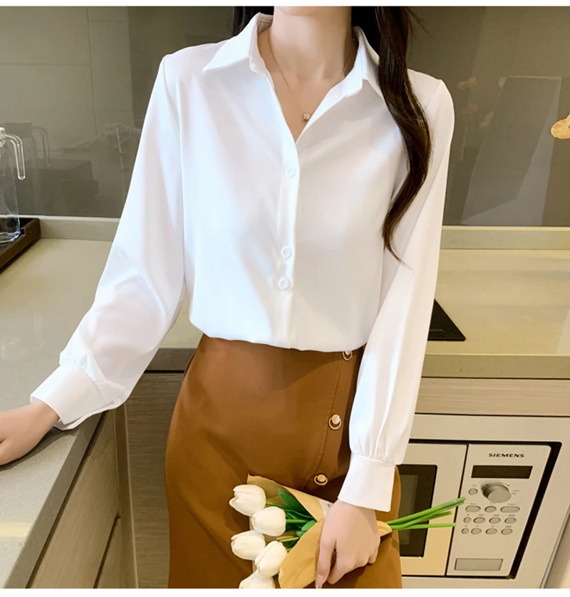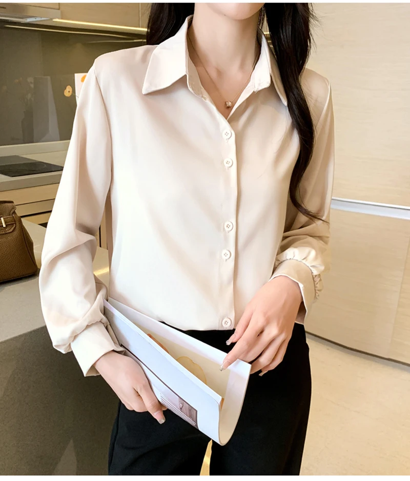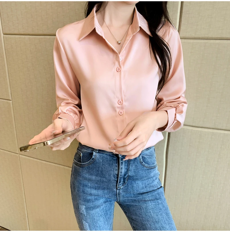 QOERLIN S-4XL المرأة زر أبيض حتى قمصان طويلة الأكمام بدوره إلى أسفل مكتب بلايز قمصان بلوزة الأزرق ملابس العمل الساتان Blusas