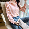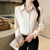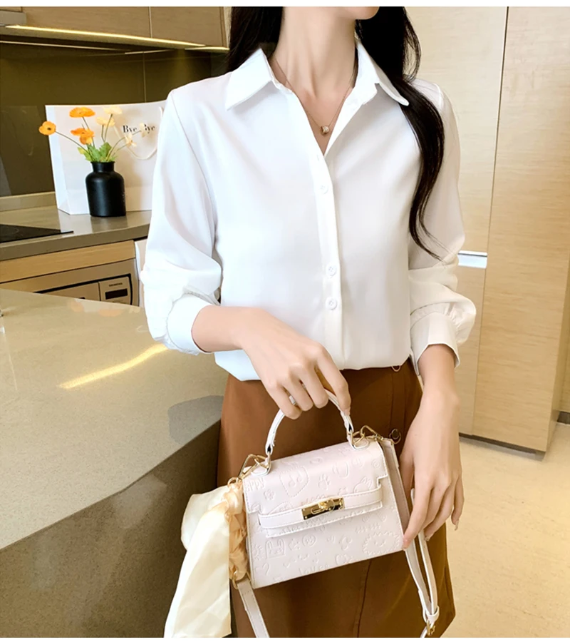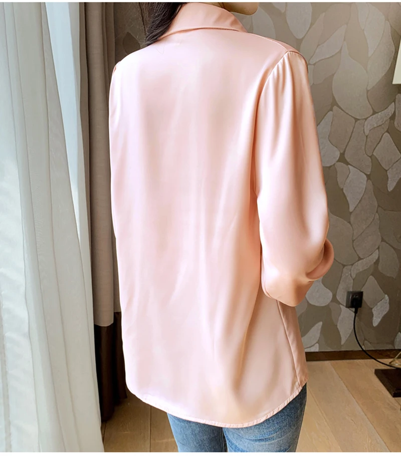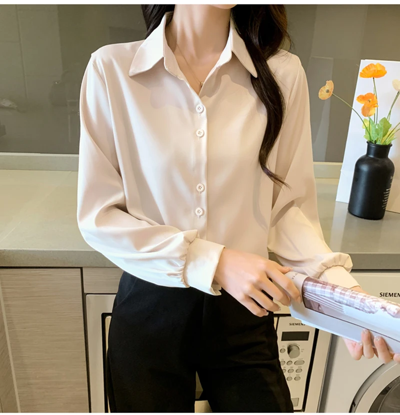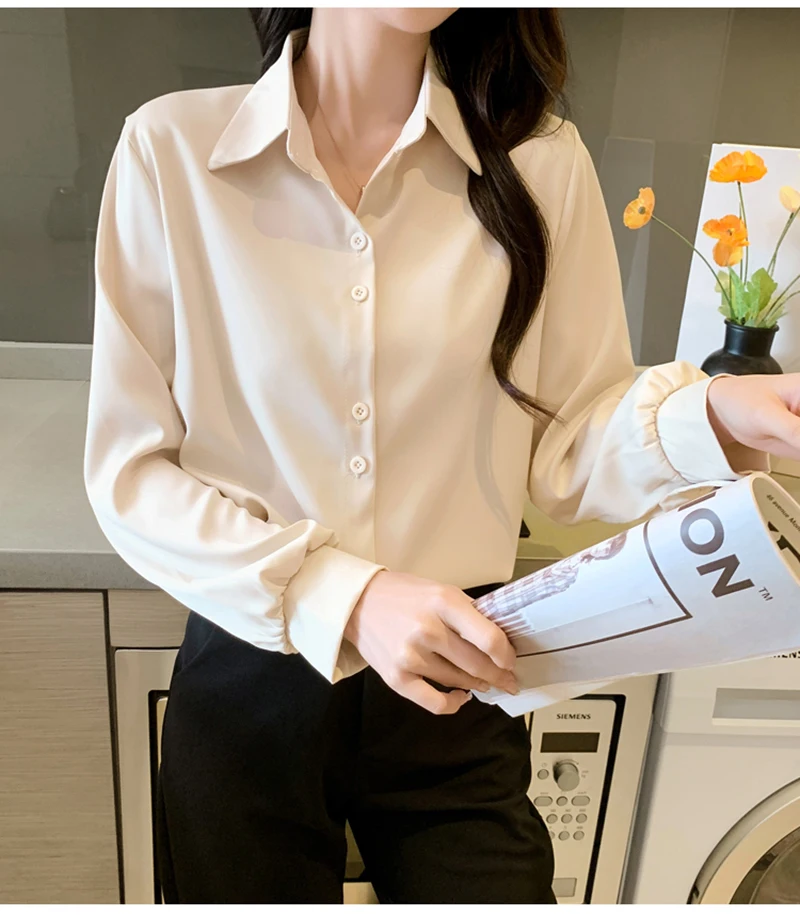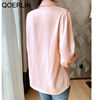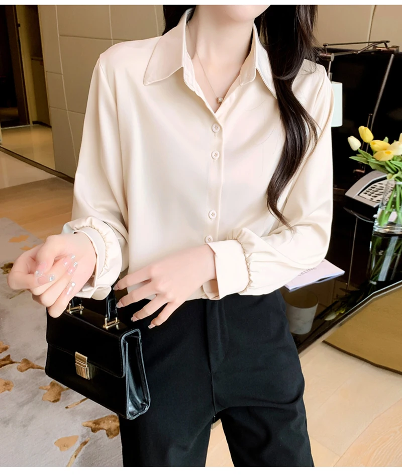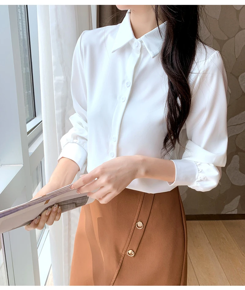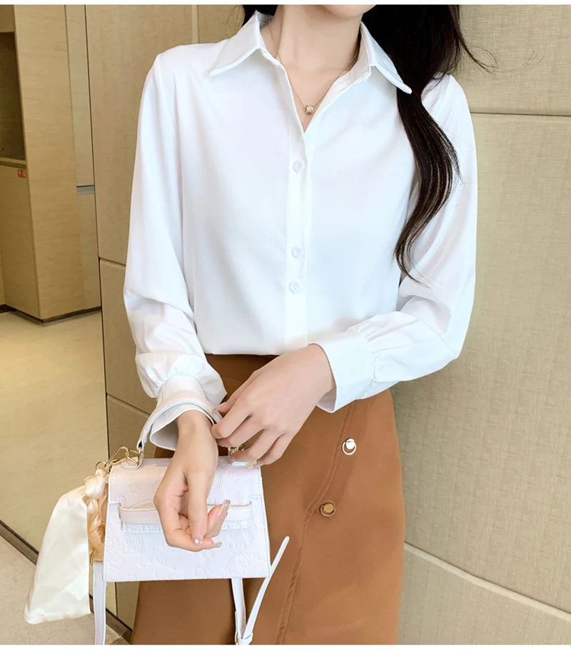 QOERLIN S-4XL المرأة زر أبيض حتى قمصان طويلة الأكمام بدوره إلى أسفل مكتب بلايز قمصان بلوزة الأزرق ملابس العمل الساتان Blusas