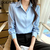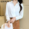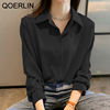 QOERLIN S-4XL المرأة زر أبيض حتى قمصان طويلة الأكمام بدوره إلى أسفل مكتب بلايز قمصان بلوزة الأزرق ملابس العمل الساتان Blusas