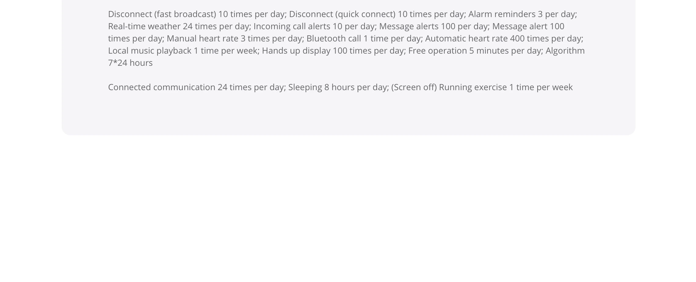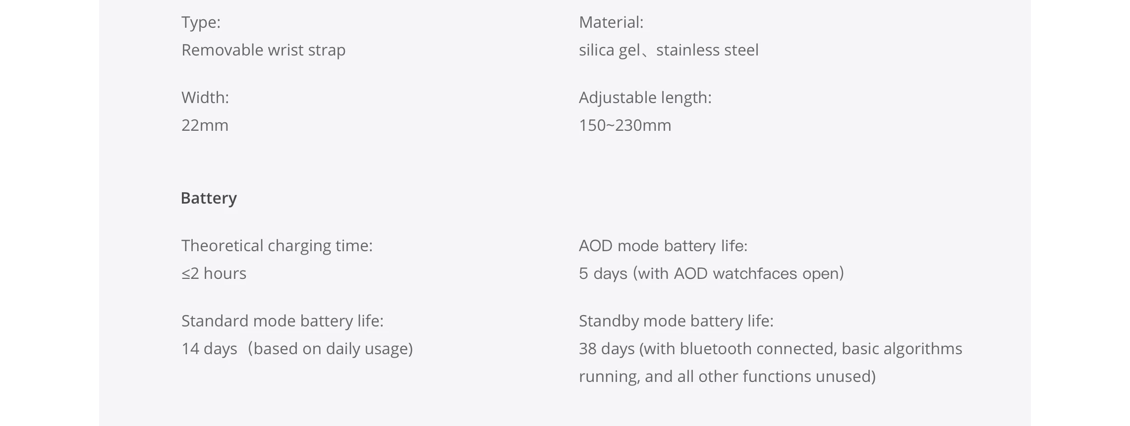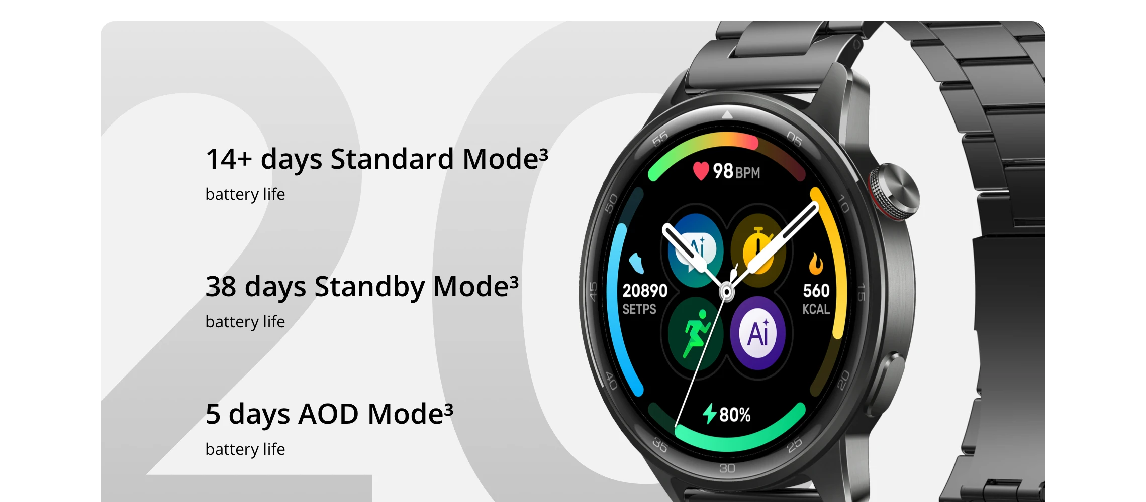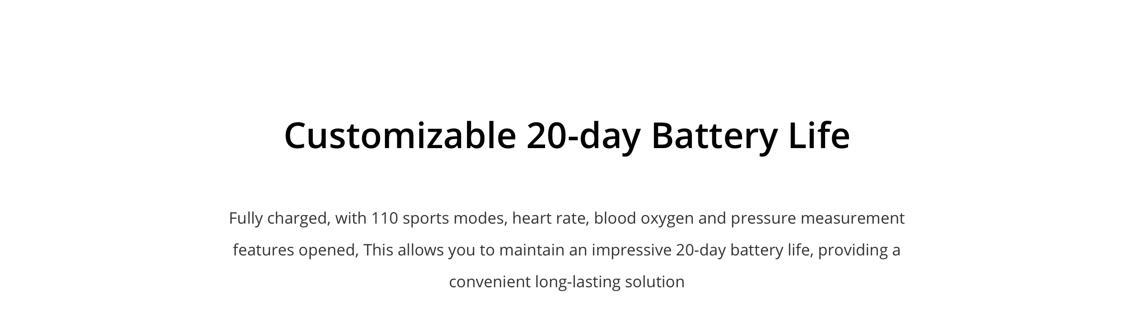 Battery—–Customizable 20-day Battery Life; 14 days+ standard mode long battery life; 5 days+ AOD mode battery life