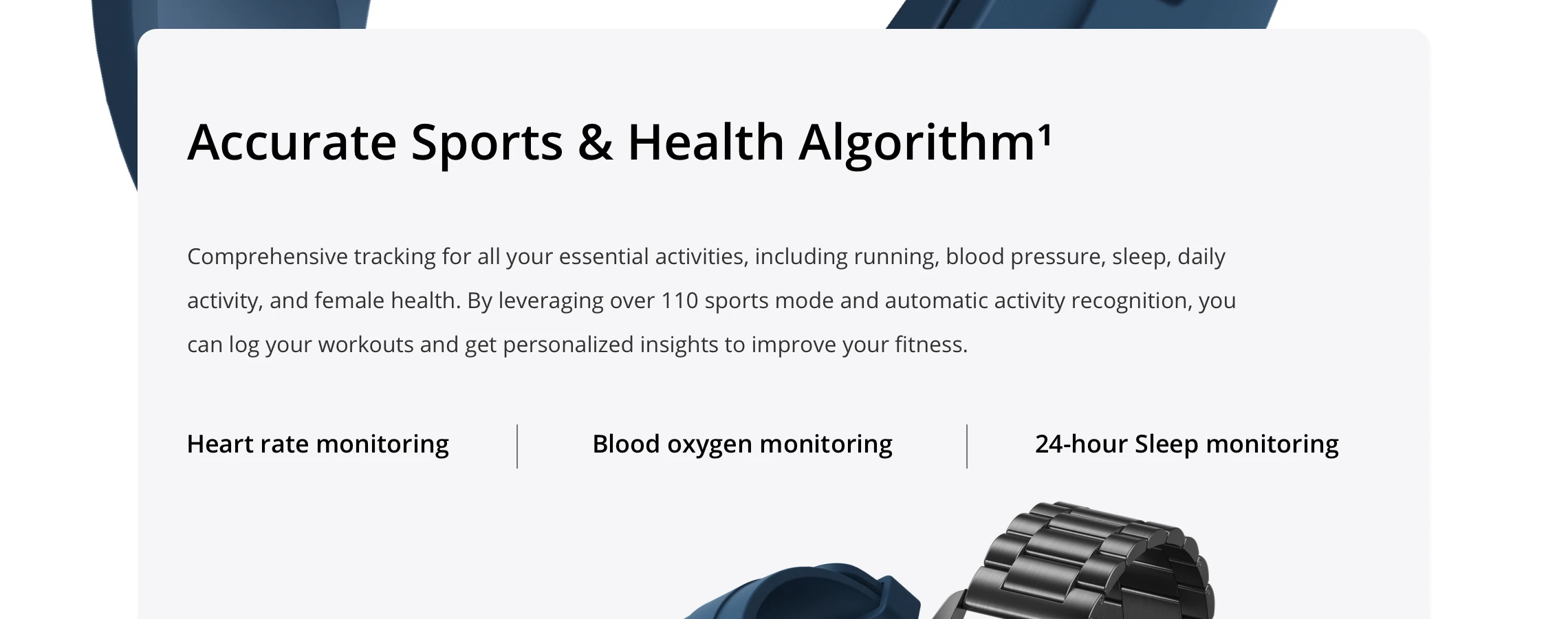 Other——-IP68 Dust & Water Resistance; Smart Life Wrist Assistant; 110 sports modes & sports auto-recognition algorithms; TWS audio device connectivity; Local music playback; 4GBits storage