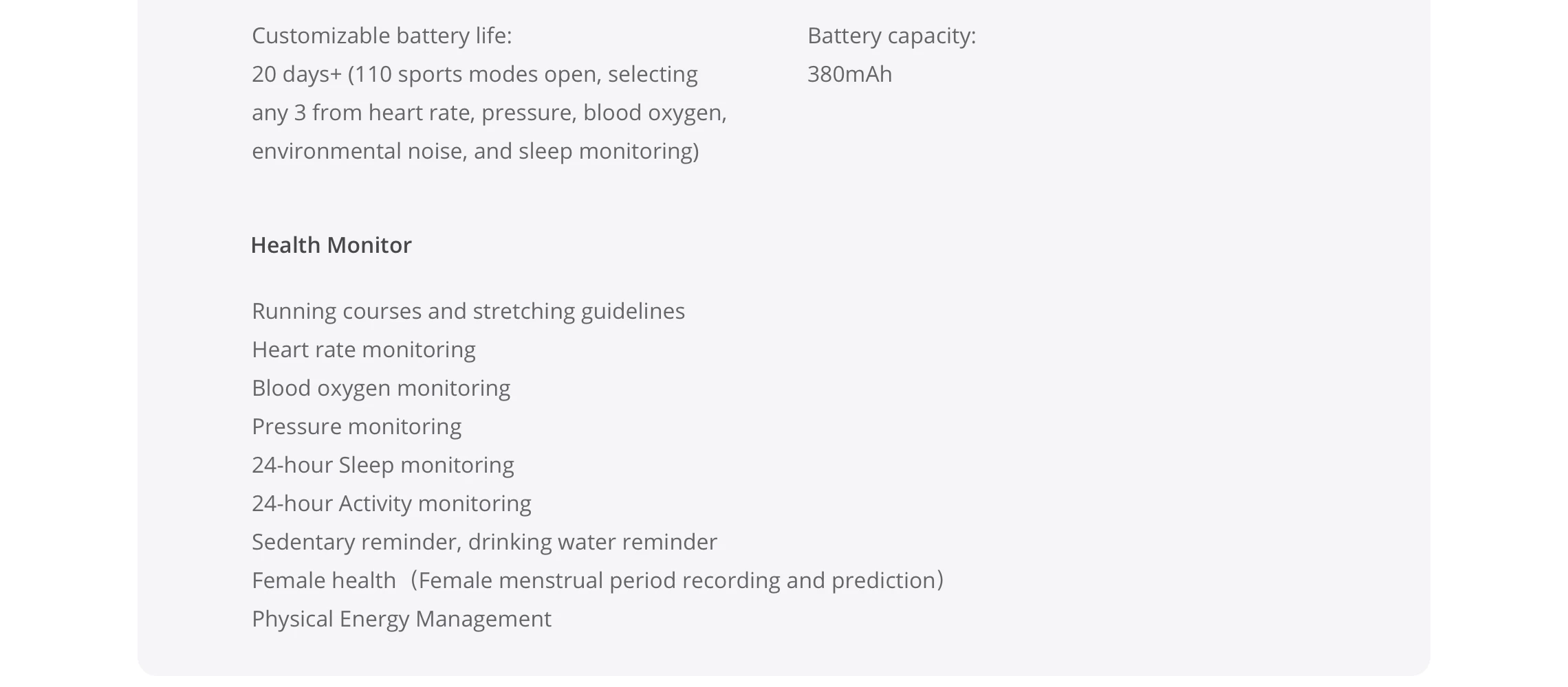 Sports & Health algorithm——Running courses and stretching guidelines; Heart rate monitoring; Blood oxygen monitoring; Pressure monitoring; 24-hour Sleep monitoring; 24-hour Activity monitoring; Sedentary reminder, drinking water reminder; Female health(Female menstrual period recording and prediction); Physical Energy Management