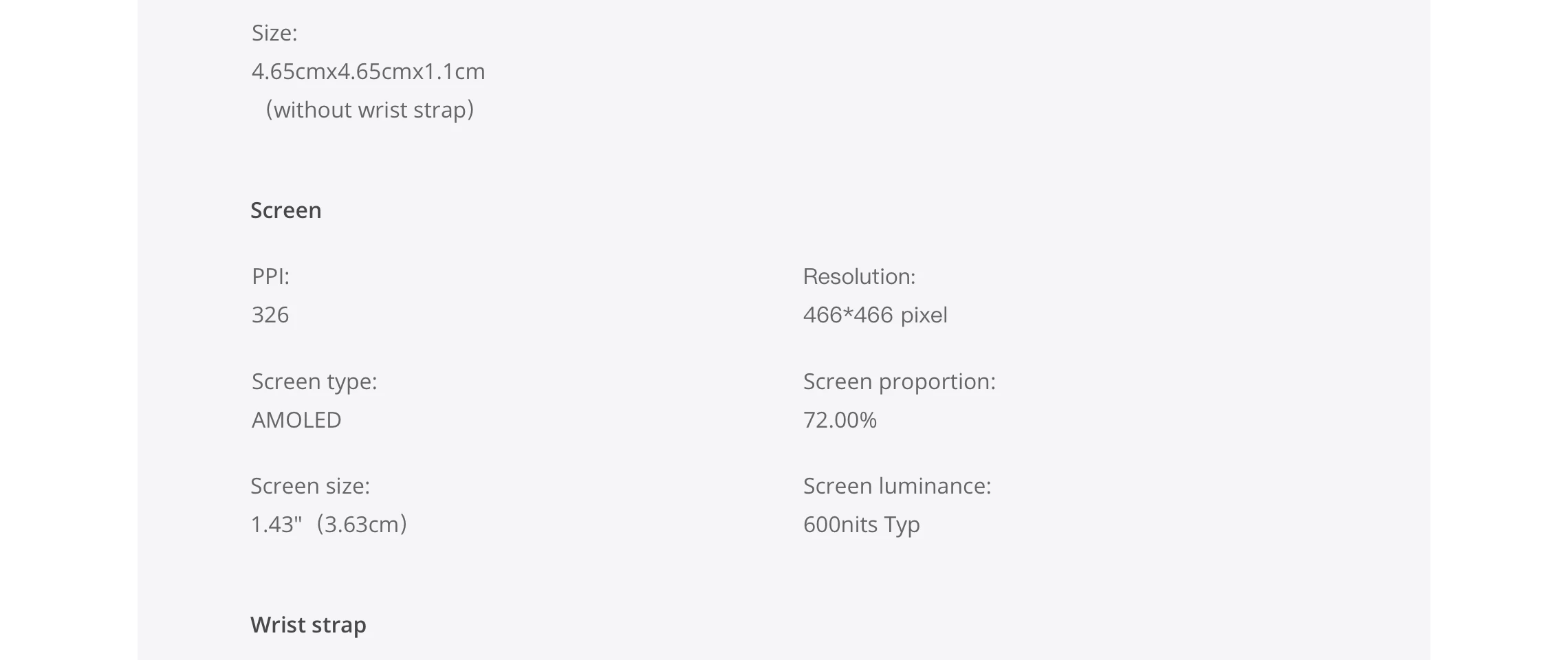 Display—–1.43″(3.63cm) AMOLED Display; Resolution – 466*466; Refresh rate – 50~60 FPS
