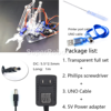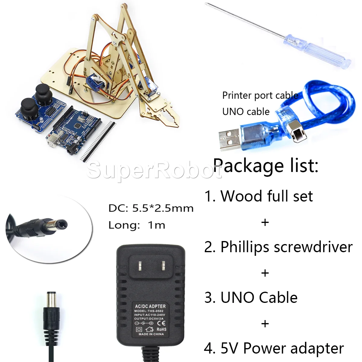 The full set of spare parts of mechanical arm includes: various color mechanical arm +R3 module + dual rocker module +SG90 steering gear (4 PCS), not including power adapter (5V)