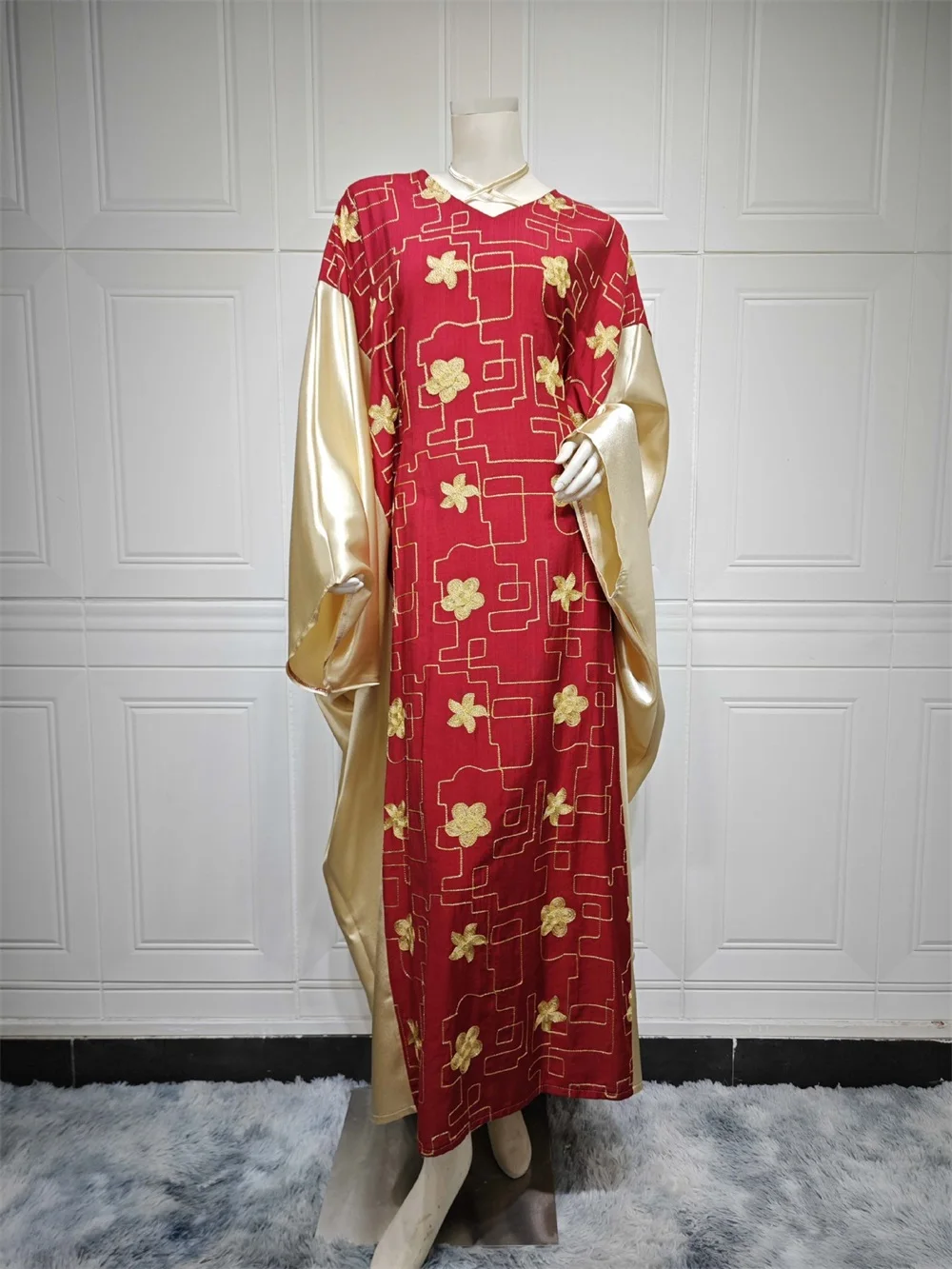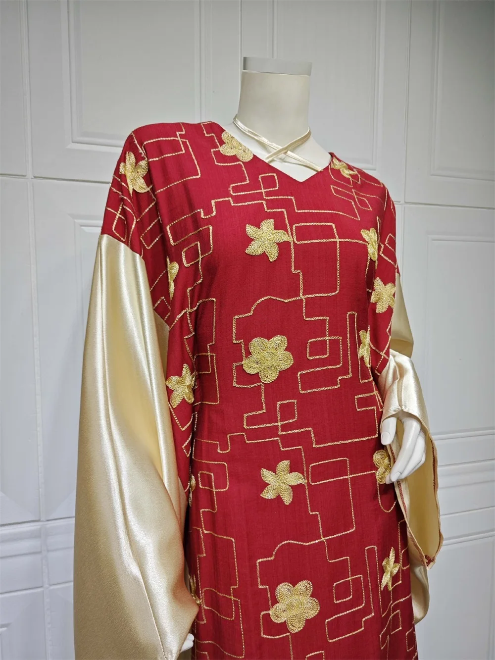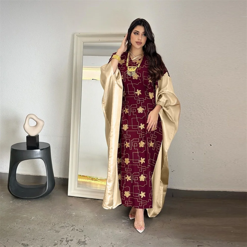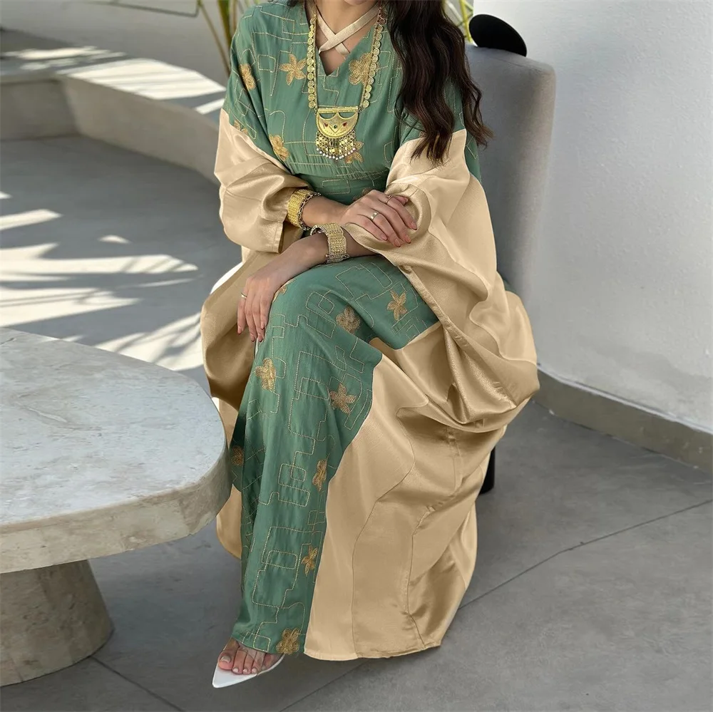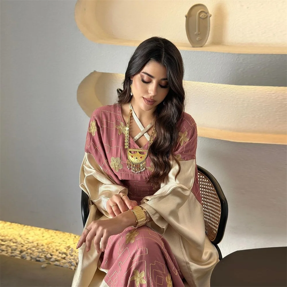 Siskakia Arab Dubai Fashion Floral Embroidery Long Dresses Moroccan Kaftan Casual Contrast Color Batwing Sleeve Abaya For Women