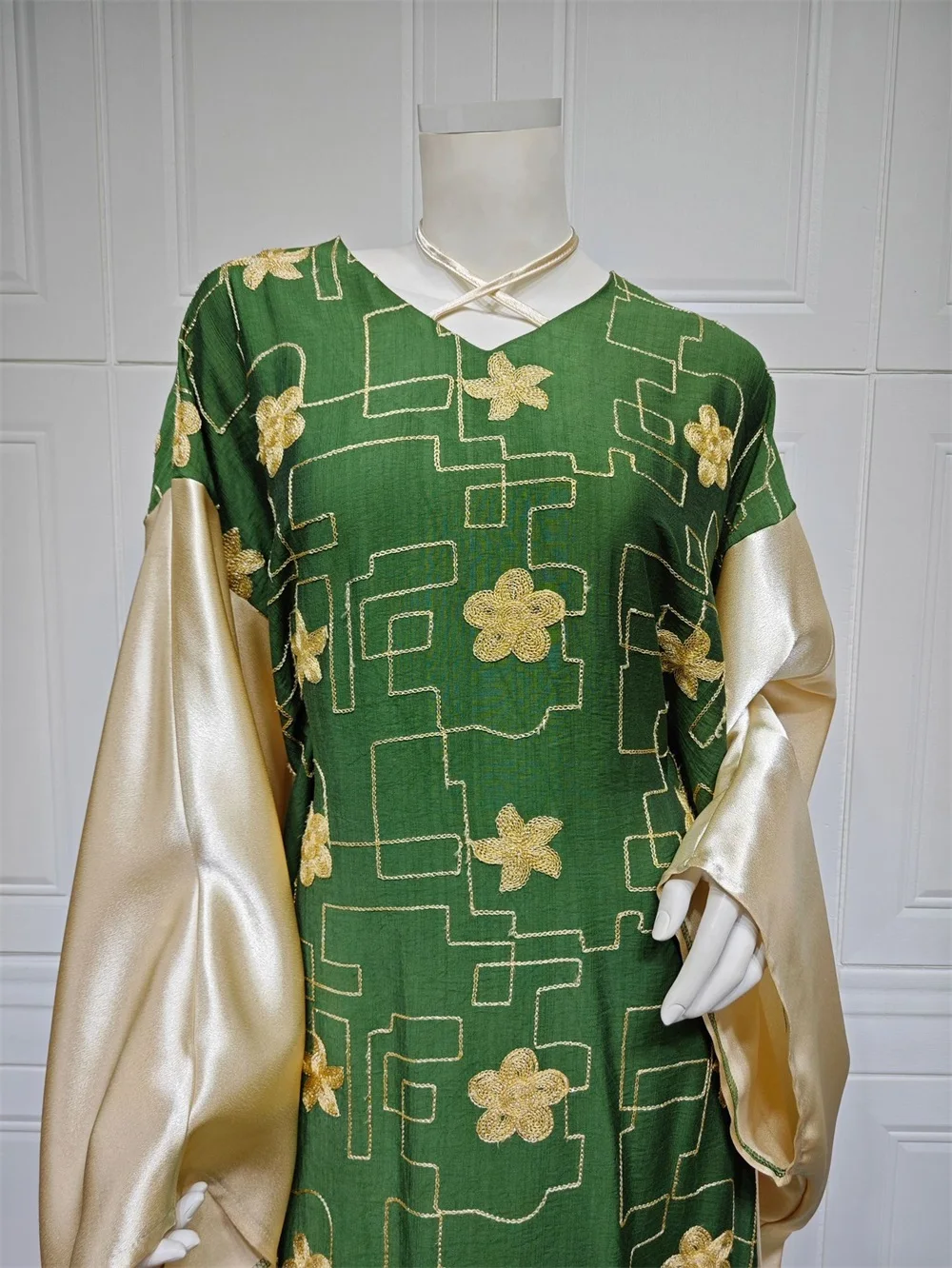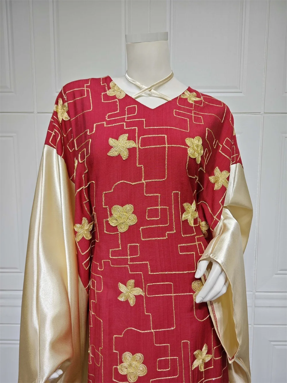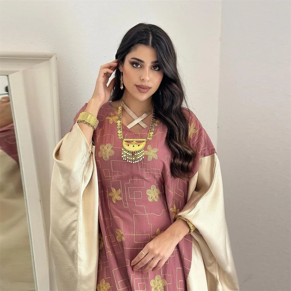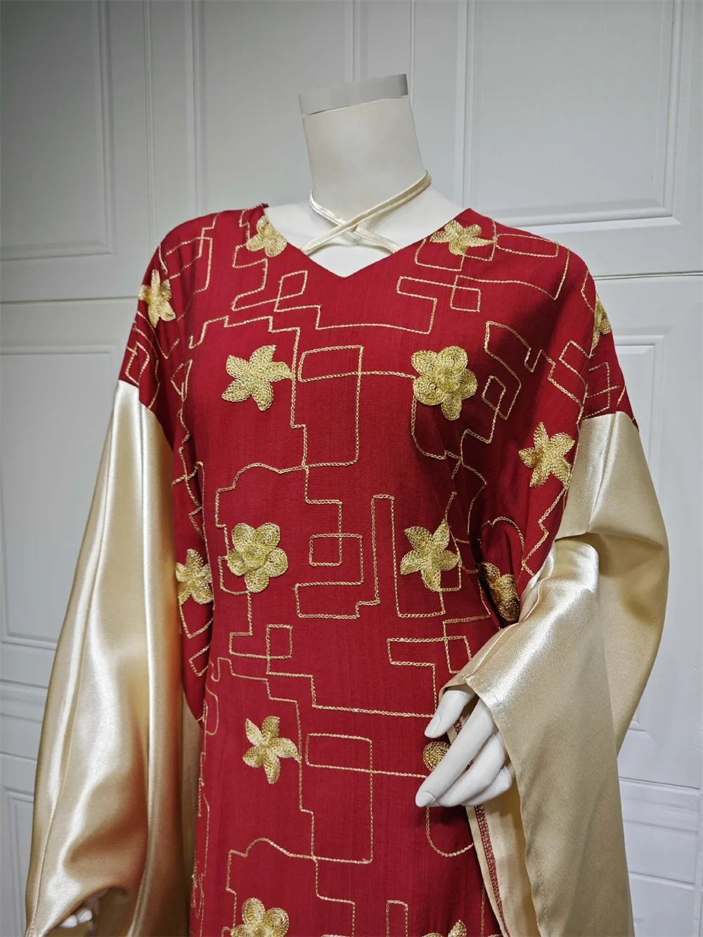 Siskakia Arab Dubai Fashion Floral Embroidery Long Dresses Moroccan Kaftan Casual Contrast Color Batwing Sleeve Abaya For Women