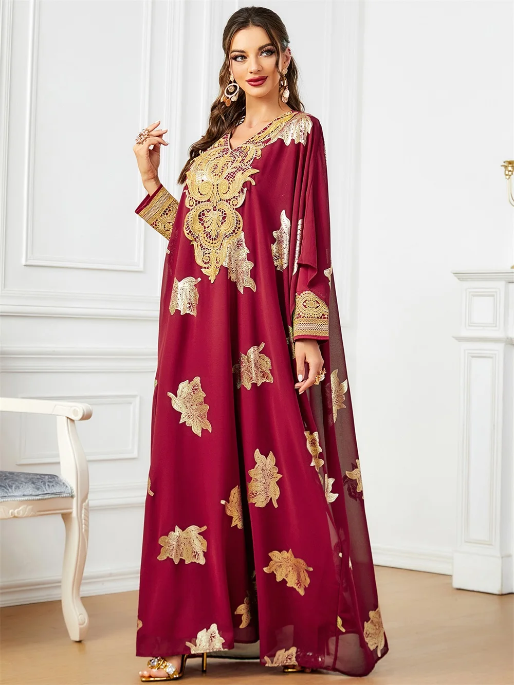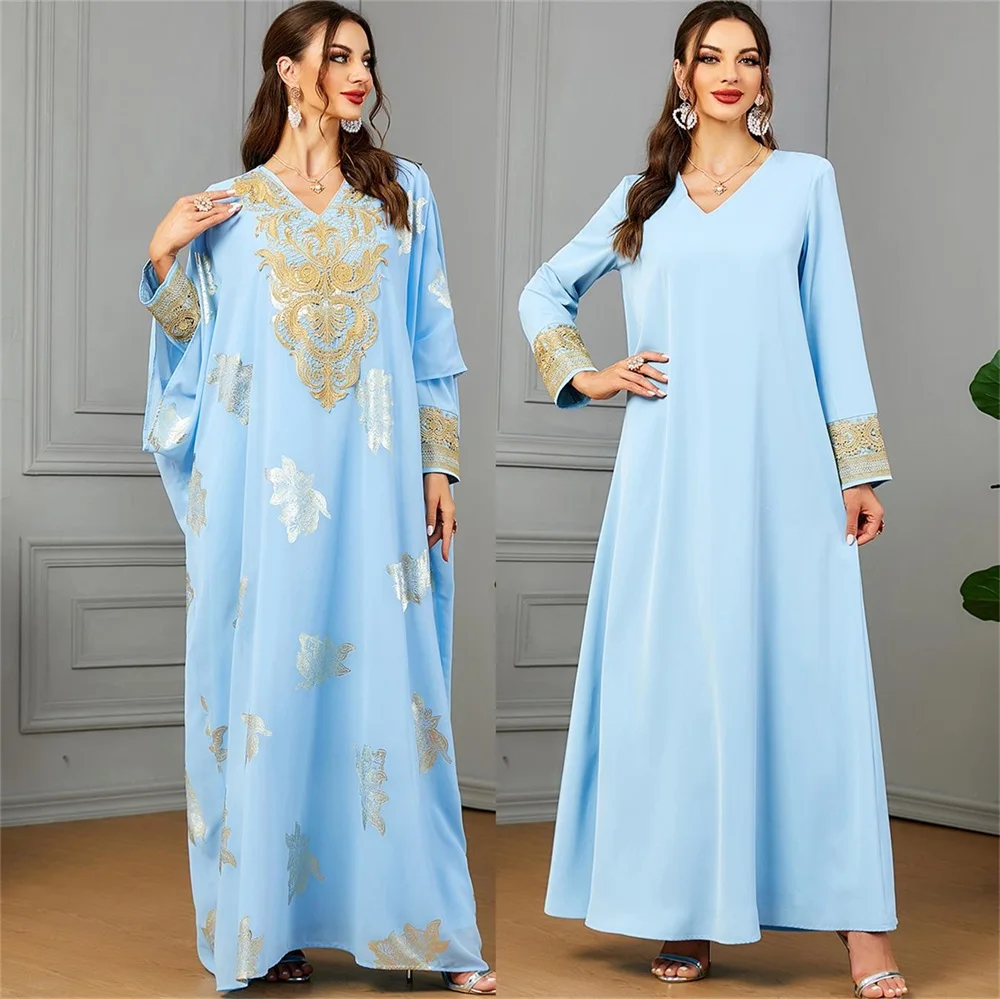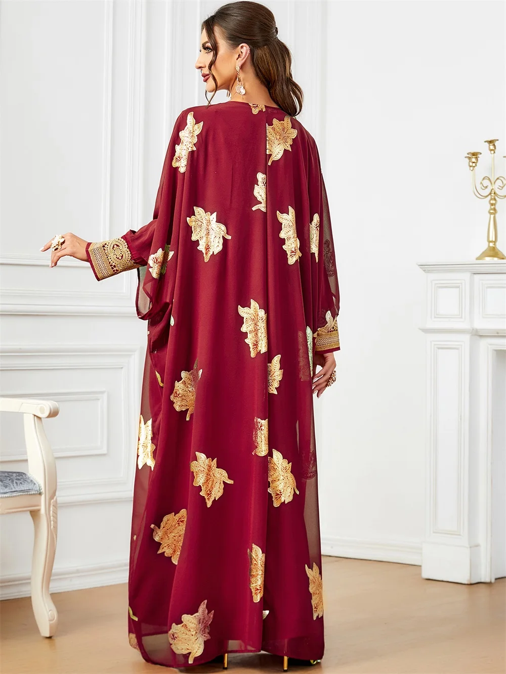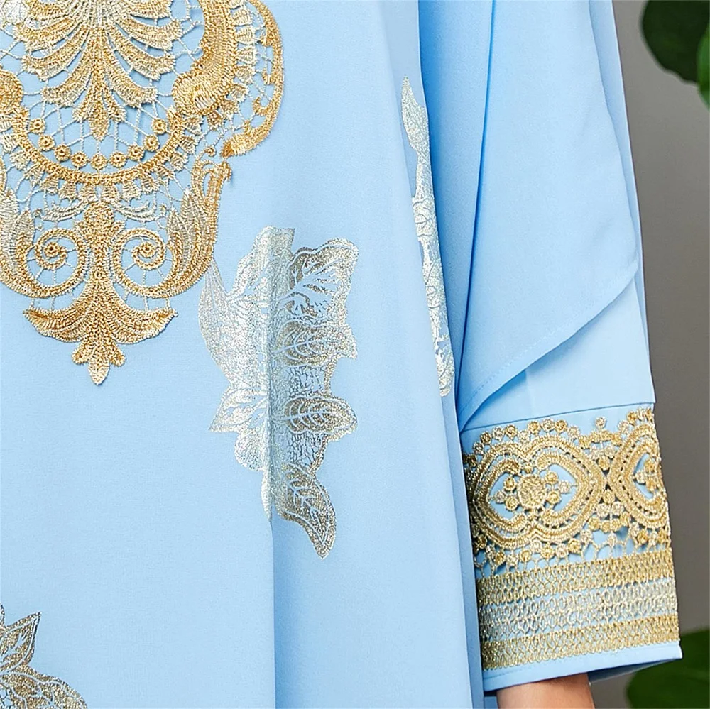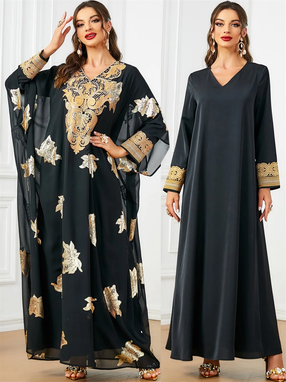 Siskakia Dubai Luxury Set Solid Long Dress And Chiffon Abaya Fashion Floral Gold Stamping Lace Tape Moroccan Evening Clothing