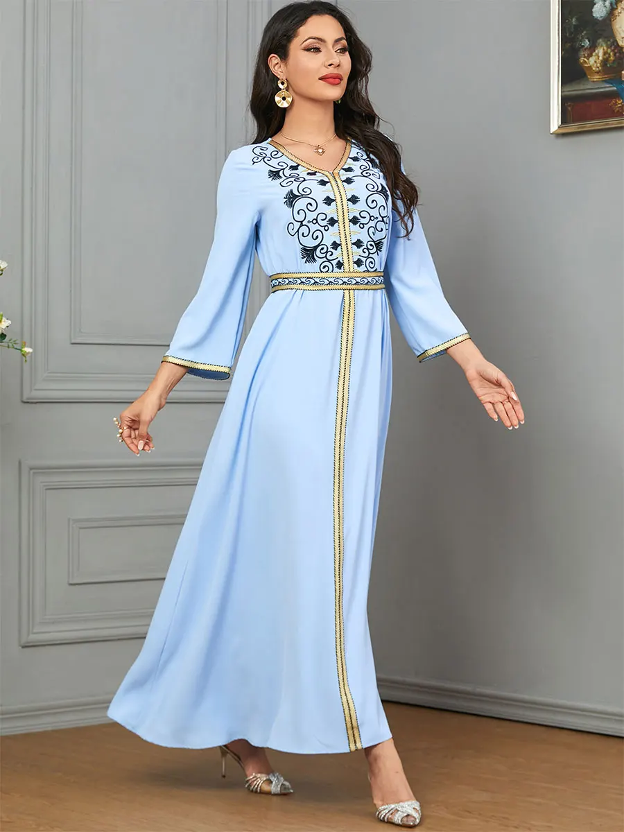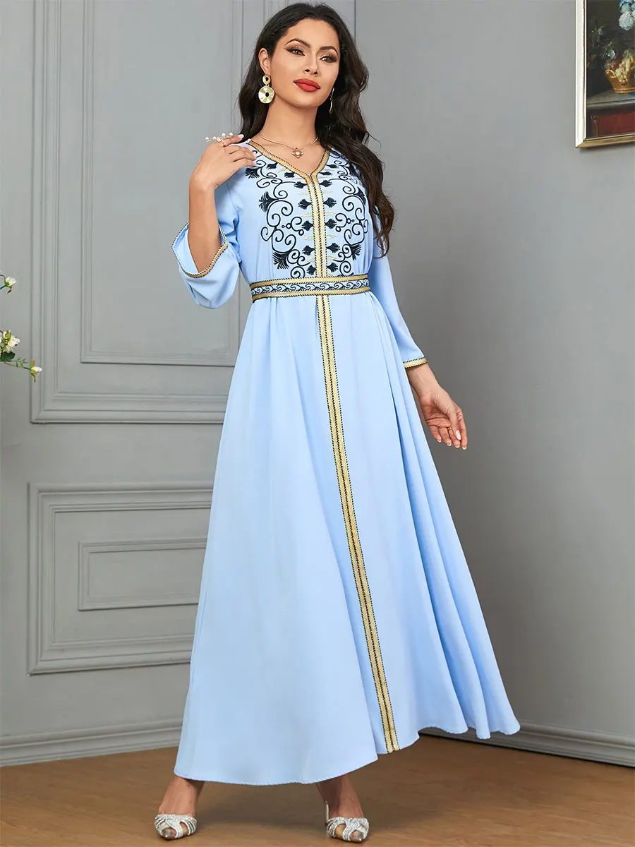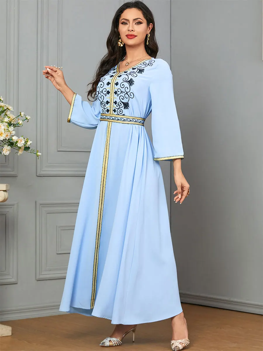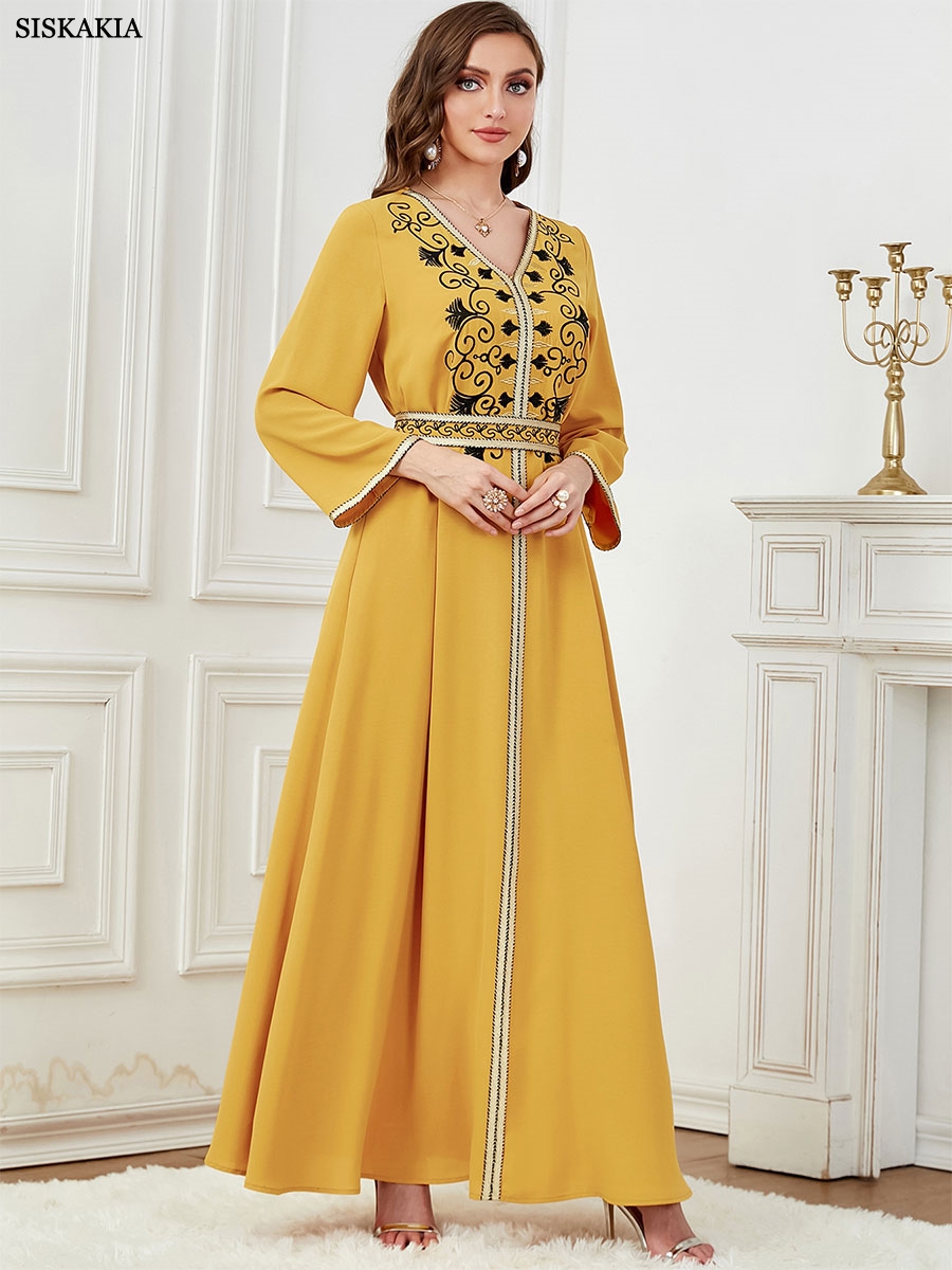 Siskakia Dubai Muslim Embroideried Woman Dress V-Neck Abaya With Belt Elegant Casual Moroccan Saudi Arab Kebaya Fashion Robe