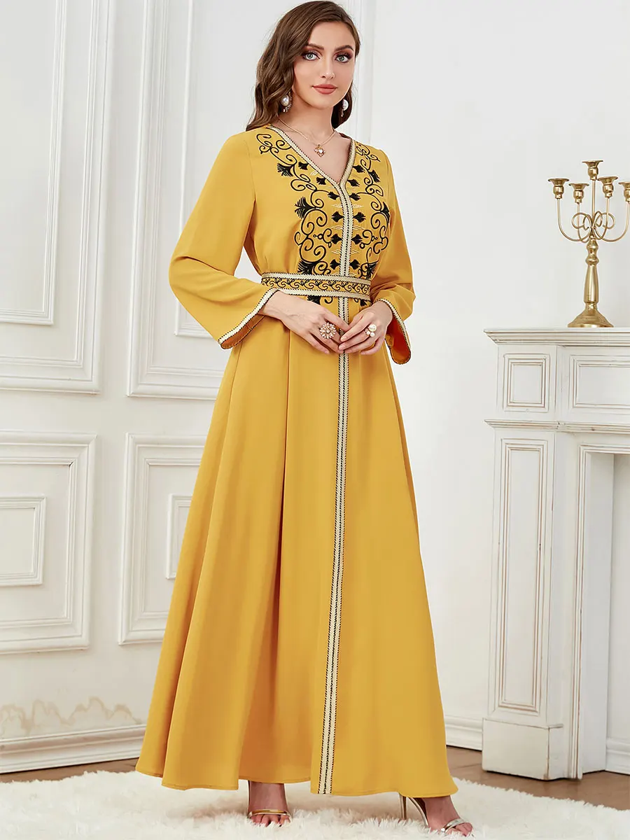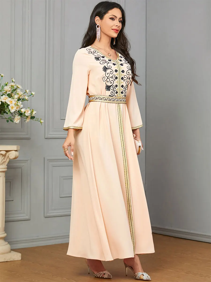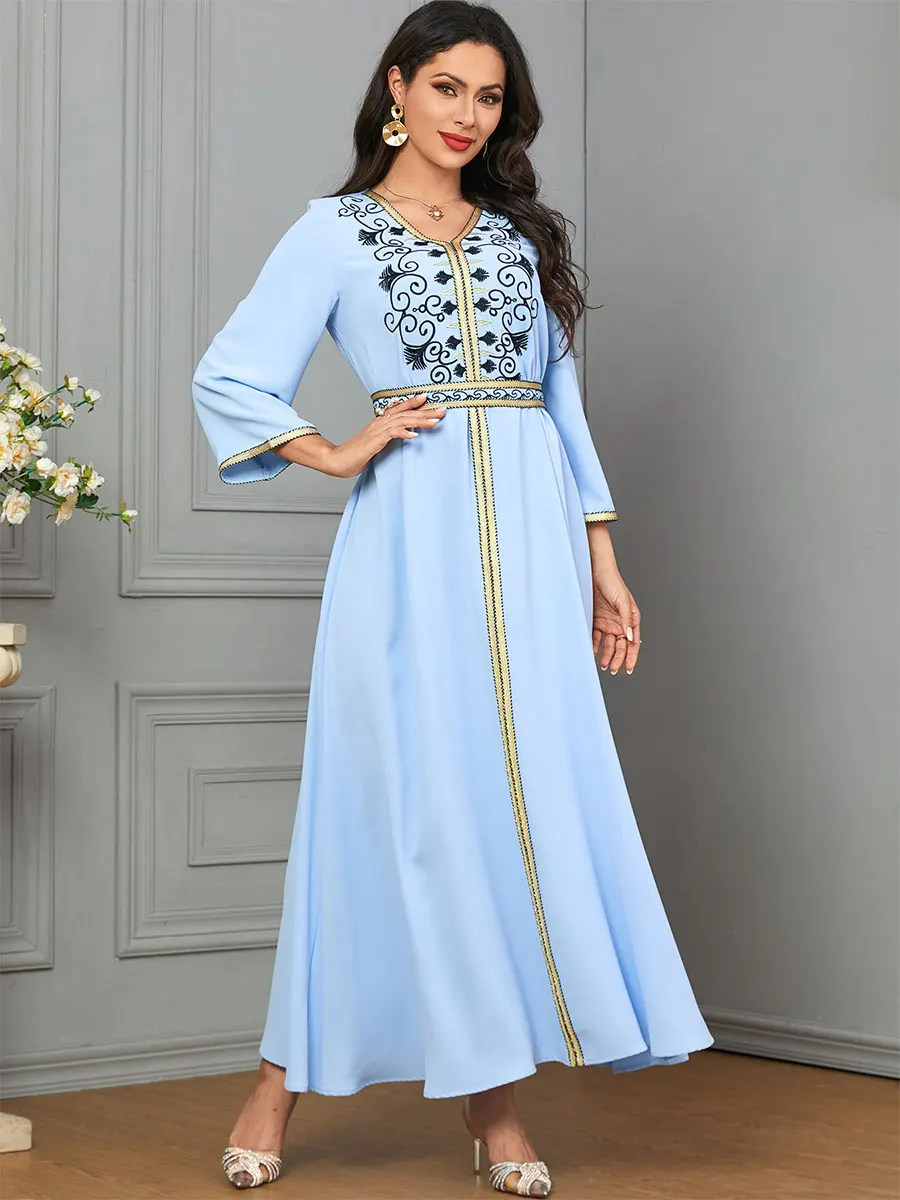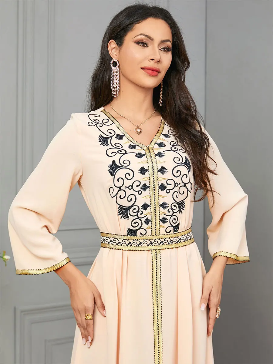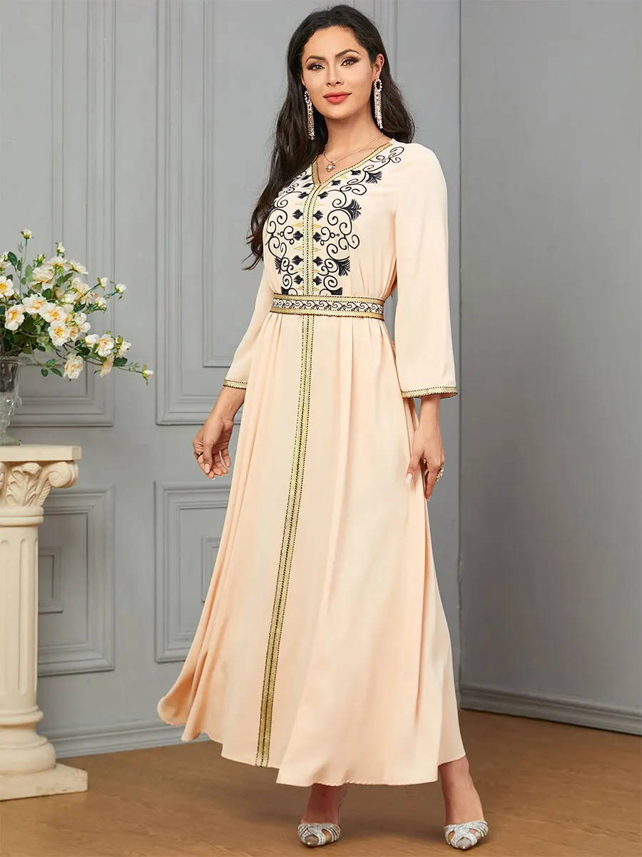 Siskakia Dubai Muslim Embroideried Woman Dress V-Neck Abaya With Belt Elegant Casual Moroccan Saudi Arab Kebaya Fashion Robe