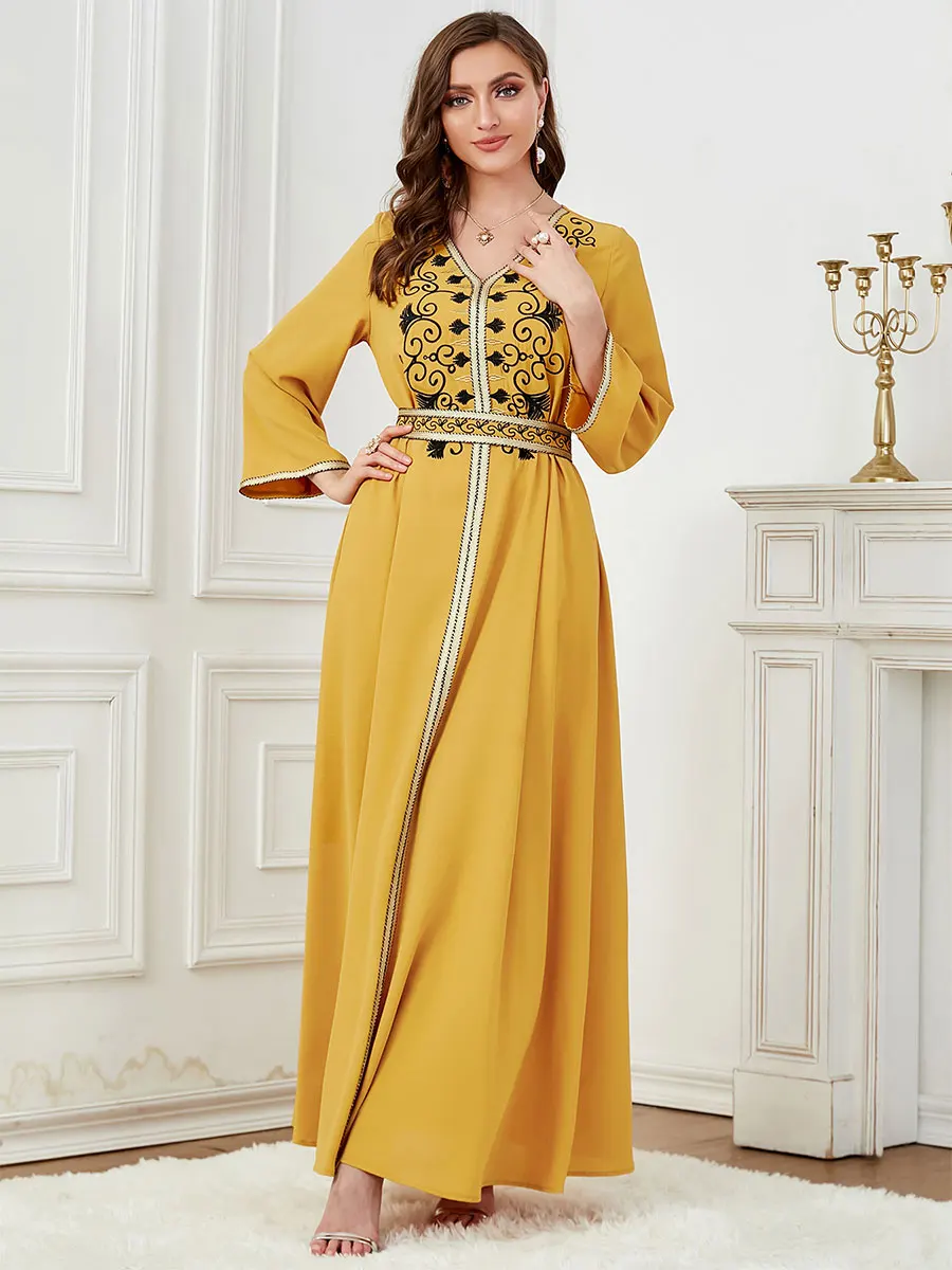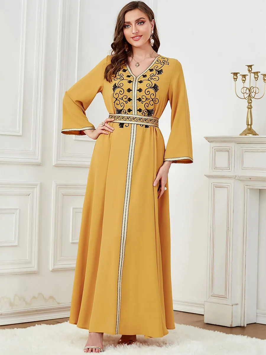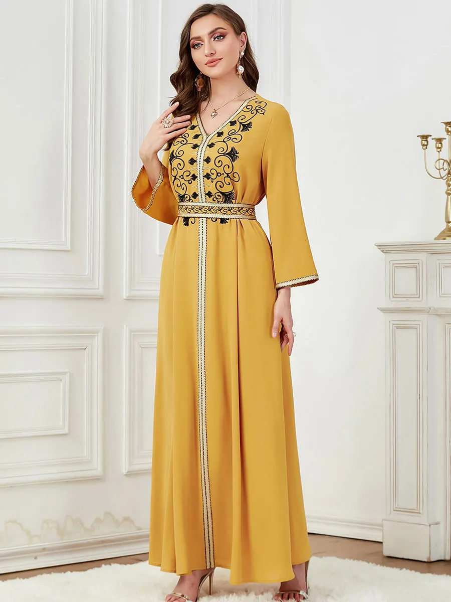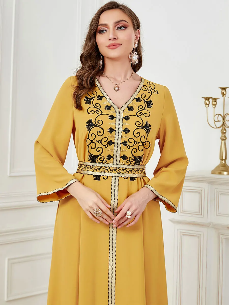Siskakia Dubai Muslim Embroideried Woman Dress V-Neck Abaya With Belt Elegant Casual Moroccan Saudi Arab Kebaya Fashion Robe
