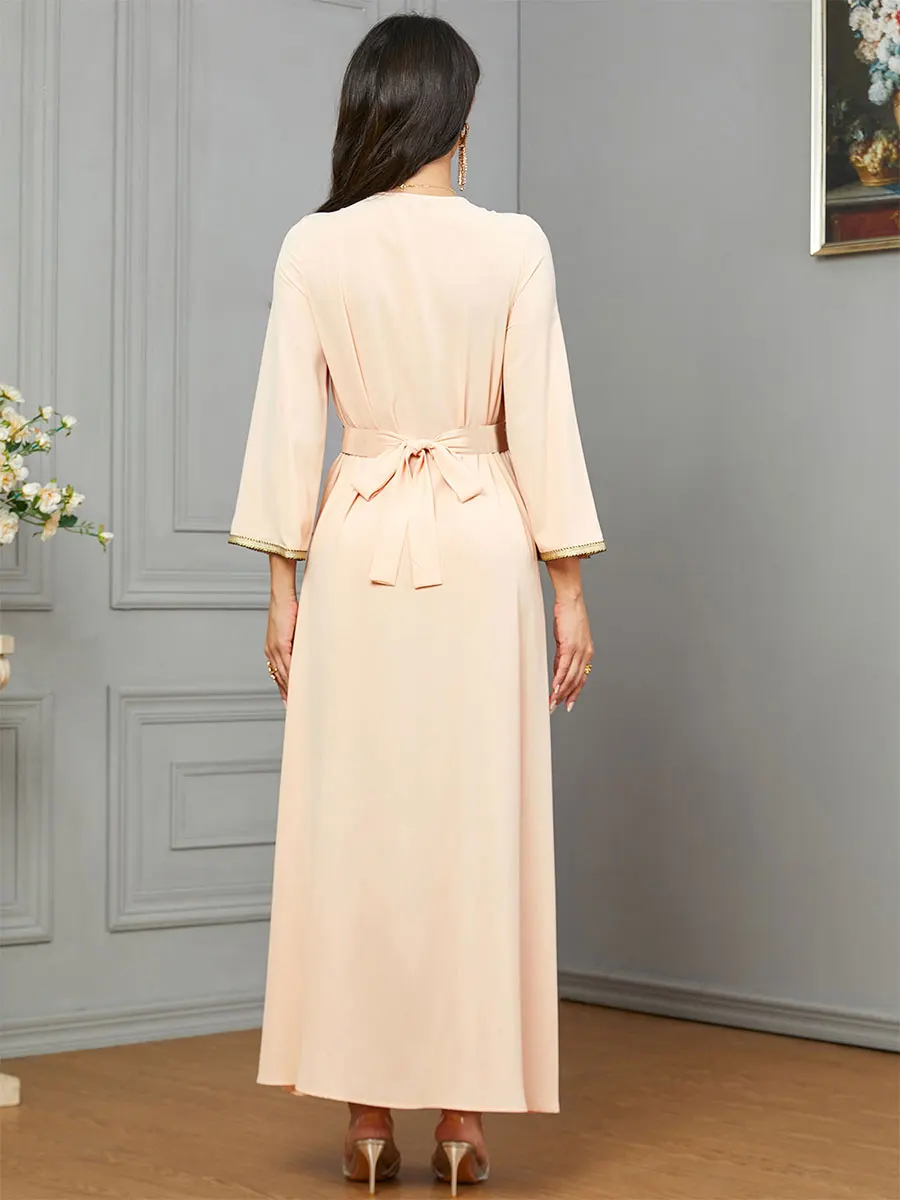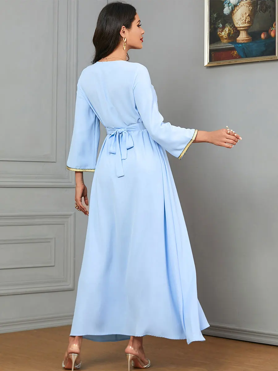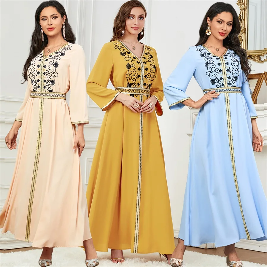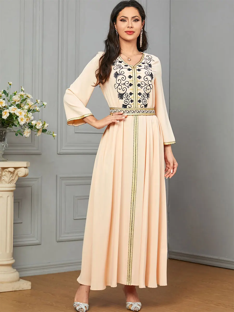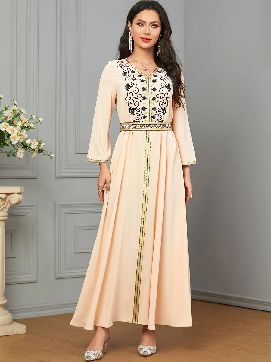 Siskakia Dubai Muslim Embroideried Woman Dress V-Neck Abaya With Belt Elegant Casual Moroccan Saudi Arab Kebaya Fashion Robe