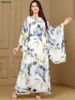 Siskakia Fashion Floral Print A-Line Long Dresses With Belt For Dubai Muslim Woman Flare Sleeve O-Neck Elegant Casual Abayas