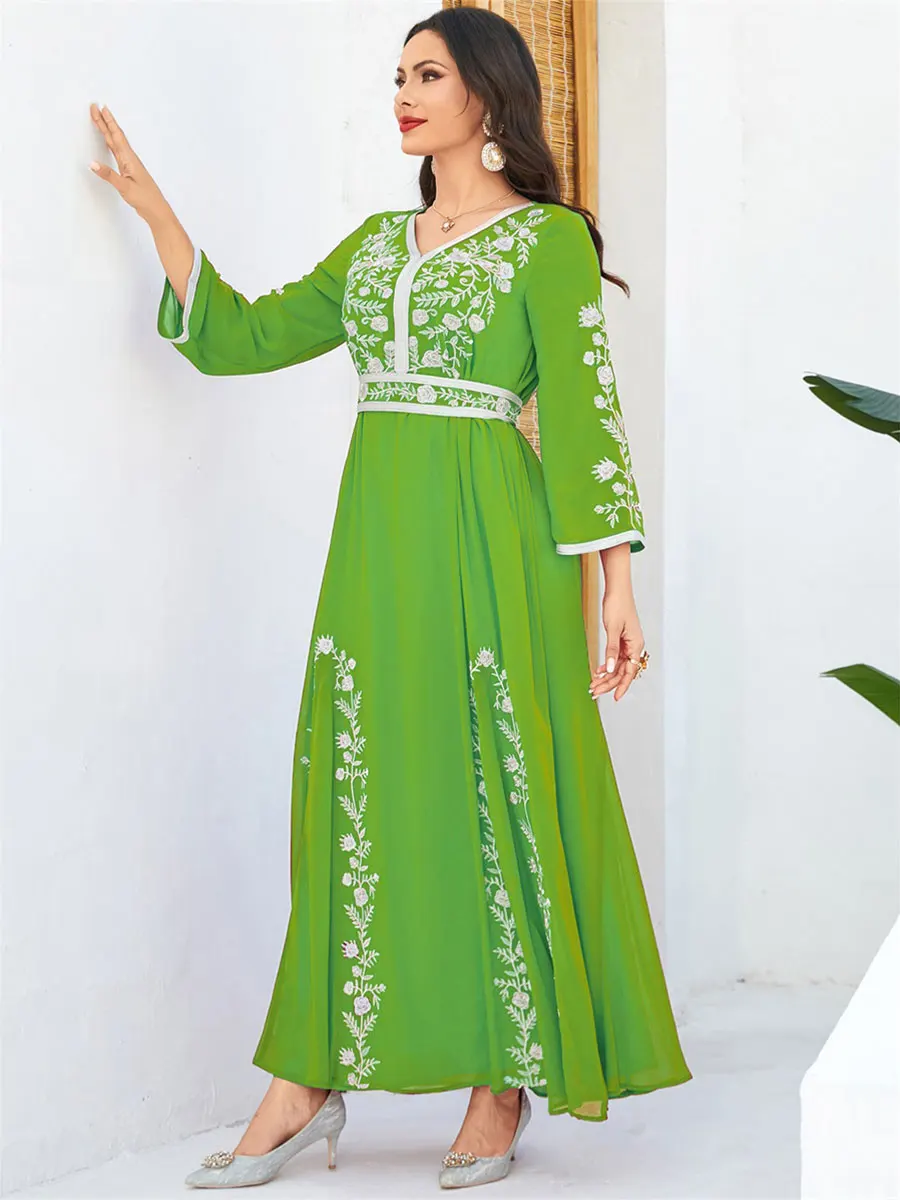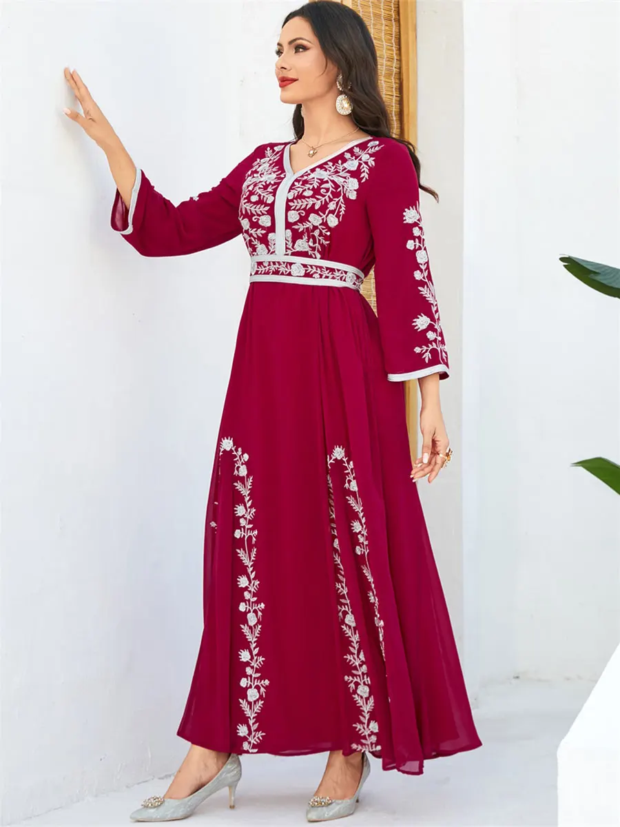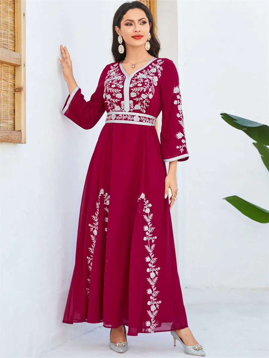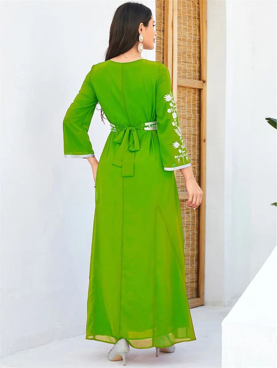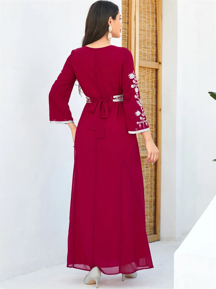 Siskakia Fashion Muslim Dubai Morocan Islamic Abayas V-Neck A-Line Neck Belted Kaftan Floral Embroidery Arabic Robe For Woman