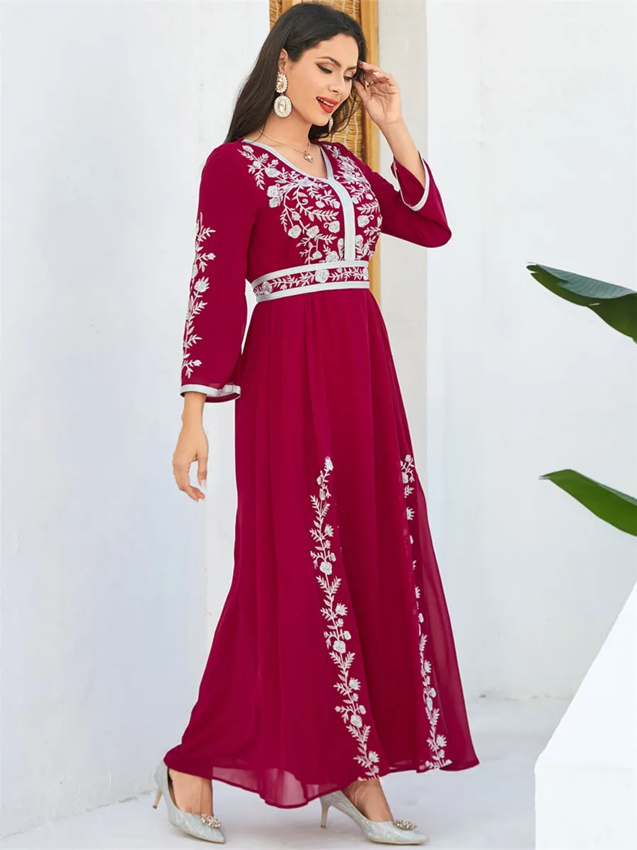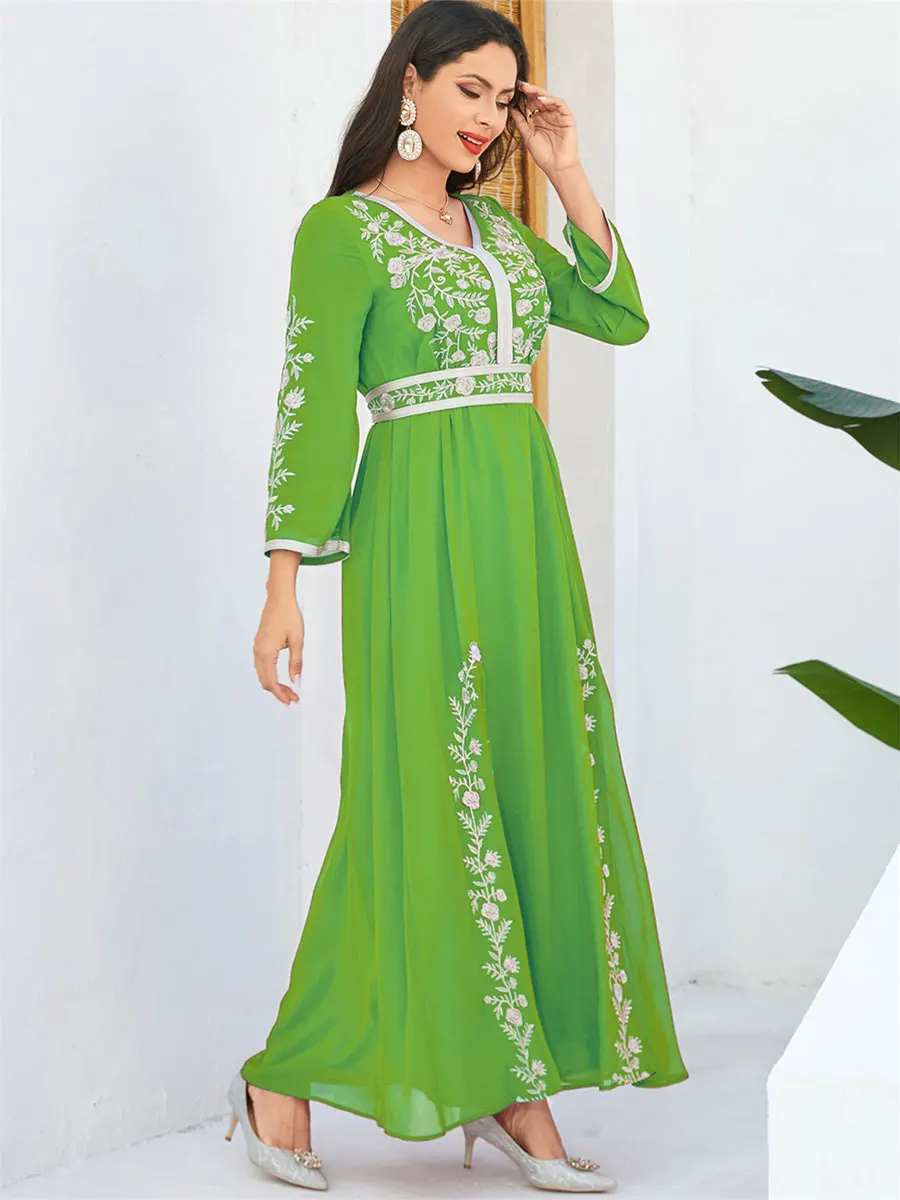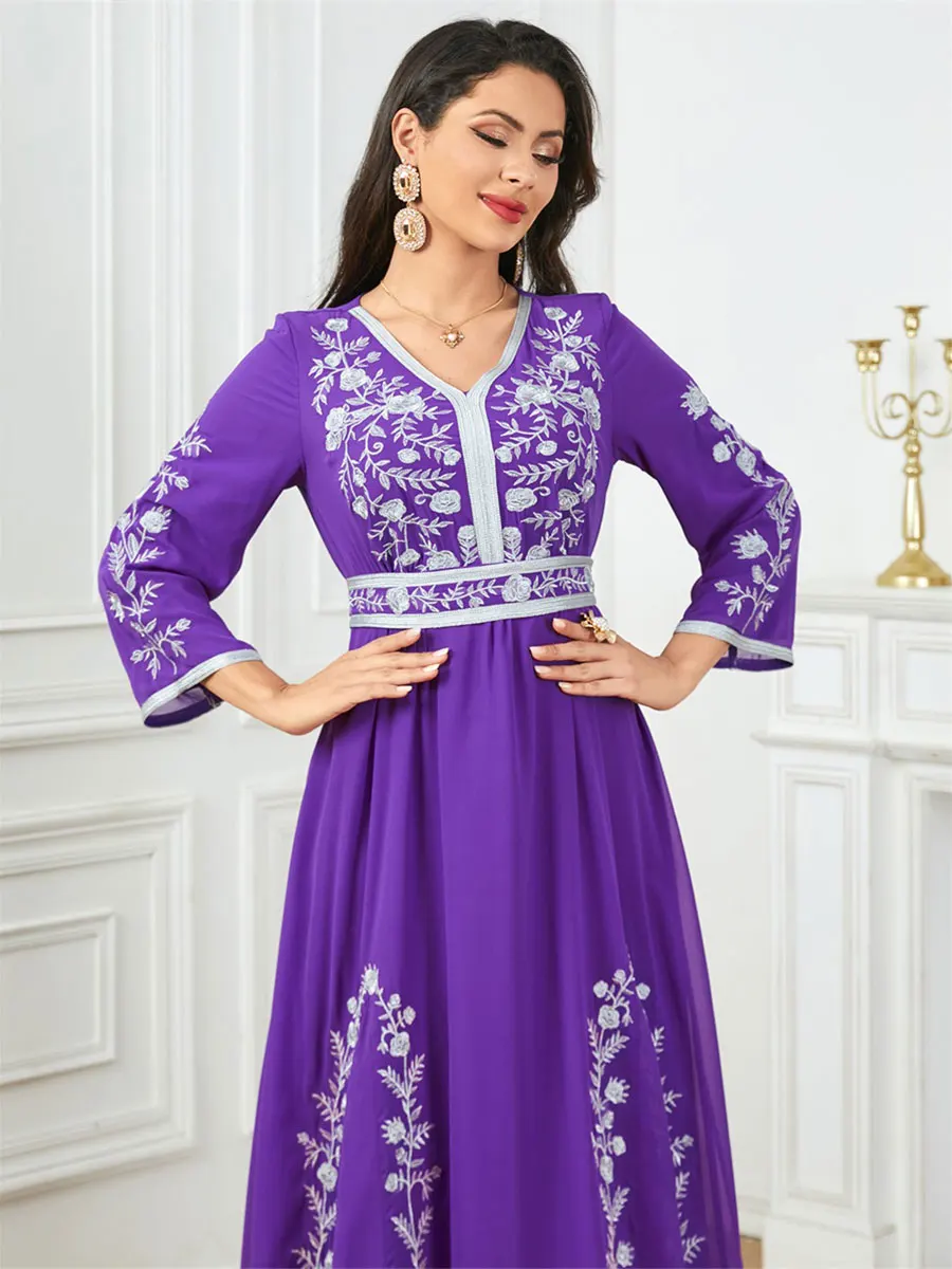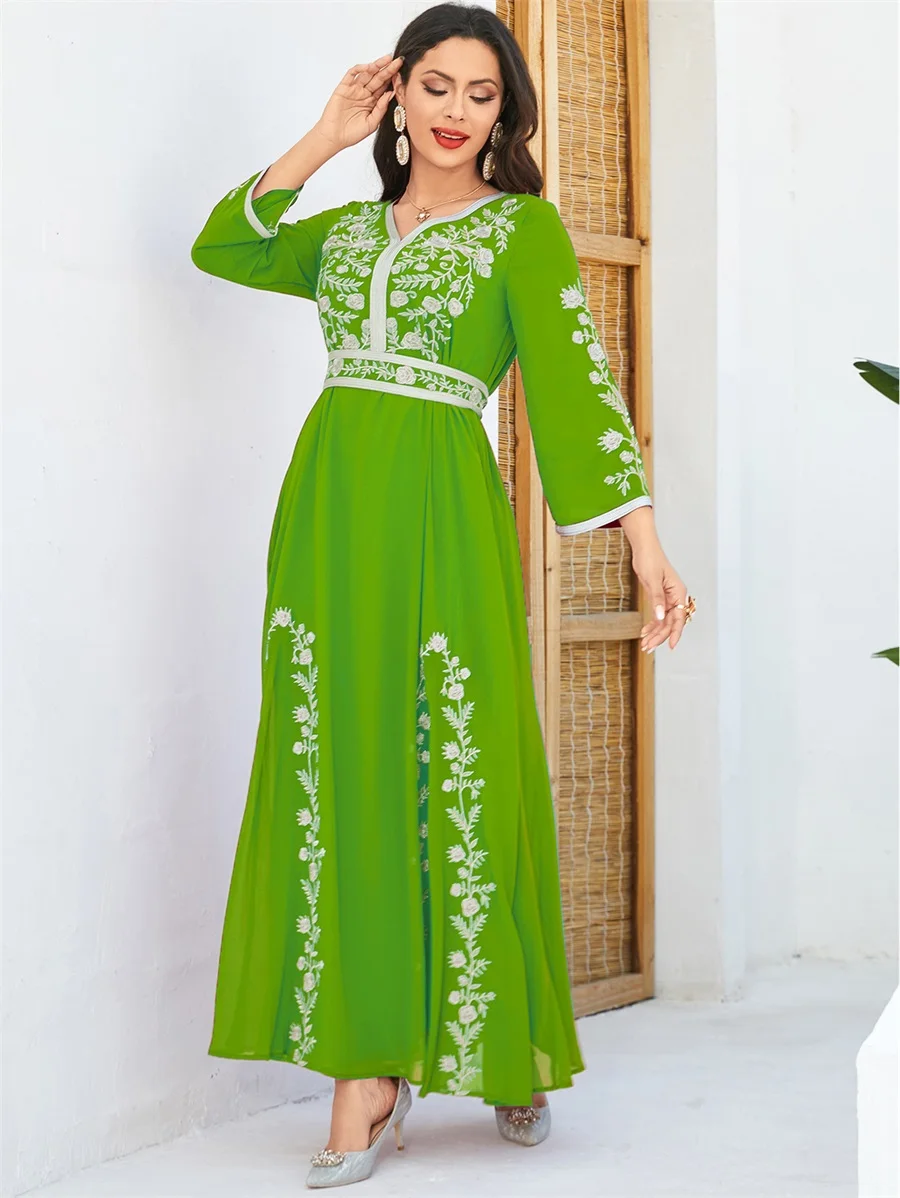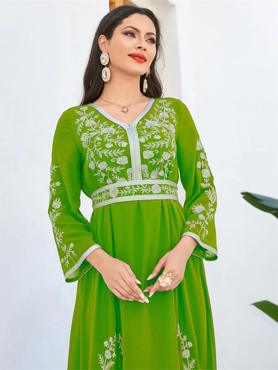 Siskakia Fashion Muslim Dubai Morocan Islamic Abayas V-Neck A-Line Neck Belted Kaftan Floral Embroidery Arabic Robe For Woman