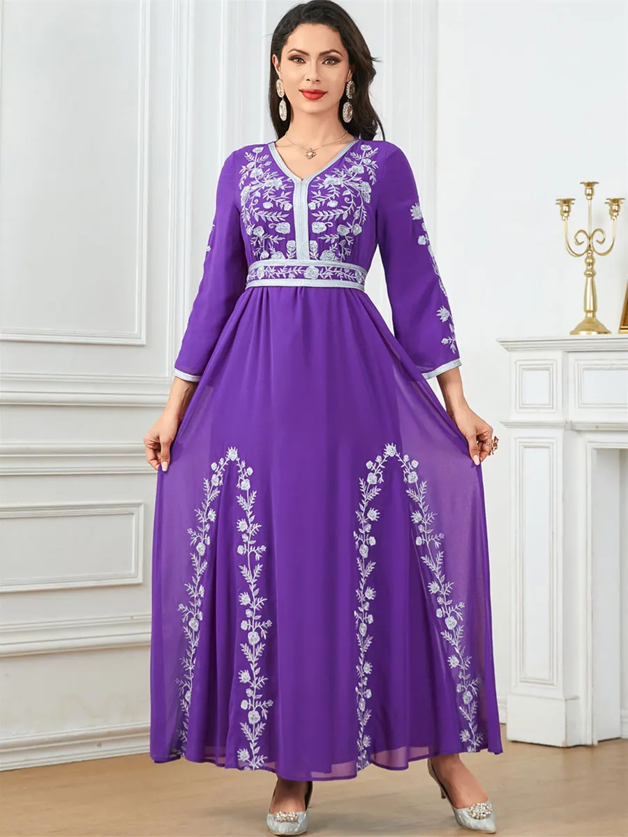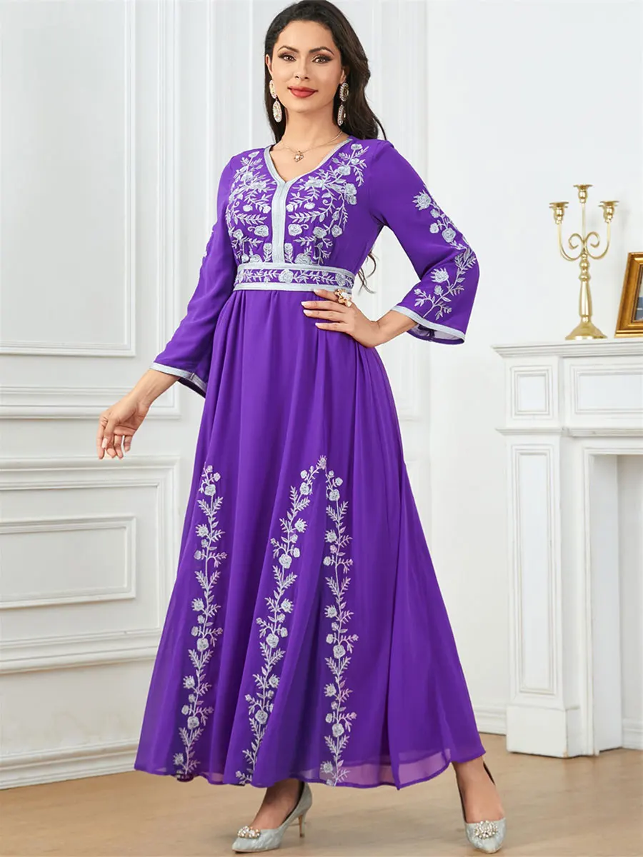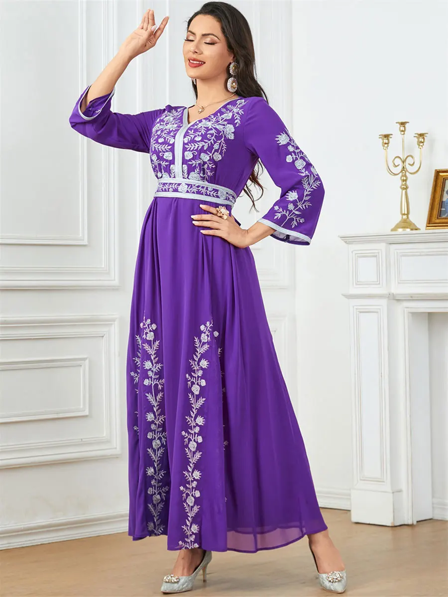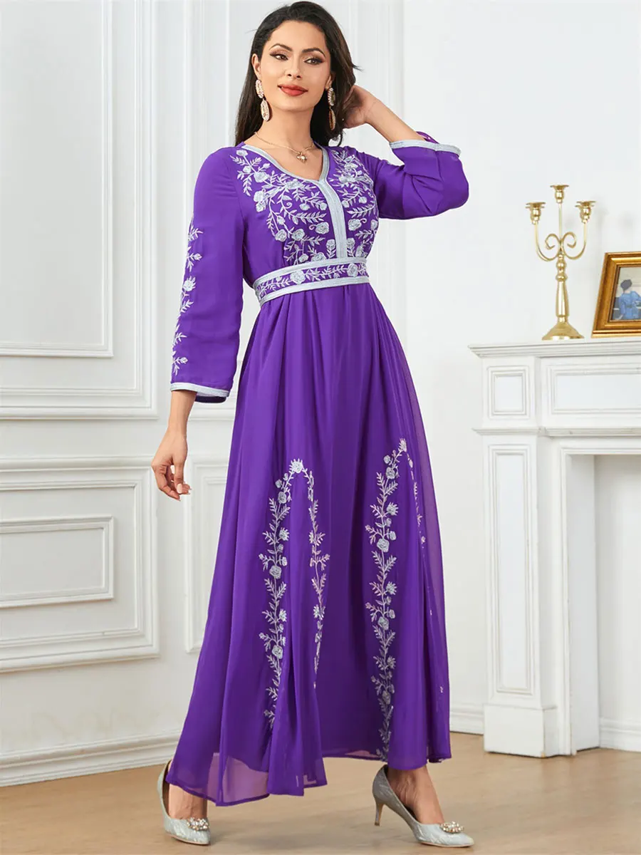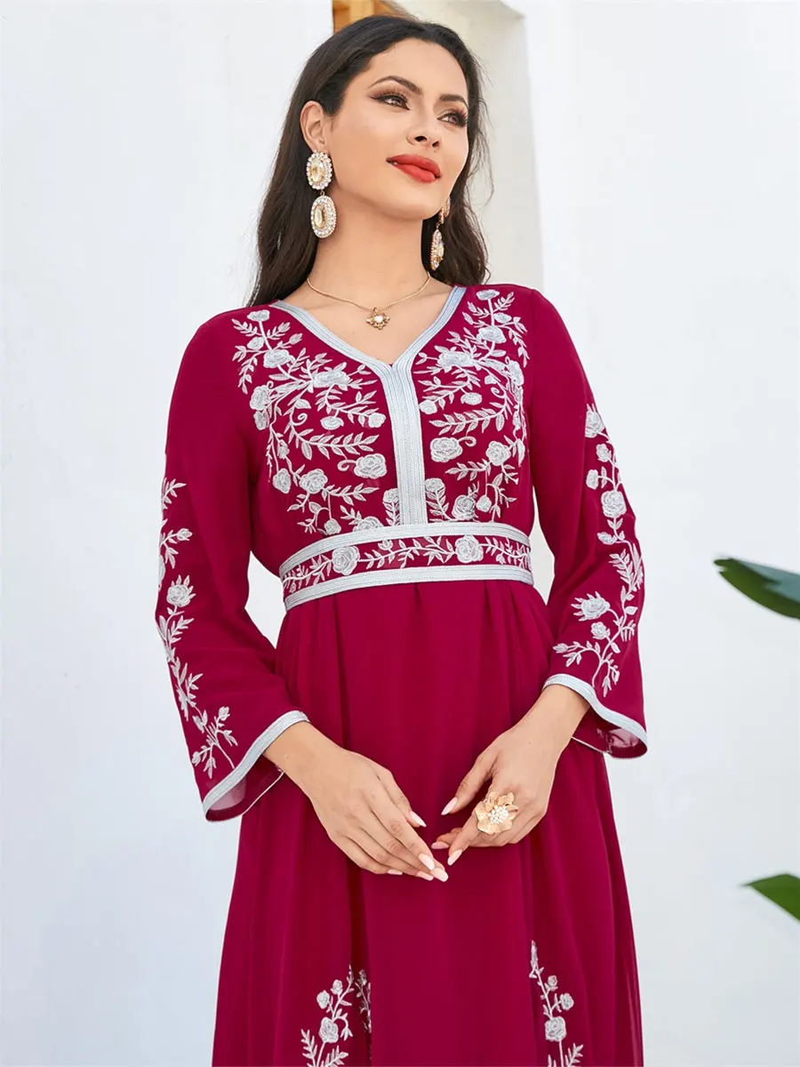 Siskakia Fashion Muslim Dubai Morocan Islamic Abayas V-Neck A-Line Neck Belted Kaftan Floral Embroidery Arabic Robe For Woman