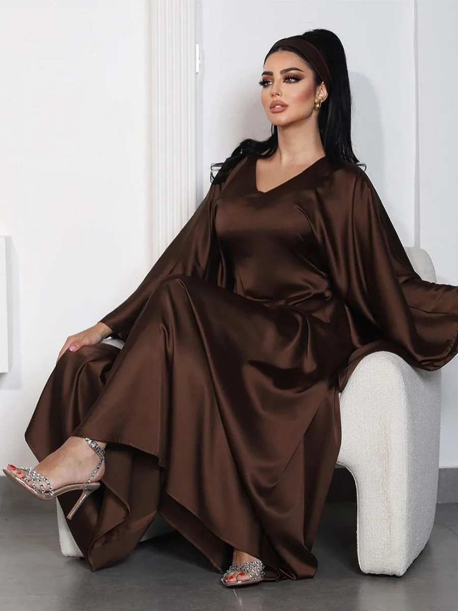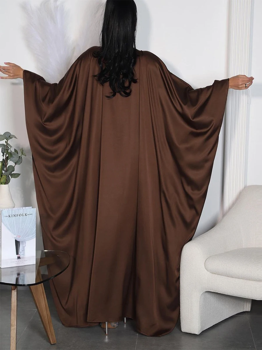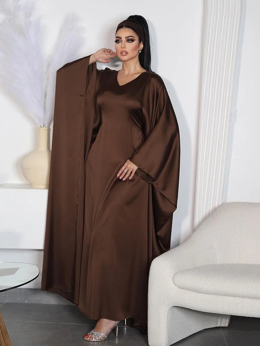 Siskakia Fashion Solid Open Abaya Long Sleeves V-Neck Satin Dress Elegant Casual Muslim Dubai Moroccan Kimono Clothing