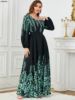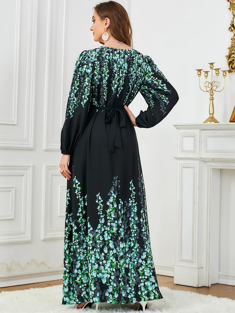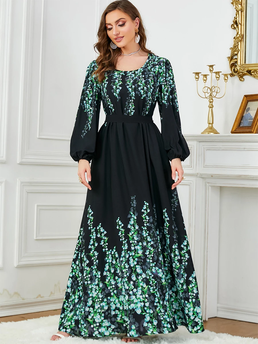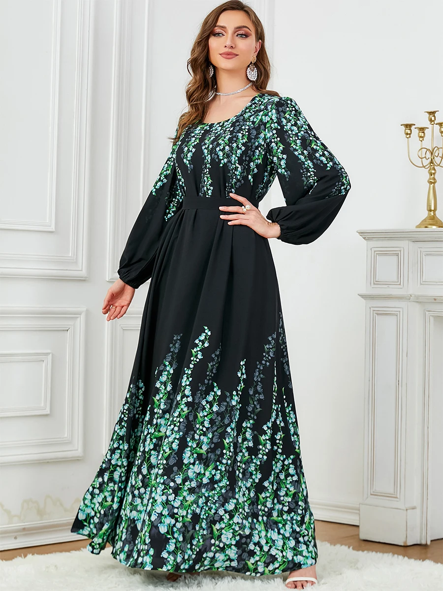 Siskakia Floral Print Muslim Dresses With Long Sleeves Crew-Neck Dubai Islam Turkey Arab Elegant Luxury Evening Clothing 2024
