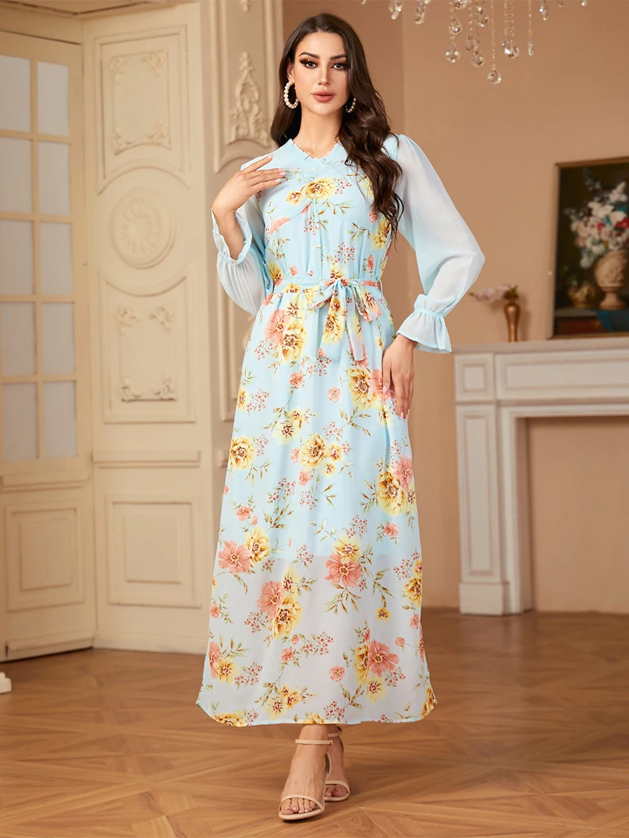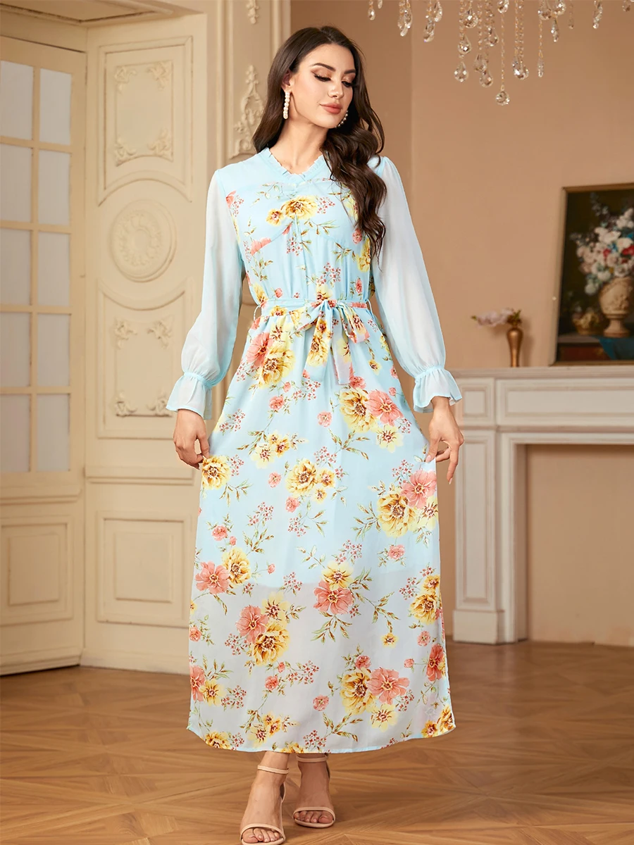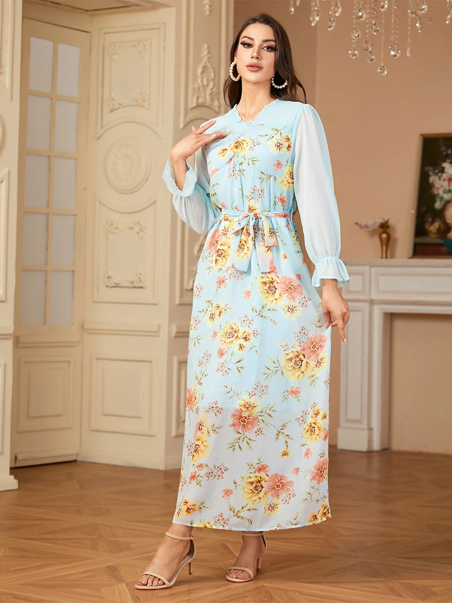 Siskakia Kaftan Abaya Dubai Floral Print Long Sleeve V-Neck Casual Loose Elegant Casual Dress with Belt Kaftan Islam Dress