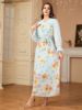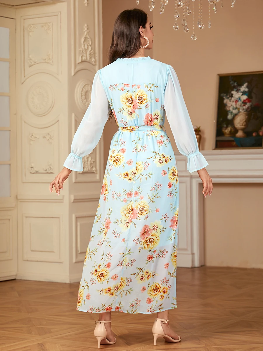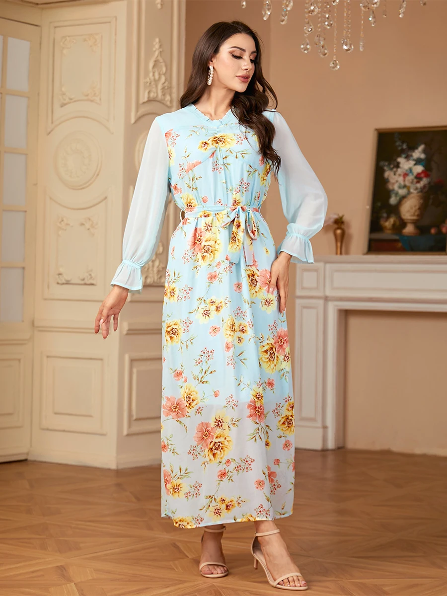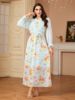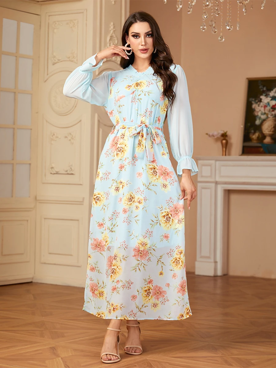 Siskakia Kaftan Abaya Dubai Floral Print Long Sleeve V-Neck Casual Loose Elegant Casual Dress with Belt Kaftan Islam Dress