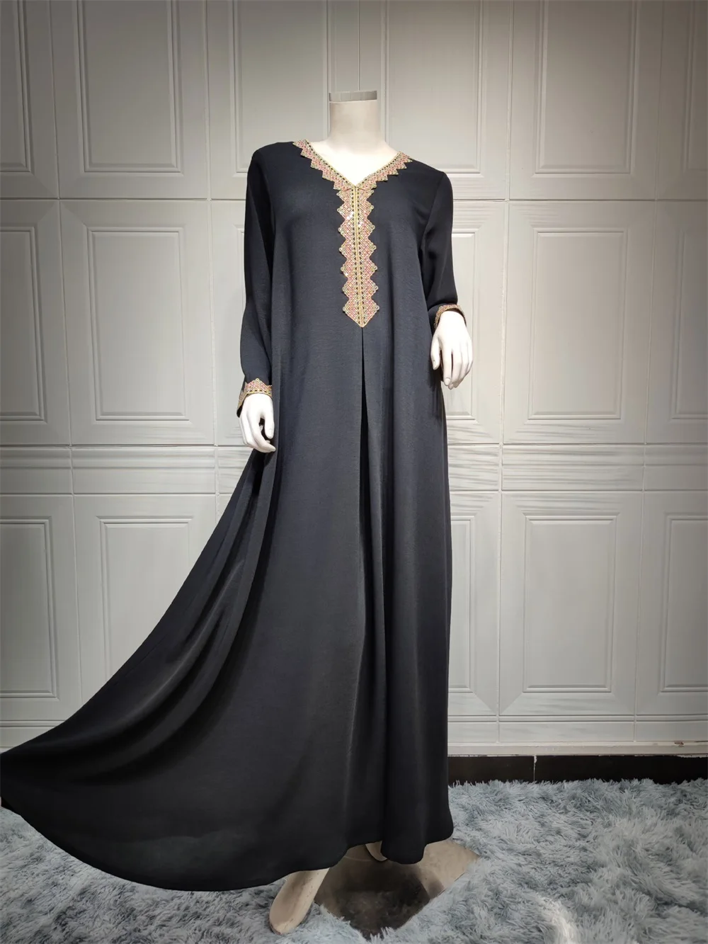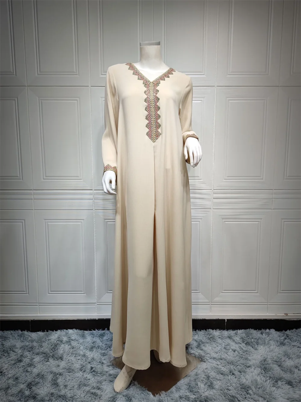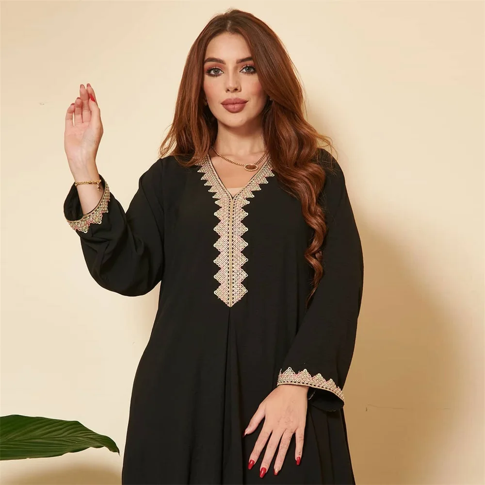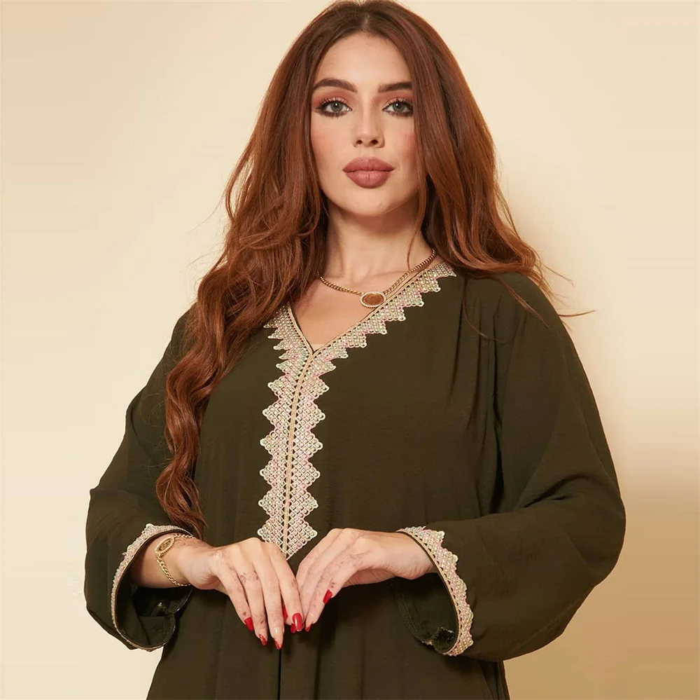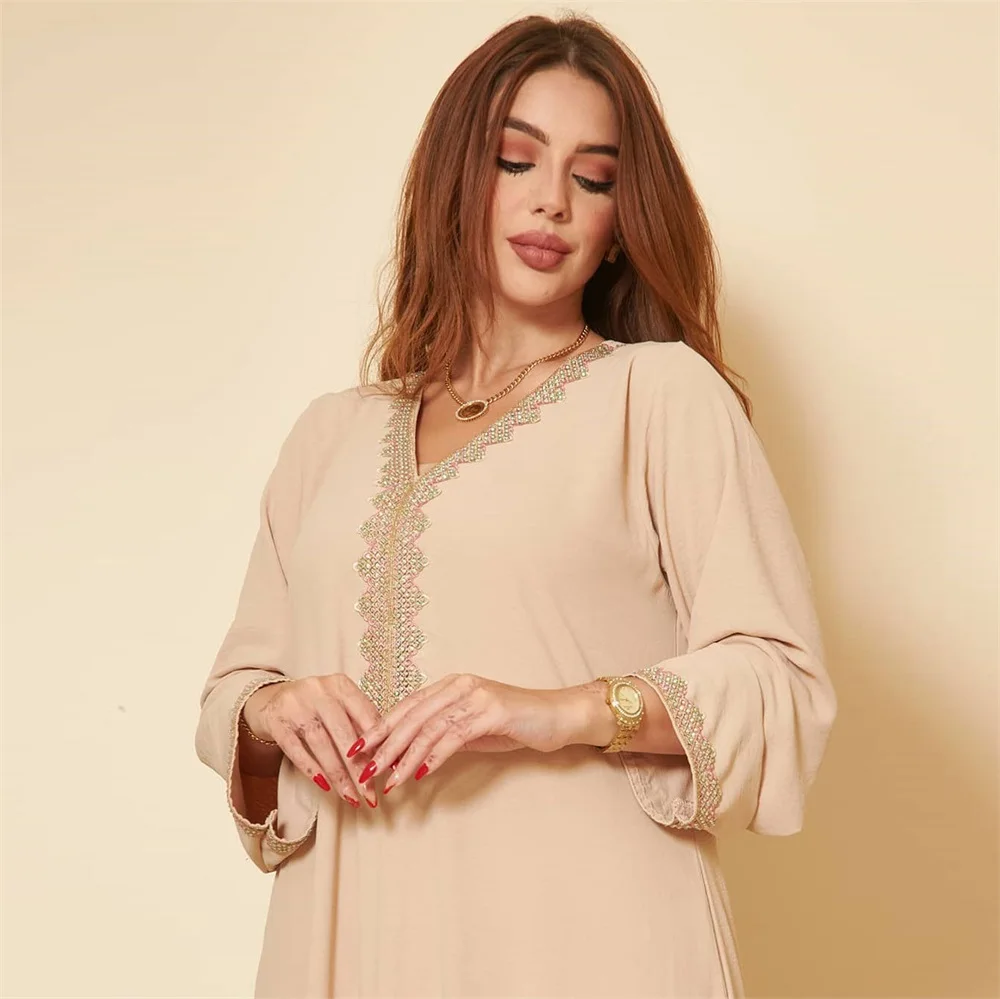 Siskakia Moroccan Women Jalabiyat Fashion Basic Solid Diamonds Full Sleeve V-Neck Elegant Chic Turkish Female Abaya