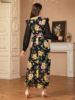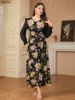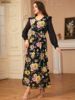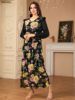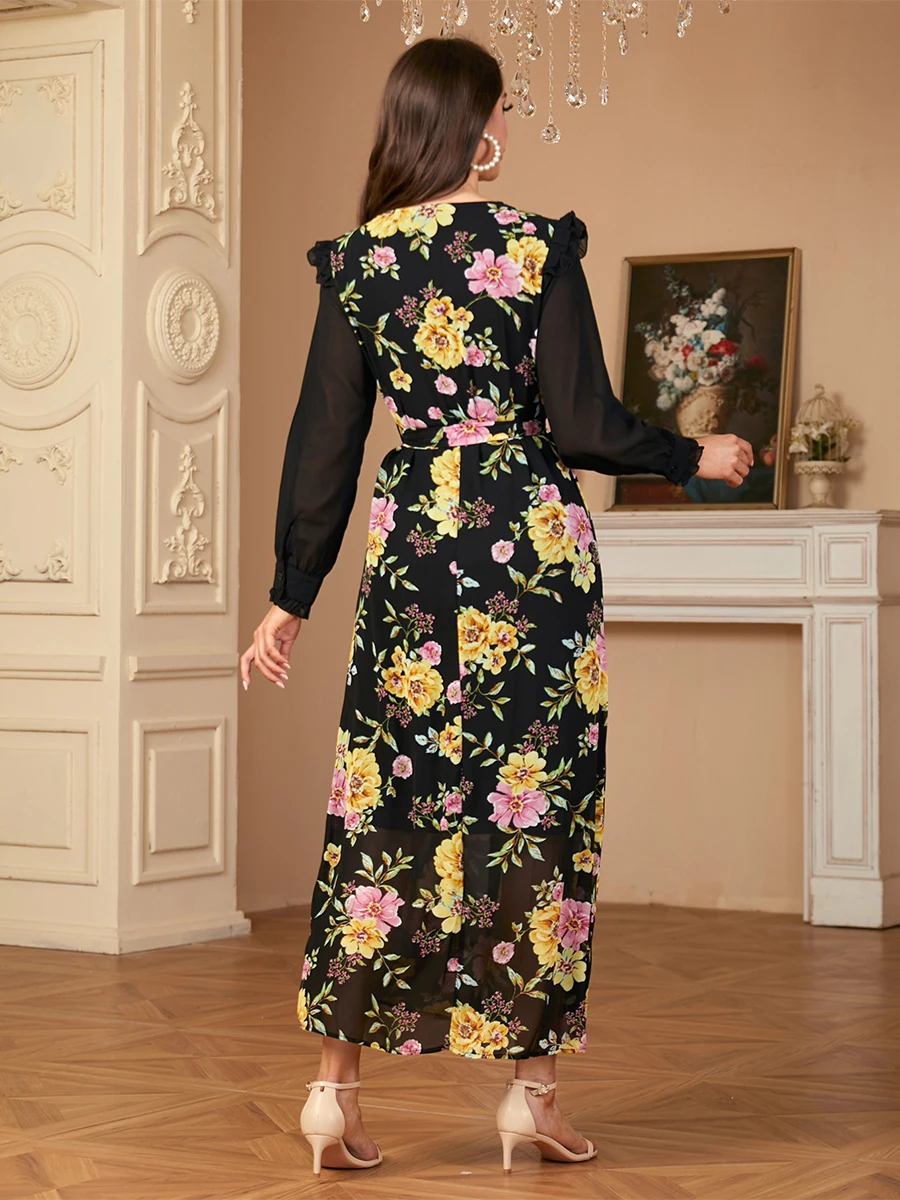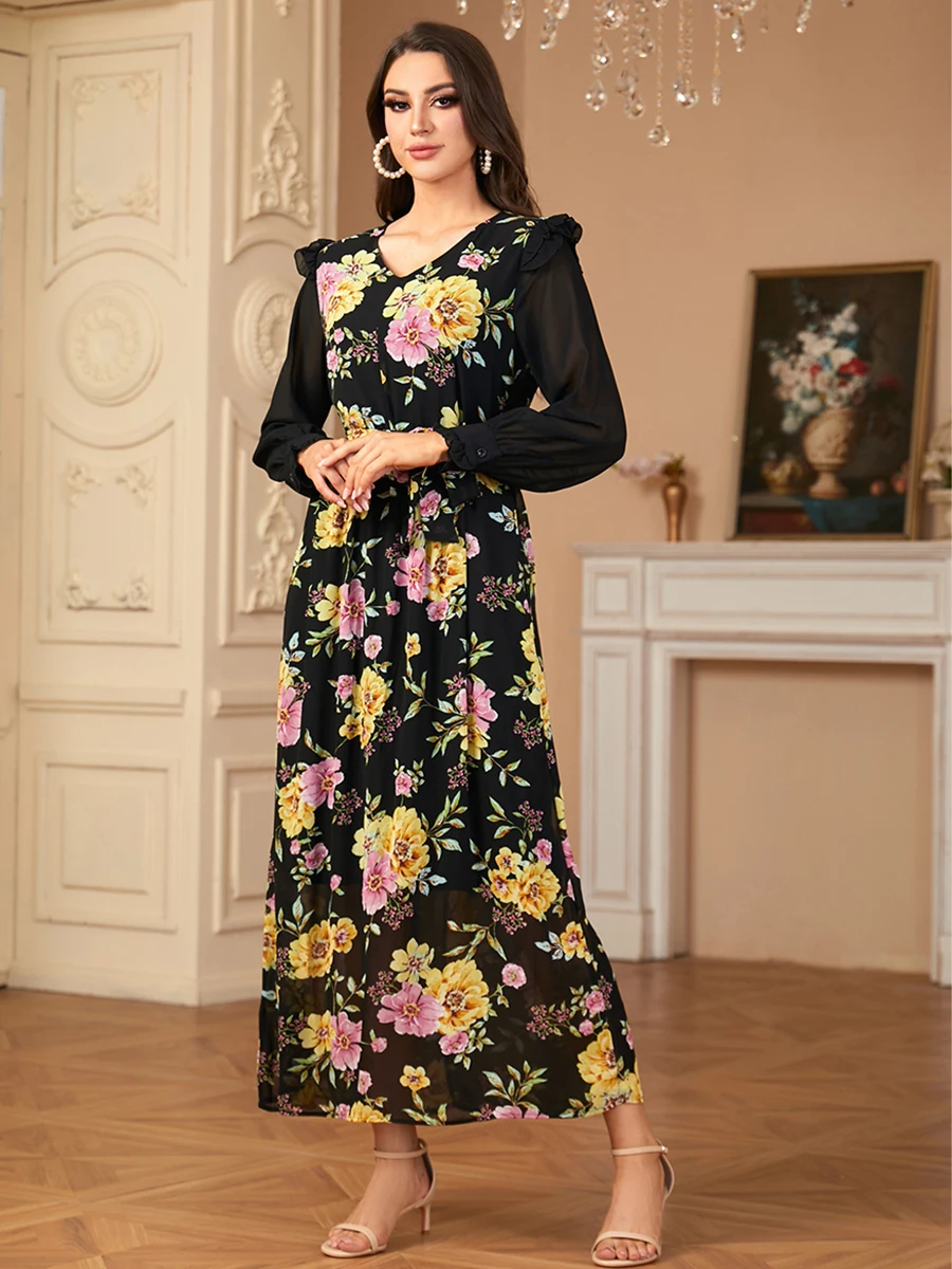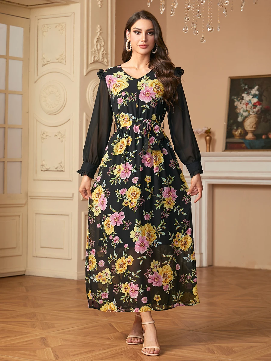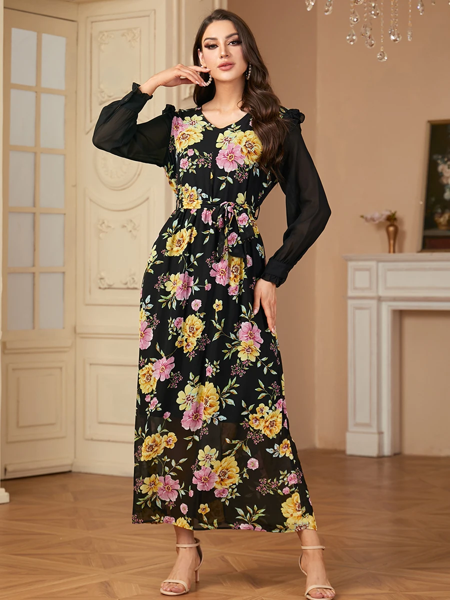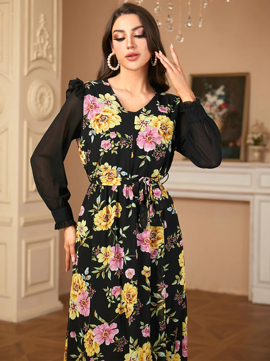 Siskakia Muslim Elegant Floral Print Patchwork Chiffon Fashionable Long Dress With Belt Dubai Casual Fashion Clothing For Women