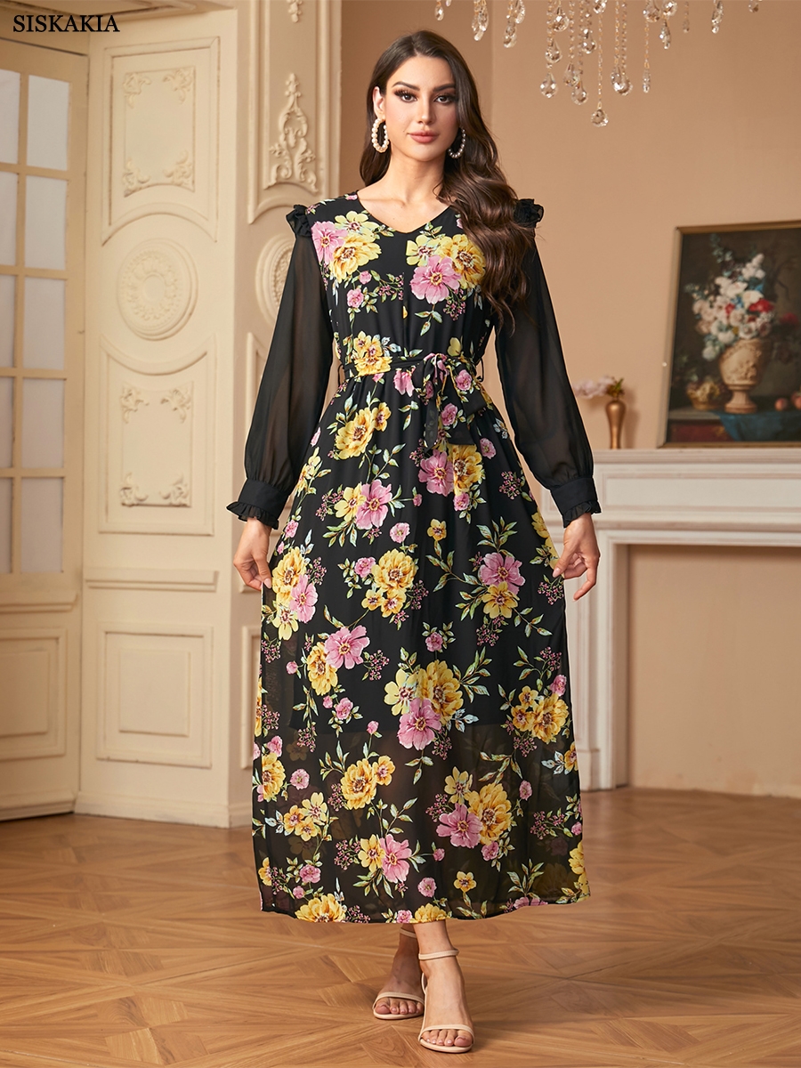 Siskakia Muslim Elegant Floral Print Patchwork Chiffon Fashionable Long Dress With Belt Dubai Casual Fashion Clothing For Women