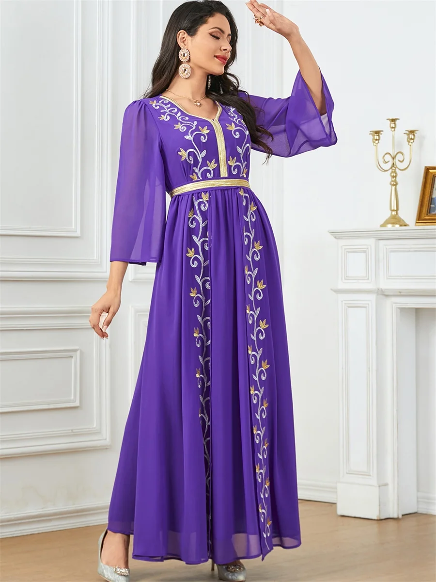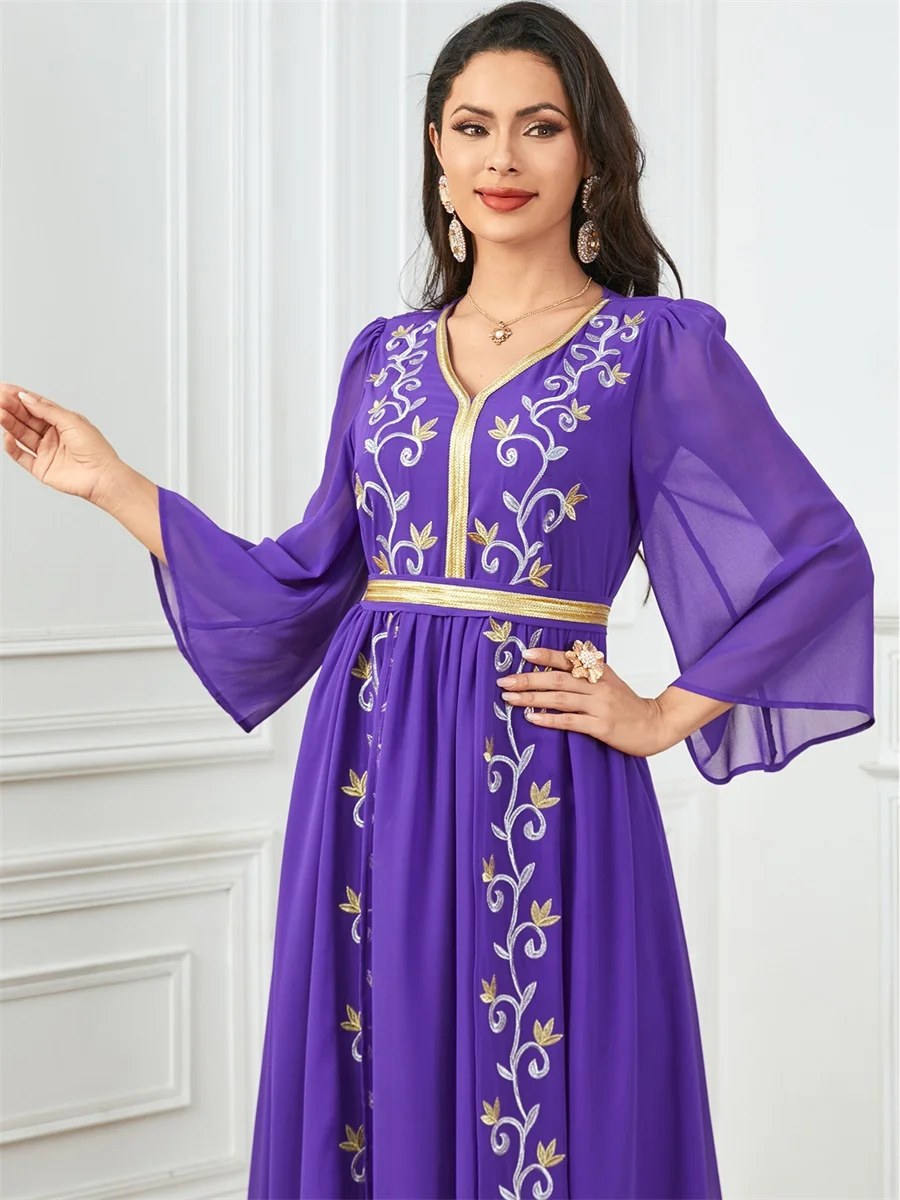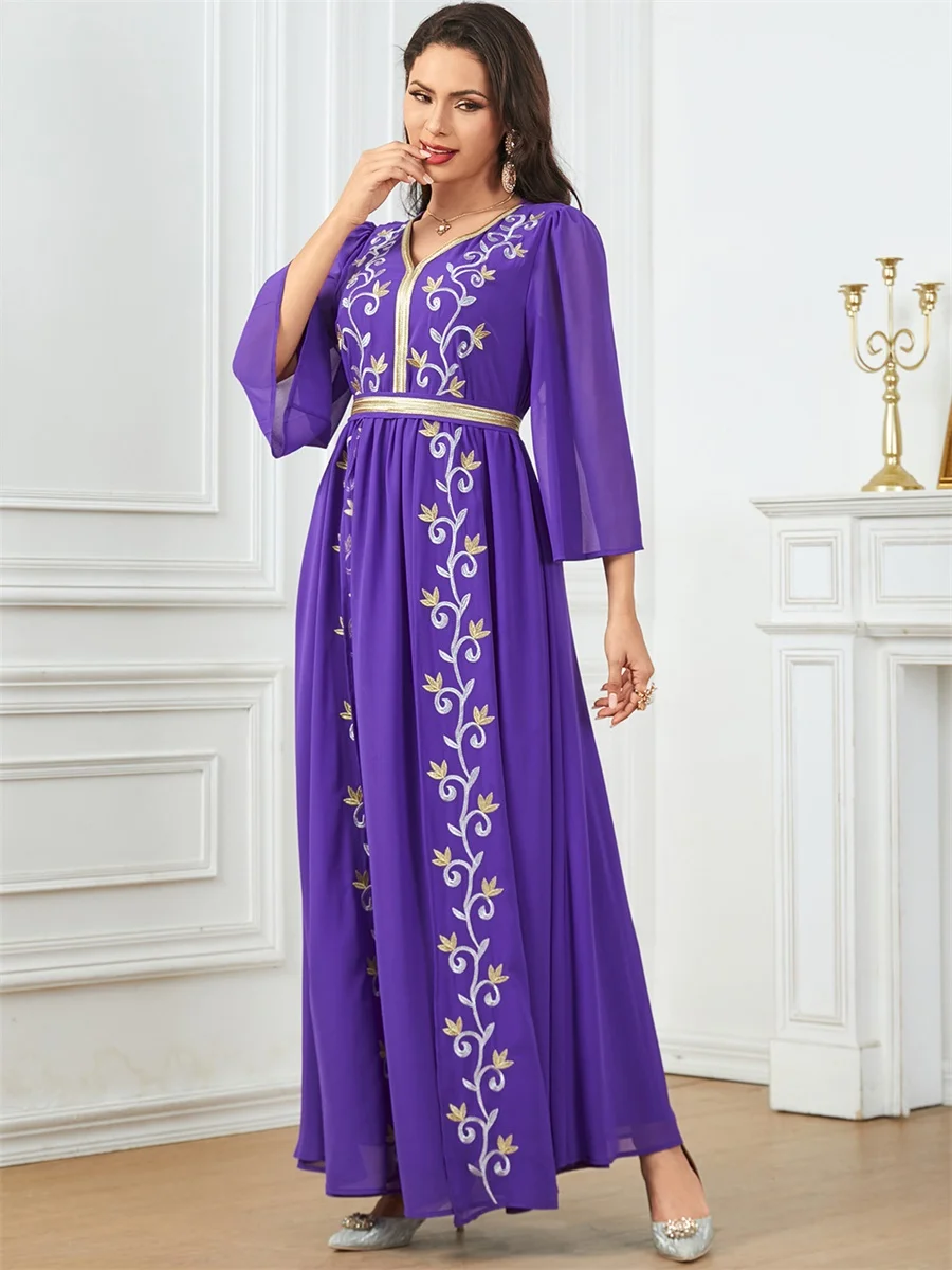 Siskakia Ramadan Muslim Women’s Embroidery Mesh Sleeve Abaya V-Neck Belt Included Maxi Dress Dubai Polyester Kaftan