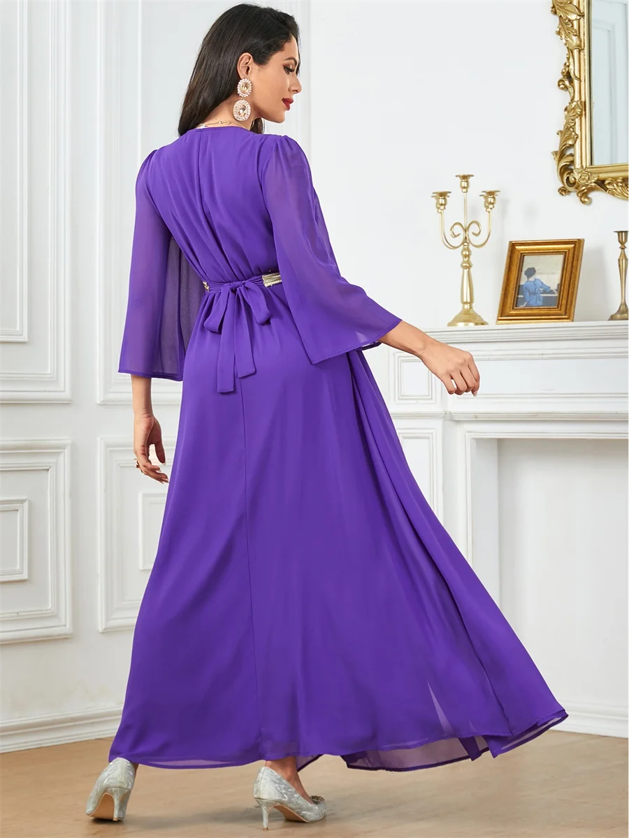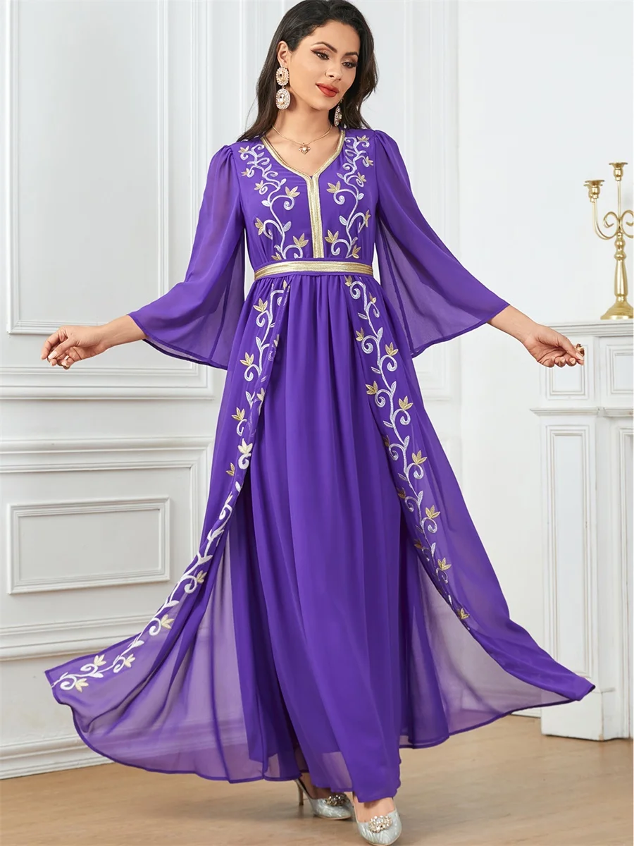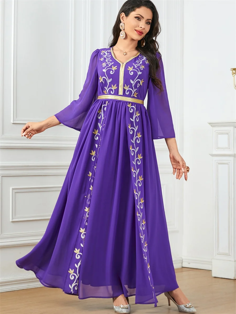 Siskakia Ramadan Muslim Women’s Embroidery Mesh Sleeve Abaya V-Neck Belt Included Maxi Dress Dubai Polyester Kaftan