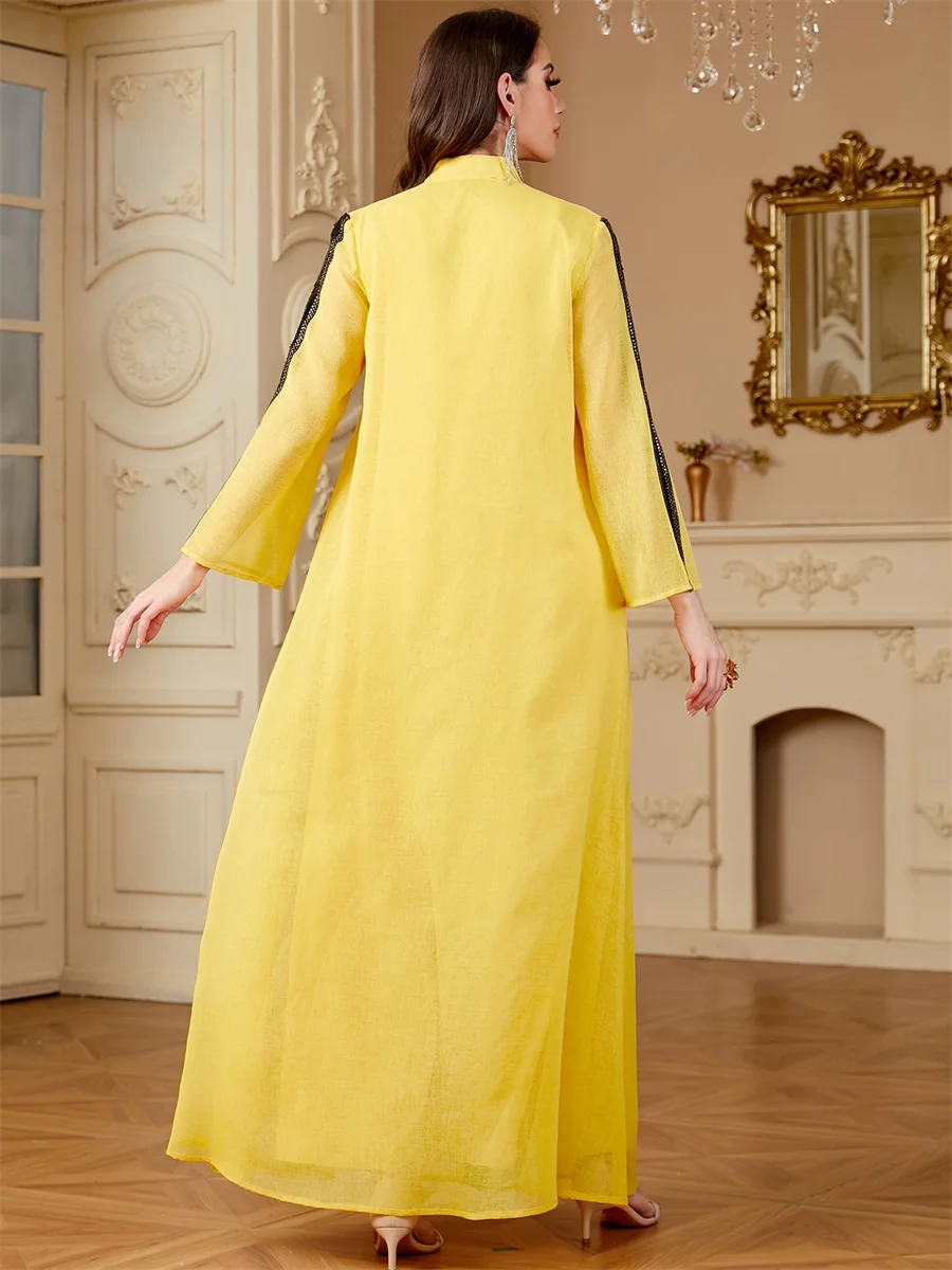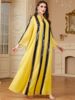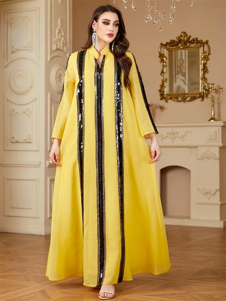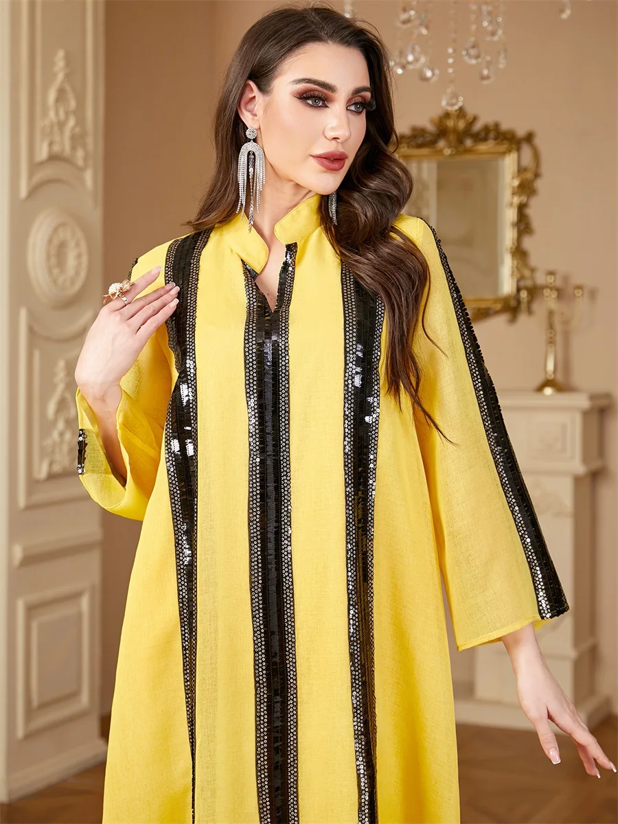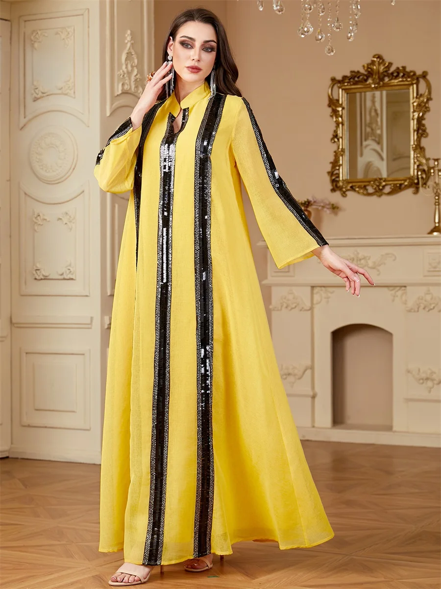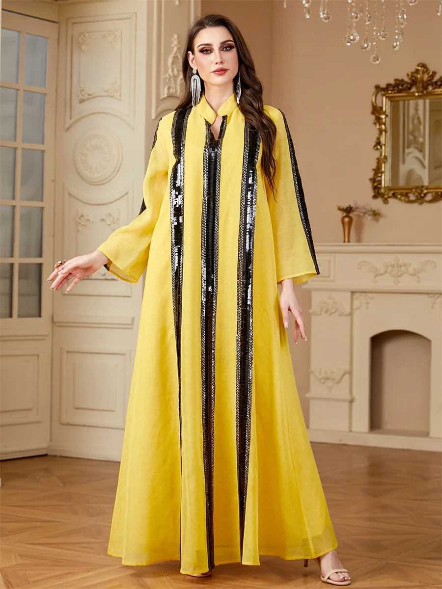 Siskakia Ramadan Muslim Women’s Sequins Patchwork Stripe abaya Mesh Sleeve Fashion Maxi Dress Elegant Casual Kaftan
