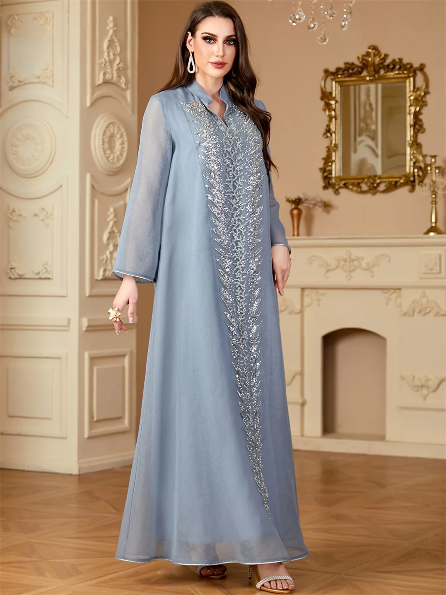 Siskakia Women’s Jalabiya Ramadan Dubai Sequins Mesh Long Dresses Modest Beading Patchwork Abaya Solid Kaftan
