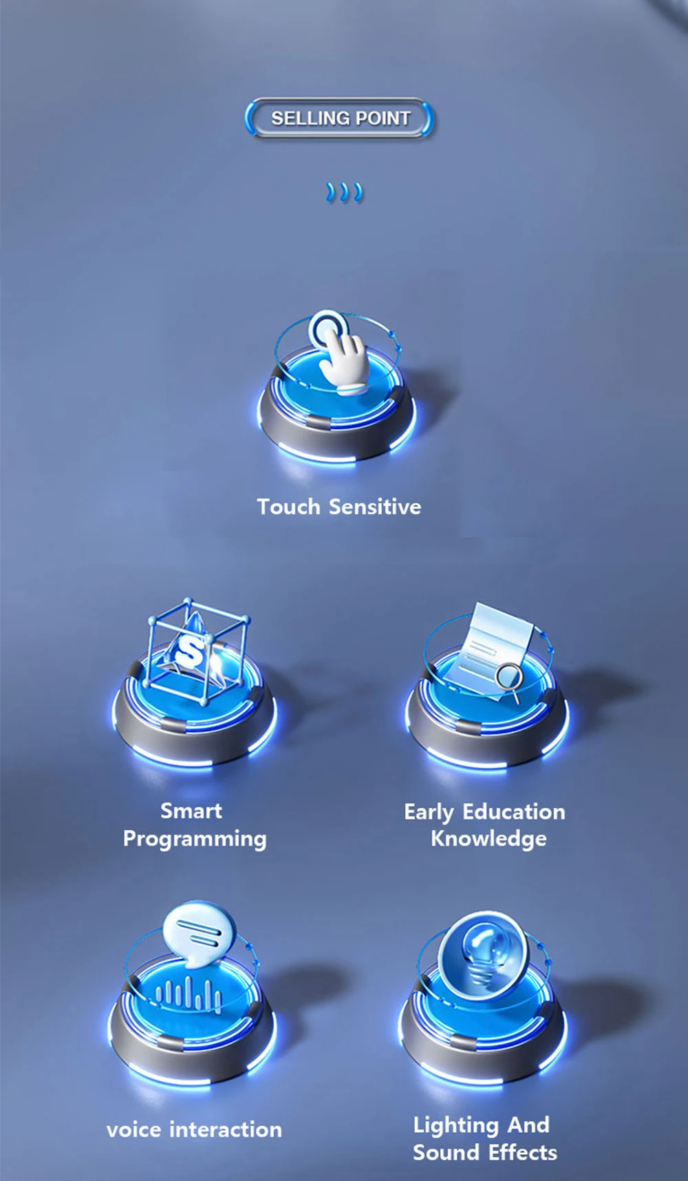 Touch Sensing, Voice Interaction, Lighting Effects, Recording Language, Singing And Dancing