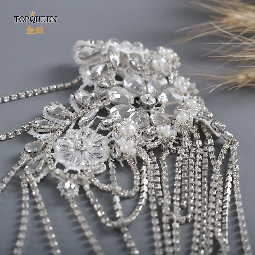 TOPQUEEN SG11 الزفاف الكتف سلسلة حجر الراين شرابة متعدد الطبقات قلادة كريستال مطرز الأبيض الزفاف يلتف الديكور اكسسوارات