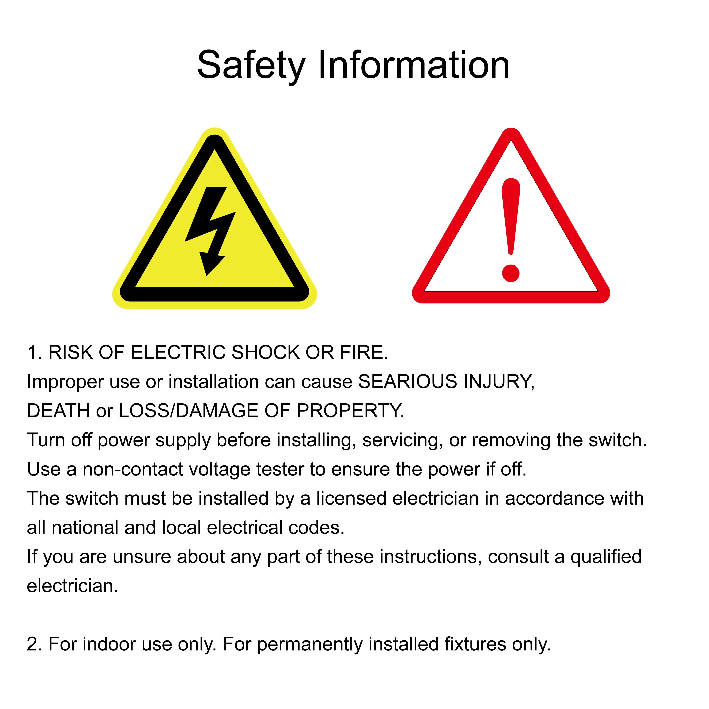1. خطر حدوث صدمة كهربائية أو حريق. الاستخدام غير السليم أو التركيب يمكن أن يسبب إصابة مرحة ، وفاة أو فقدان/تلف الممتلكات. إيقاف تشغيل مصدر الطاقة قبل تثبيت أو خدمة أو إزالة المفتاح. استخدام جهاز قياس الجهد الكهربائي غير الاتصال لضمان الطاقة في حالة إيقاف التشغيل. يجب تثبيت المفتاح من قبل كهربائي مرخص وفقا لجميع الرموز الكهربائية الوطنية والمحلية. إذا كنت غير متأكد من أي جزء من هذه التعليمات ، استشارة كهربائي مؤهل.