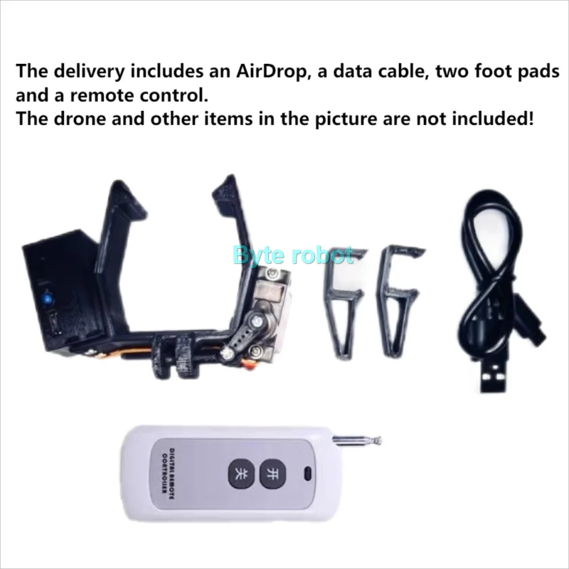 1. Please install the parachute delivery system and the elevation pad before takeoff, and control the drone’s parachute delivery by turning the parachute delivery system power and the remote control power on and off.
